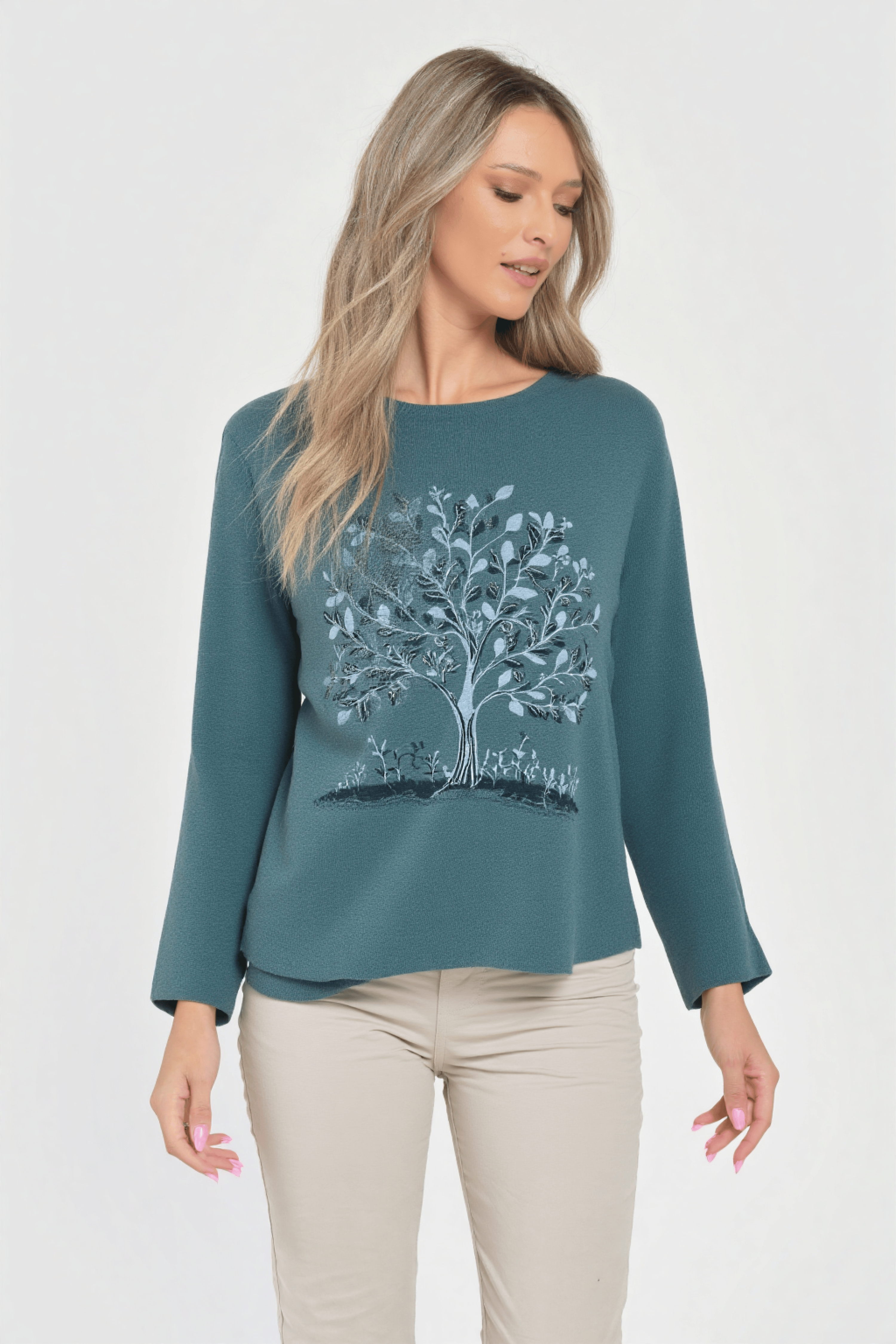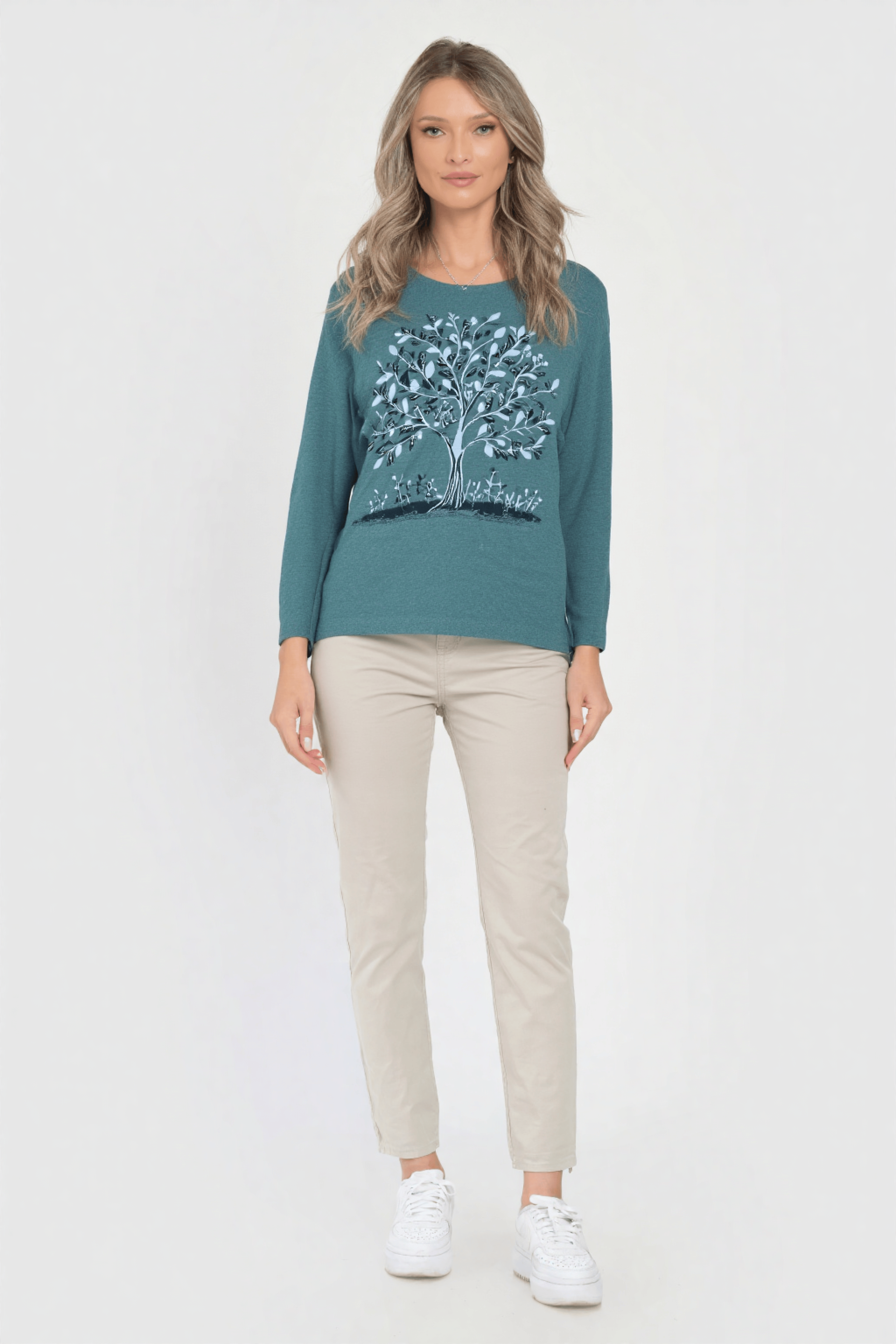 Un pulover elegant și modern, în nuanța rafinată de albastru-petrol, ce inspiră calm și echilibru. Imprimeul delicat în formă de arbore adaugă un accent artistic, transformând acest model într-o piesă versatilă, ușor de purtat atât la birou, cât și în timpul liber. Materialul moale oferă confort termic, iar croiala lejeră avantajează orice siluetă. Un pulover care combină armonios simplitatea cu rafinamentul.