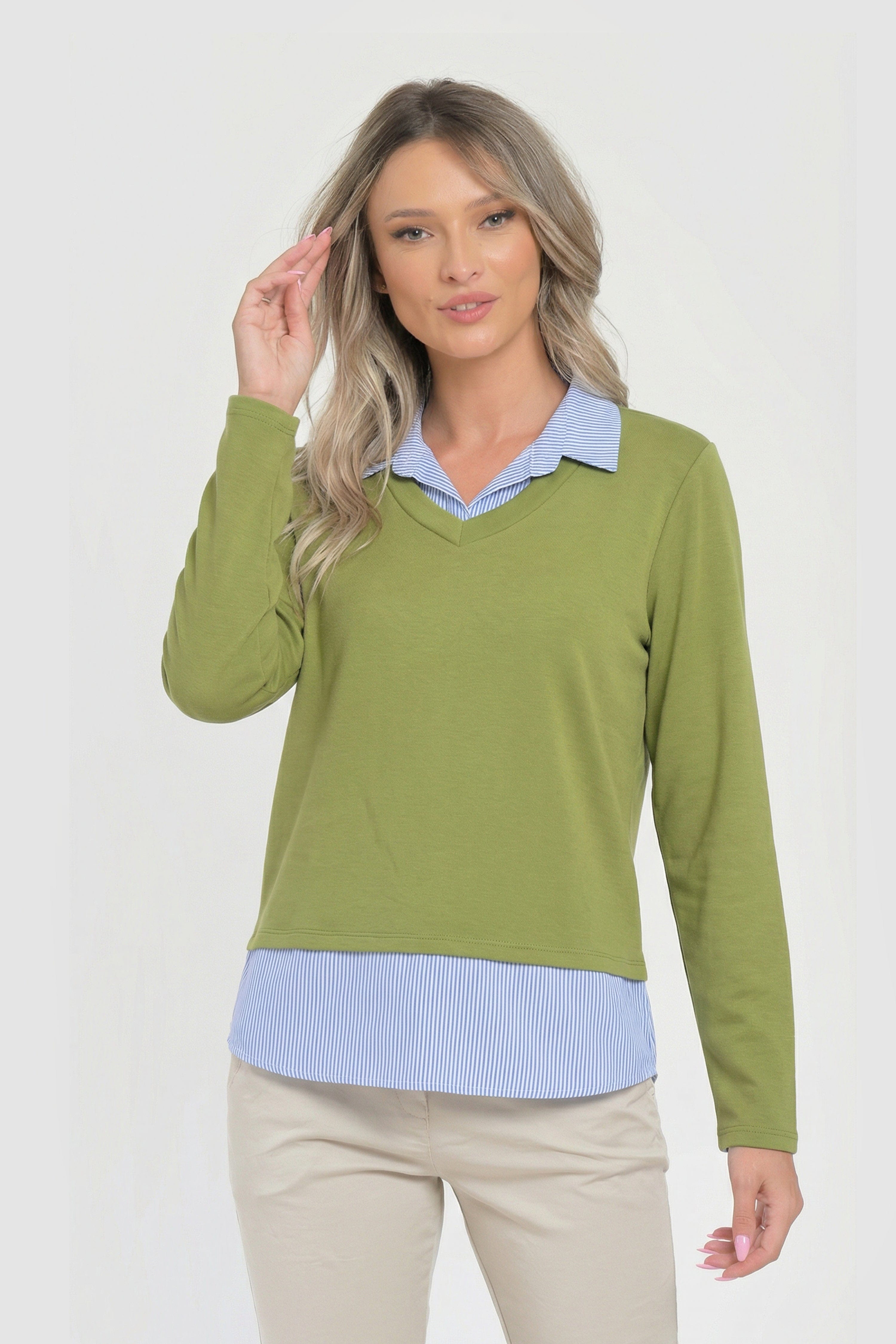 Bluza dama doi in unu verde Miranda și inserție albastră în dungi – o piesă versatilă, ideală pentru ținutele casual-chic de zi cu zi. Designul 2 în 1 creează efectul de layering modern, prin contrastul delicat dintre bluza verde olive și inserția din material tip cămașă, în dungi fine alb-albăstrui.
