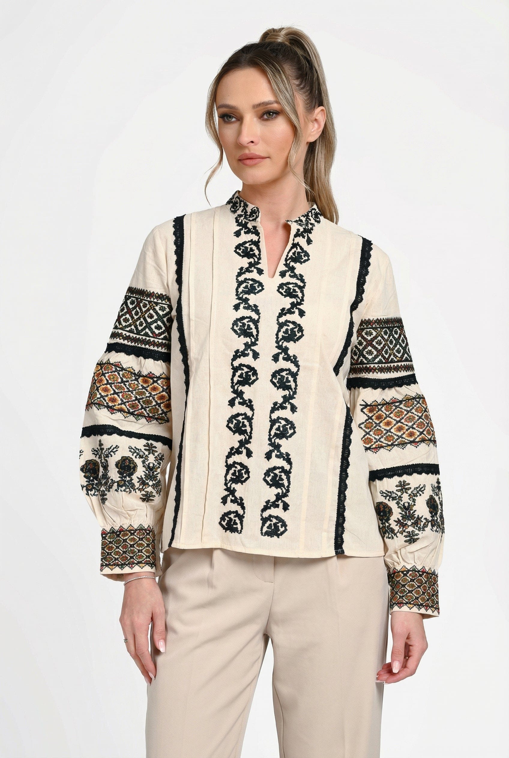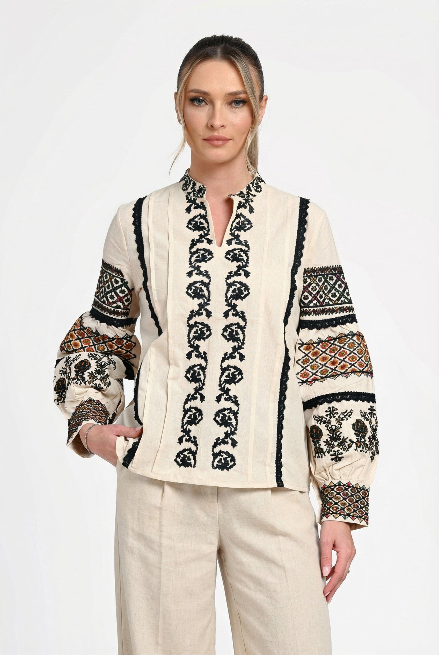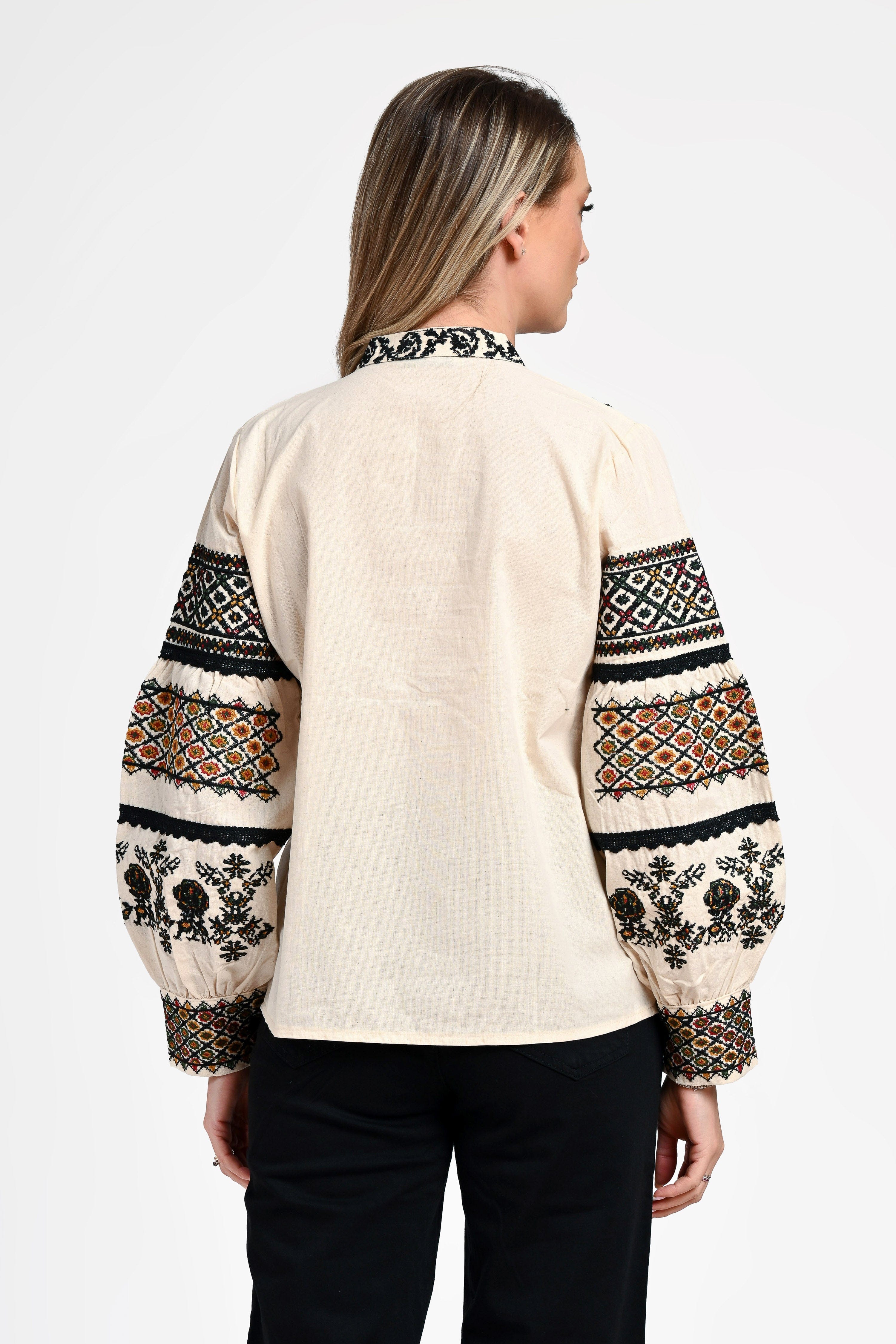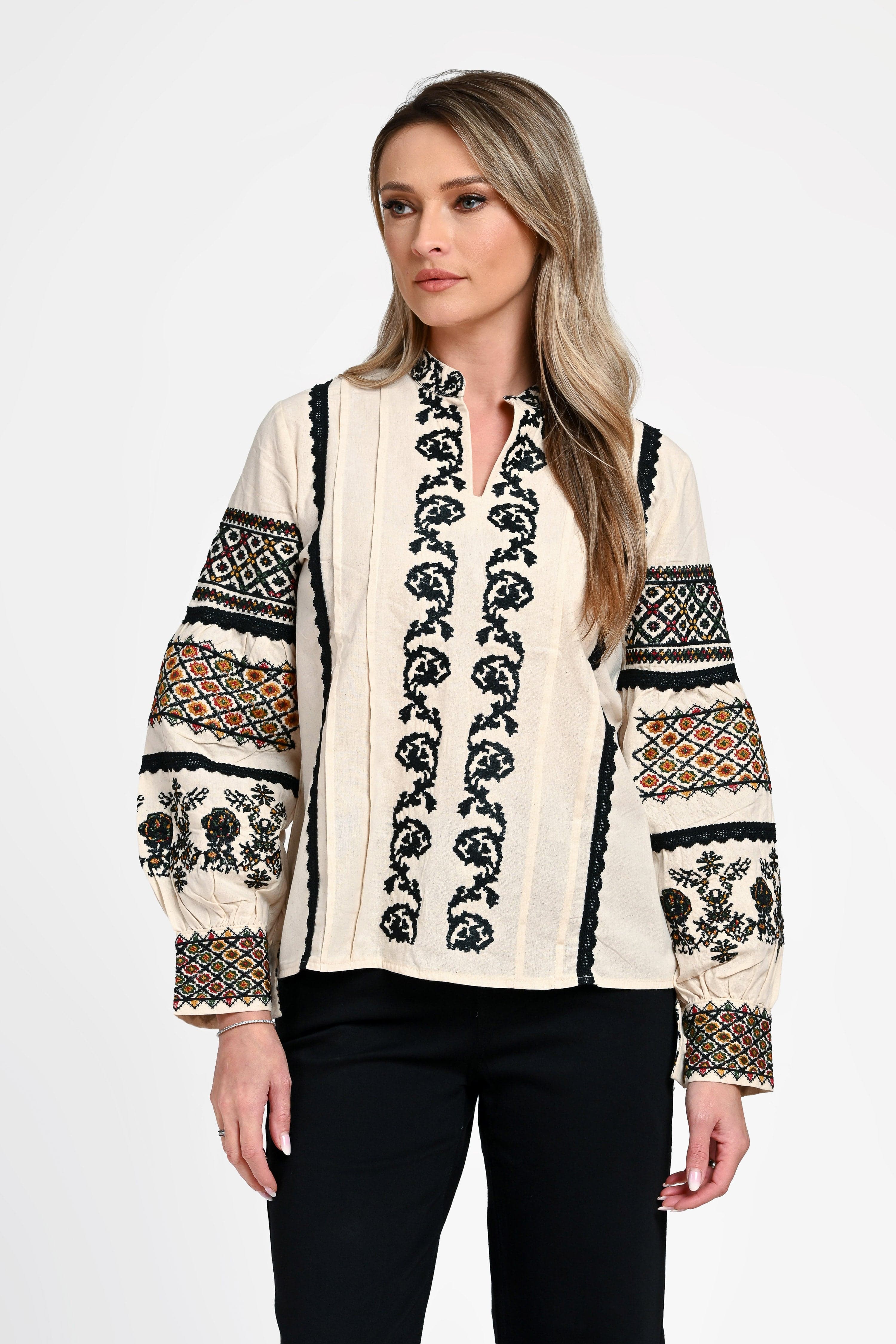 Ia Elena Ethno îmbină eleganța contemporană cu frumusețea motivelor tradiționale românești, fiind o piesă statement ce nu se demodează niciodată. Realizată într-o nuanță delicată de crem, această bluză evidențiază broderiile bogate, în tonuri contrastante de negru și accente colorate.