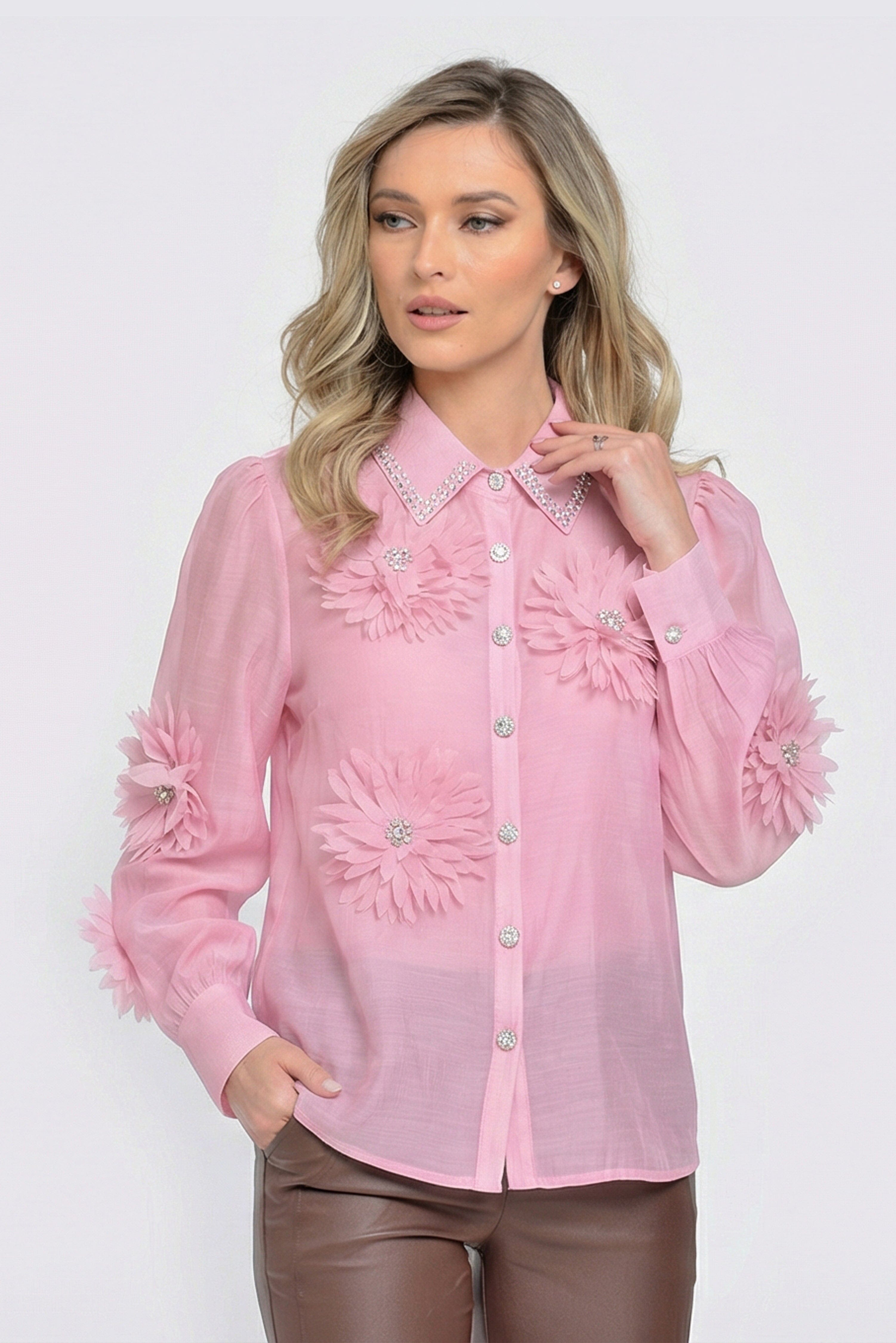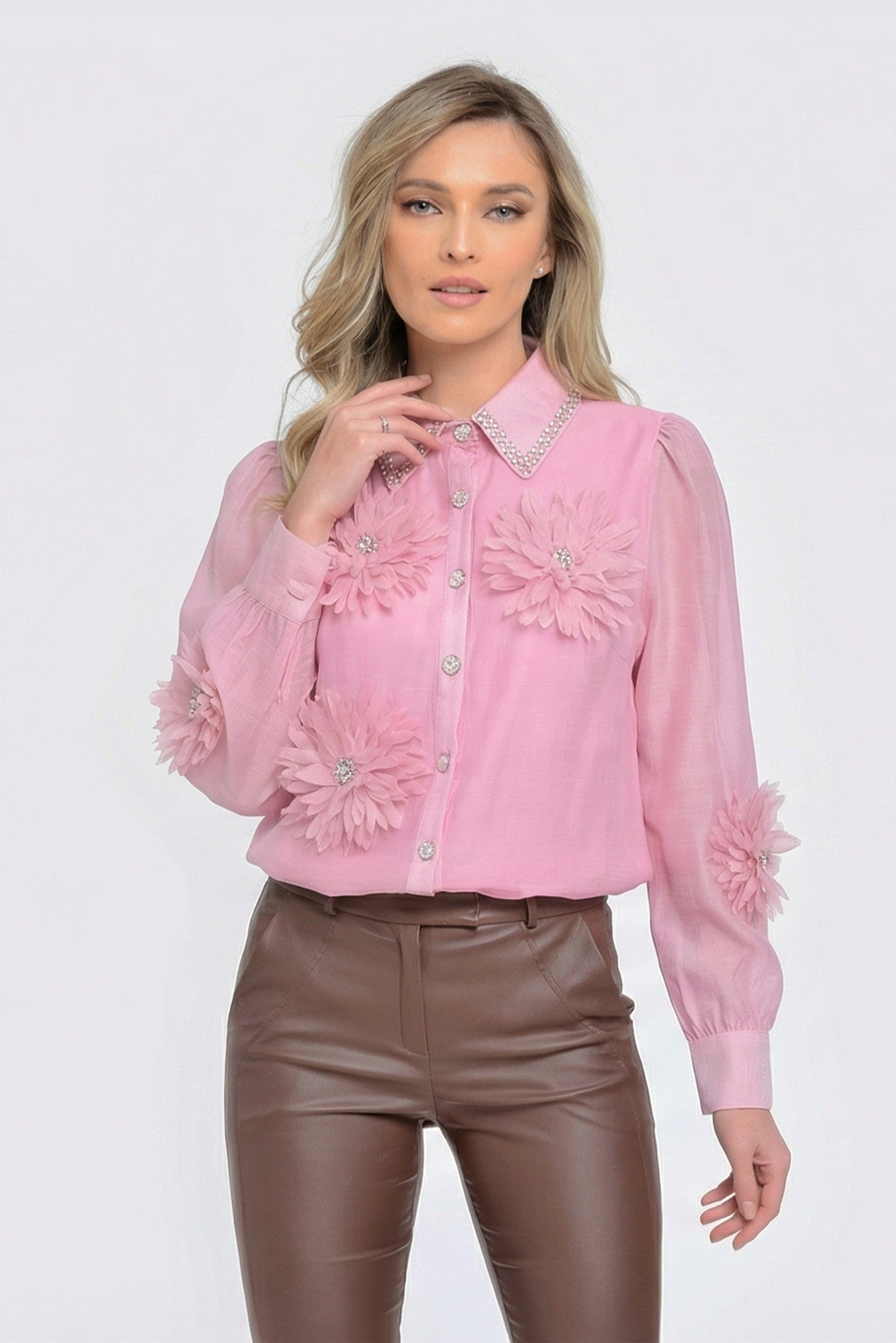 Bluză damă roz cu aplicații florale 3D și nasturi decorativi
