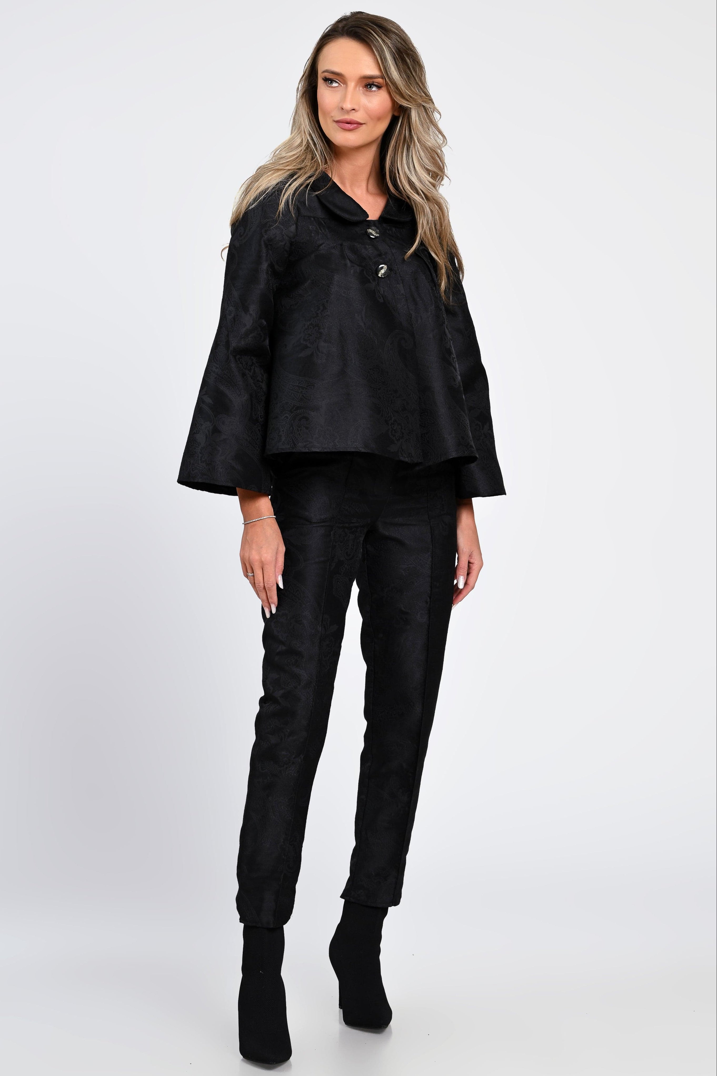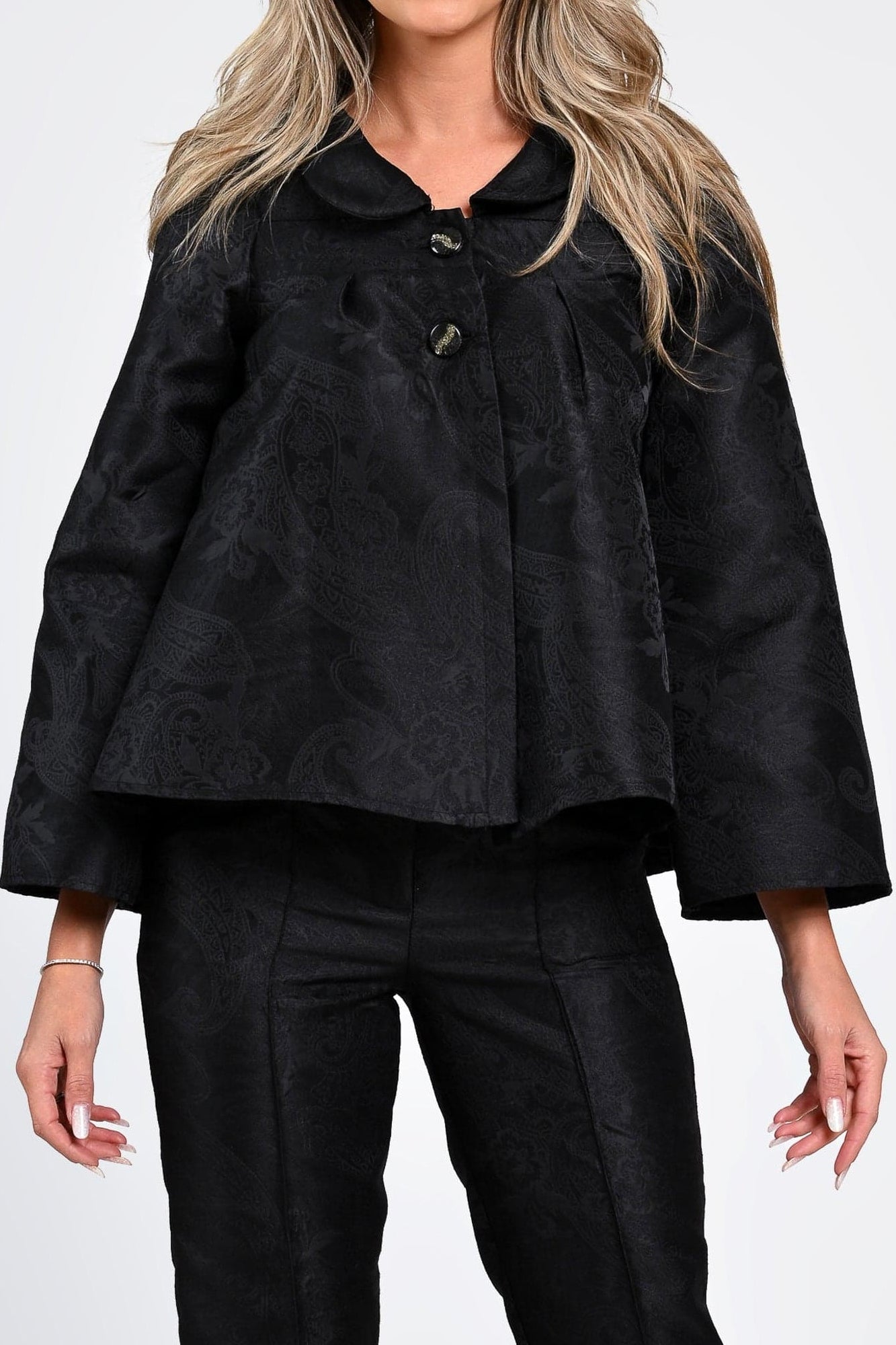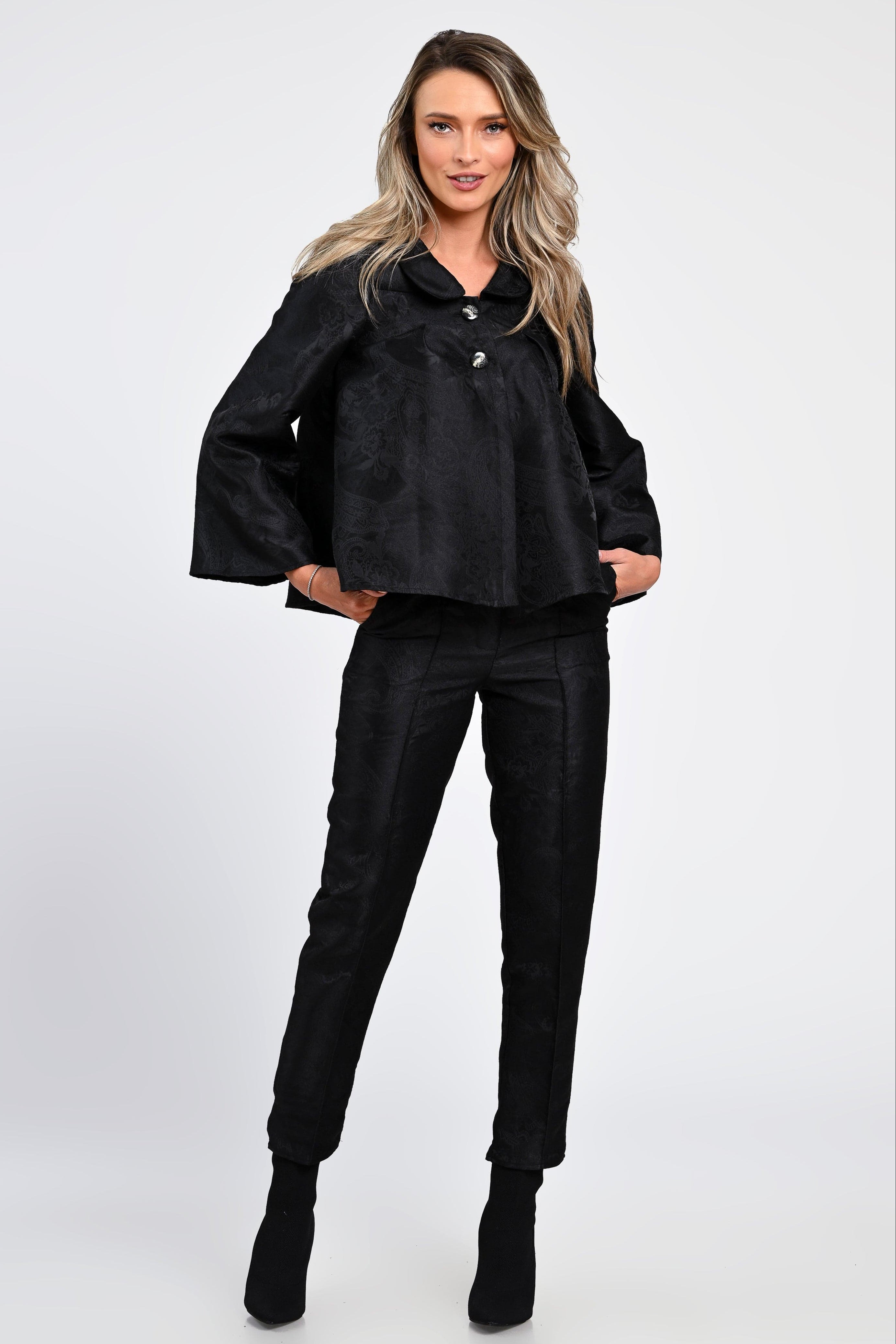 Un compleu sofisticat, ideal pentru femeile care apreciază eleganța clasică reinterpretată modern. Realizat dintr-un material texturat cu model discret, setul include o jachetă amplă, cu mâneci largi și nasturi decorativi, alături de pantaloni cu croială dreaptă și talie confortabilă. Designul rafinat și detaliile atent lucrate oferă o apariție elegantă, perfectă pentru evenimente, birou sau ocazii speciale.