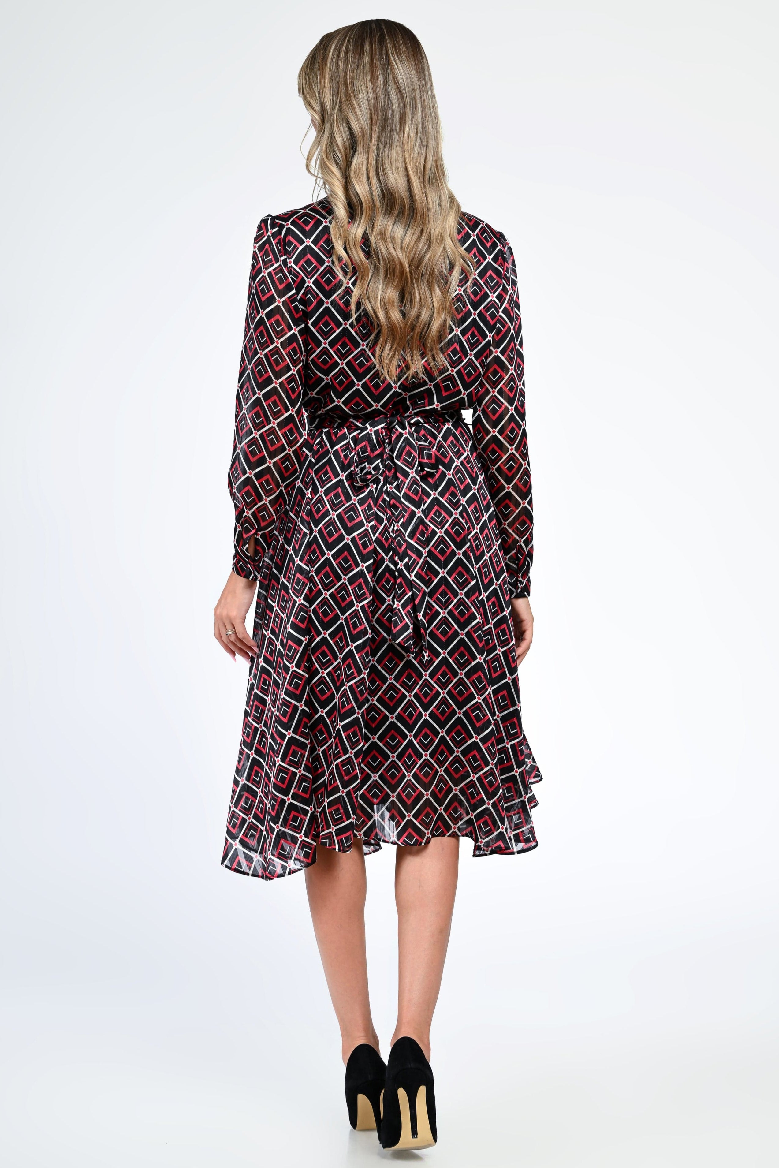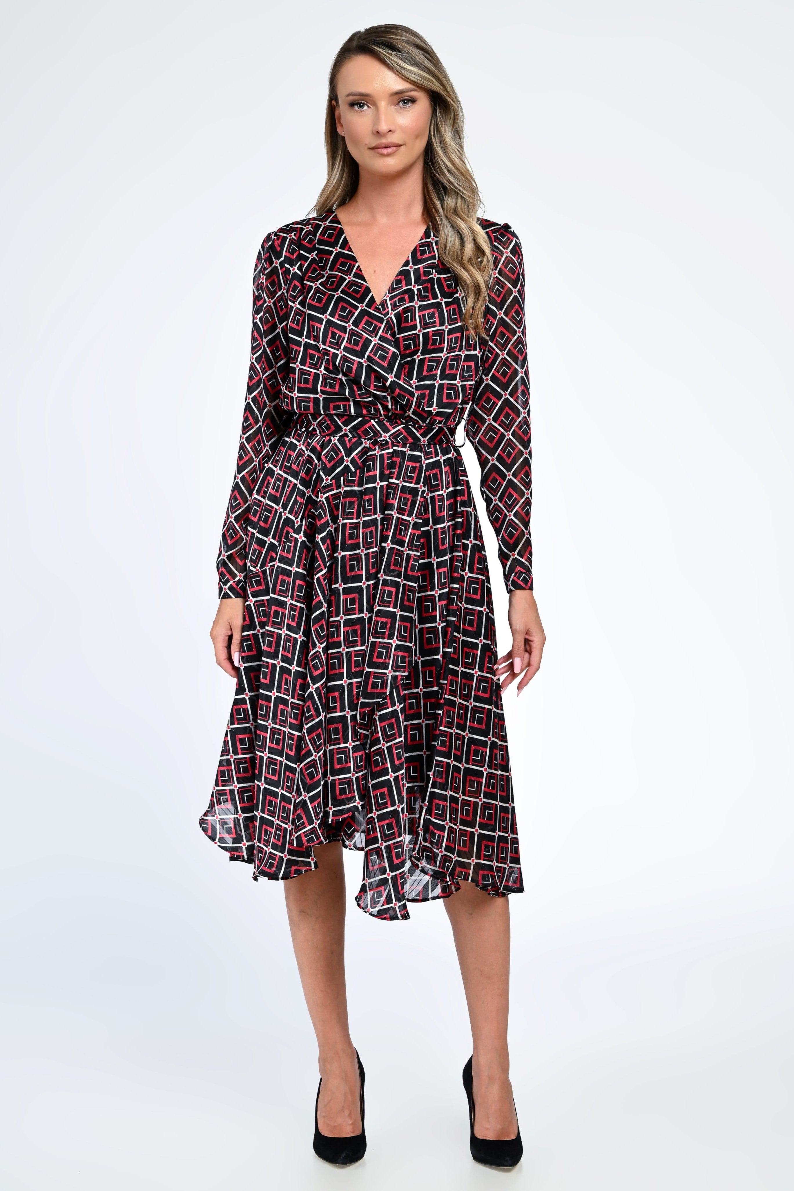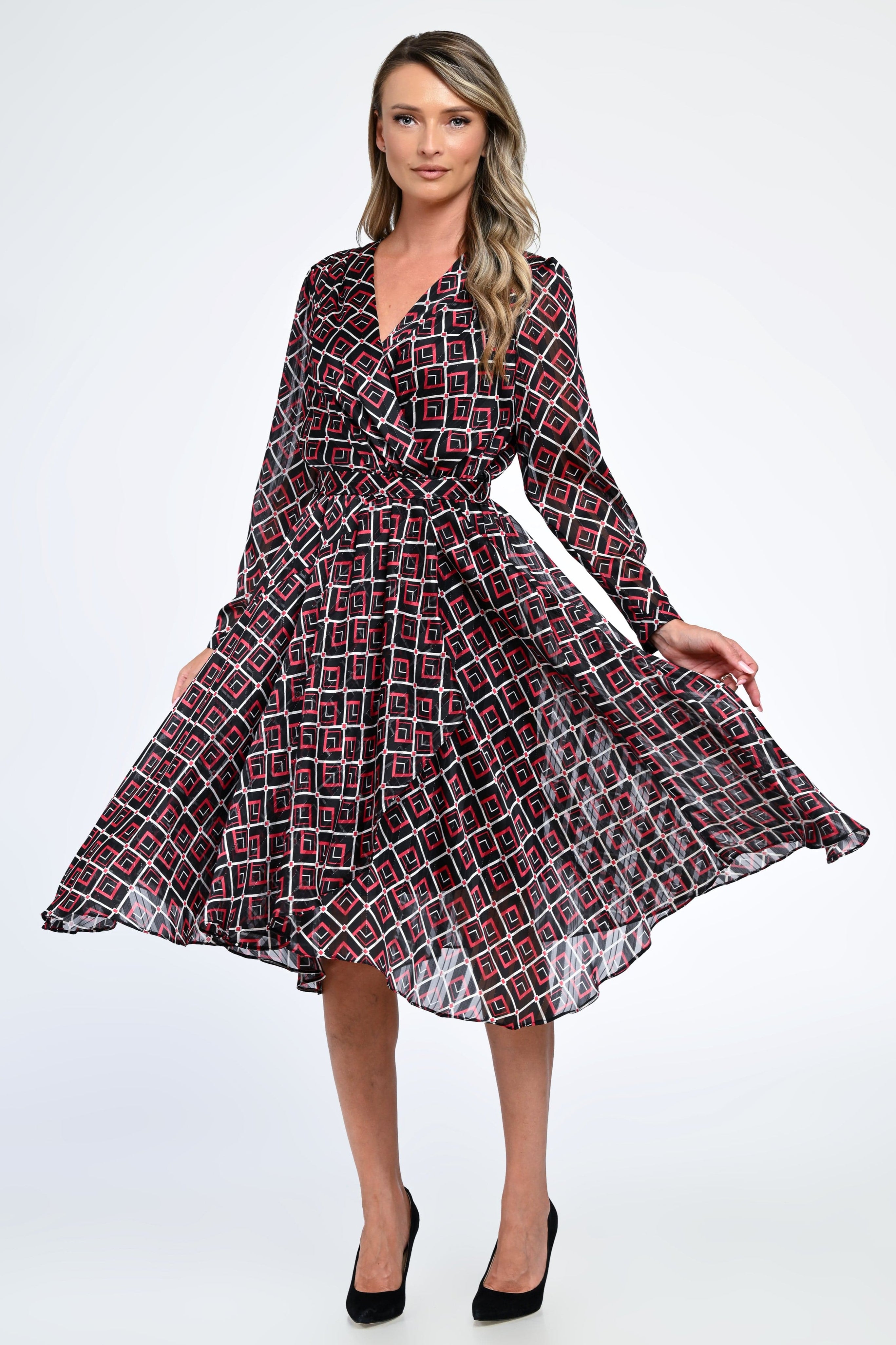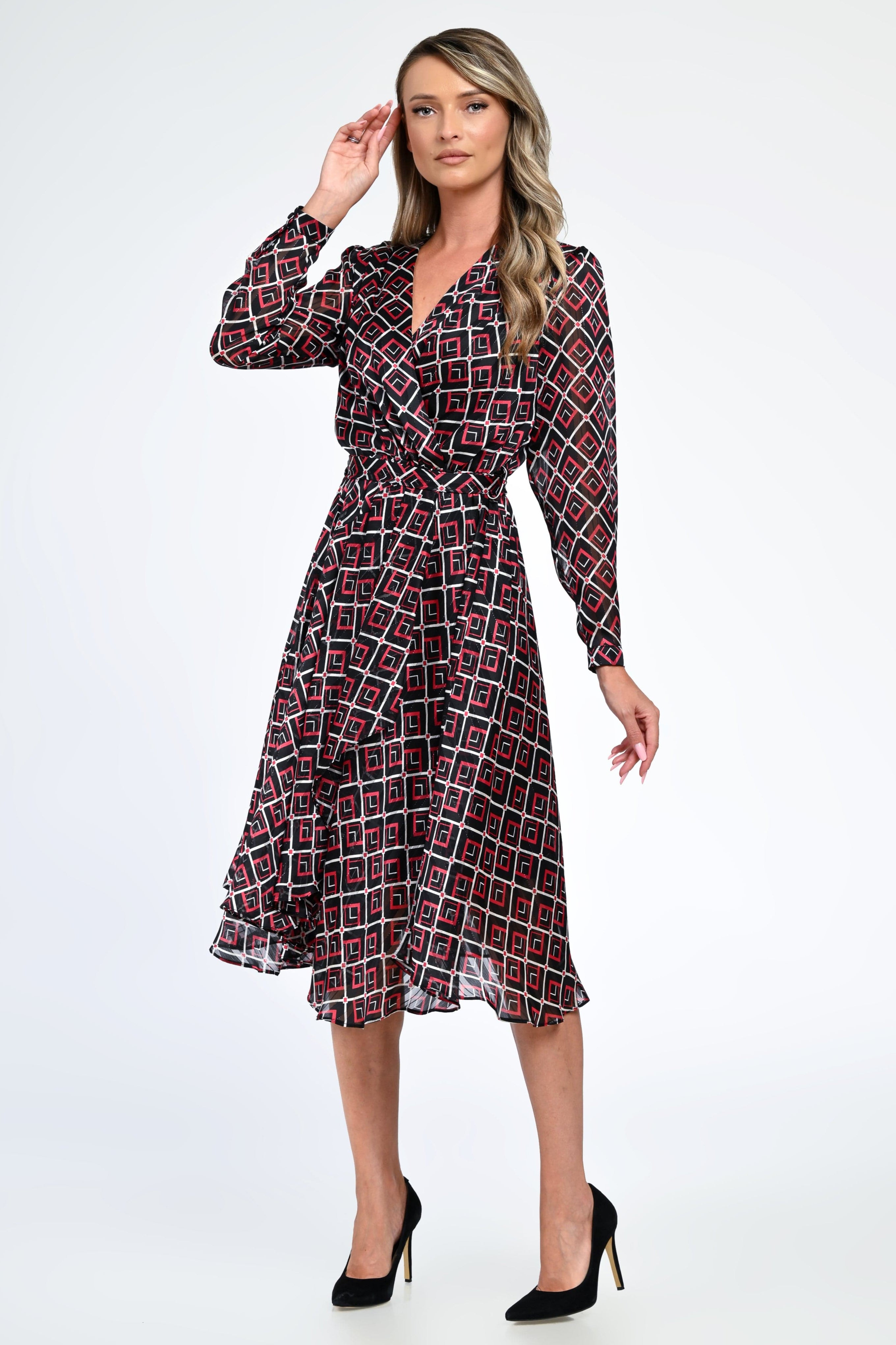 Rochia damă geometrică Roxana este o piesă modernă și elegantă, ideală pentru femeile care iubesc să îmbine confortul cu un design de impact. Realizată dintr-un material ușor și fluid, această rochie midi atrage prin imprimeul geometric în nuanțe de roșu, alb și negru, care creează un efect vizual sofisticat și dinamic.