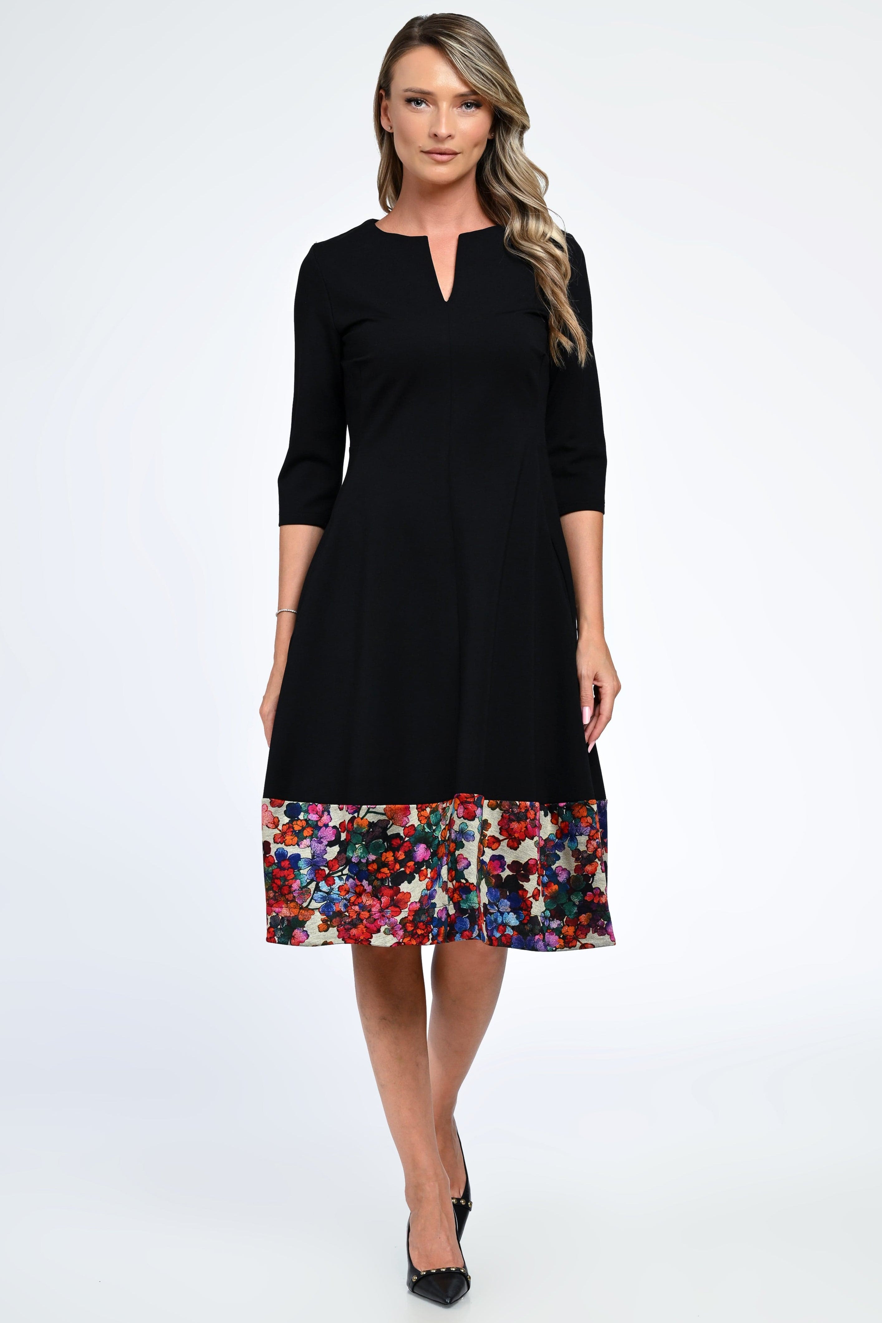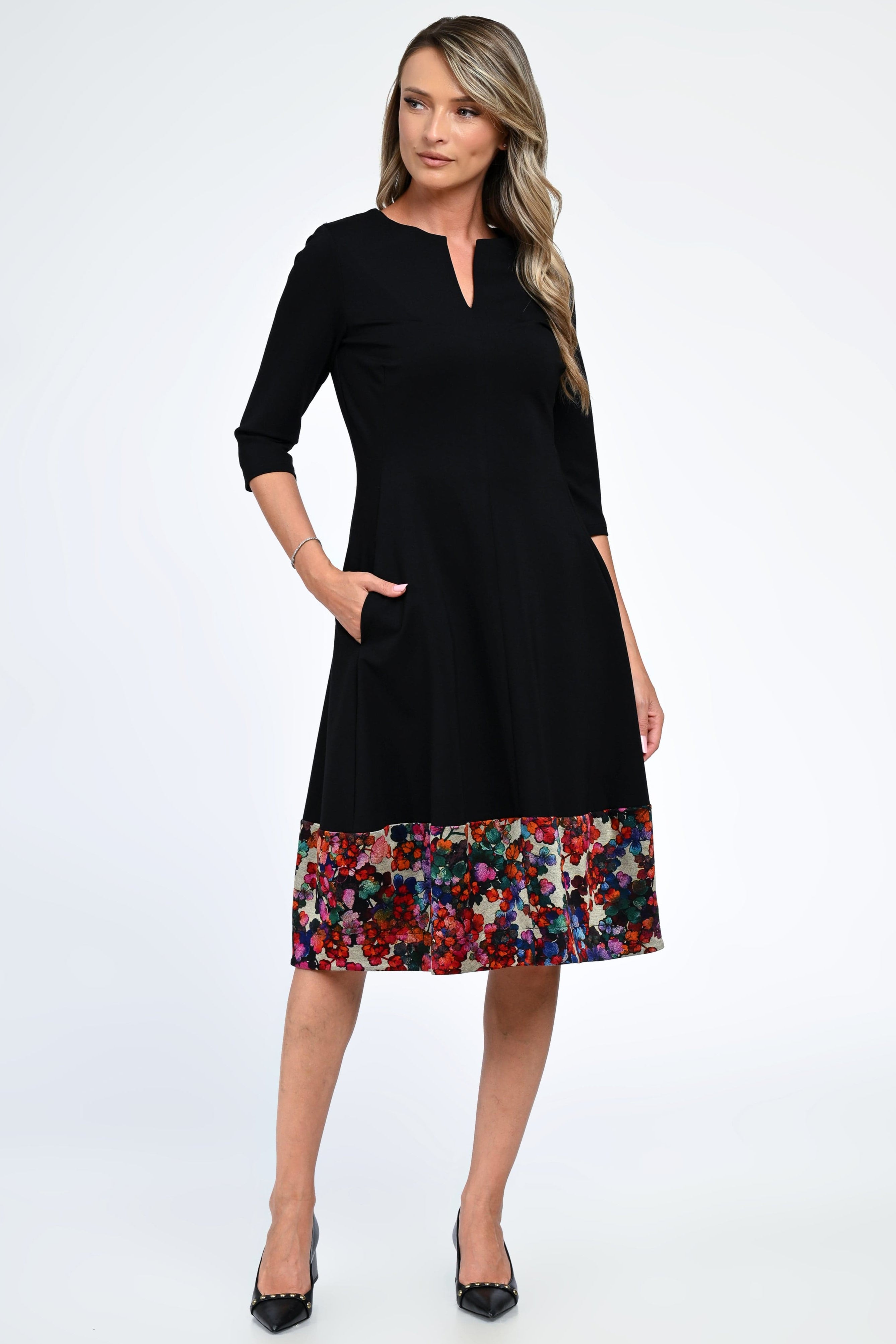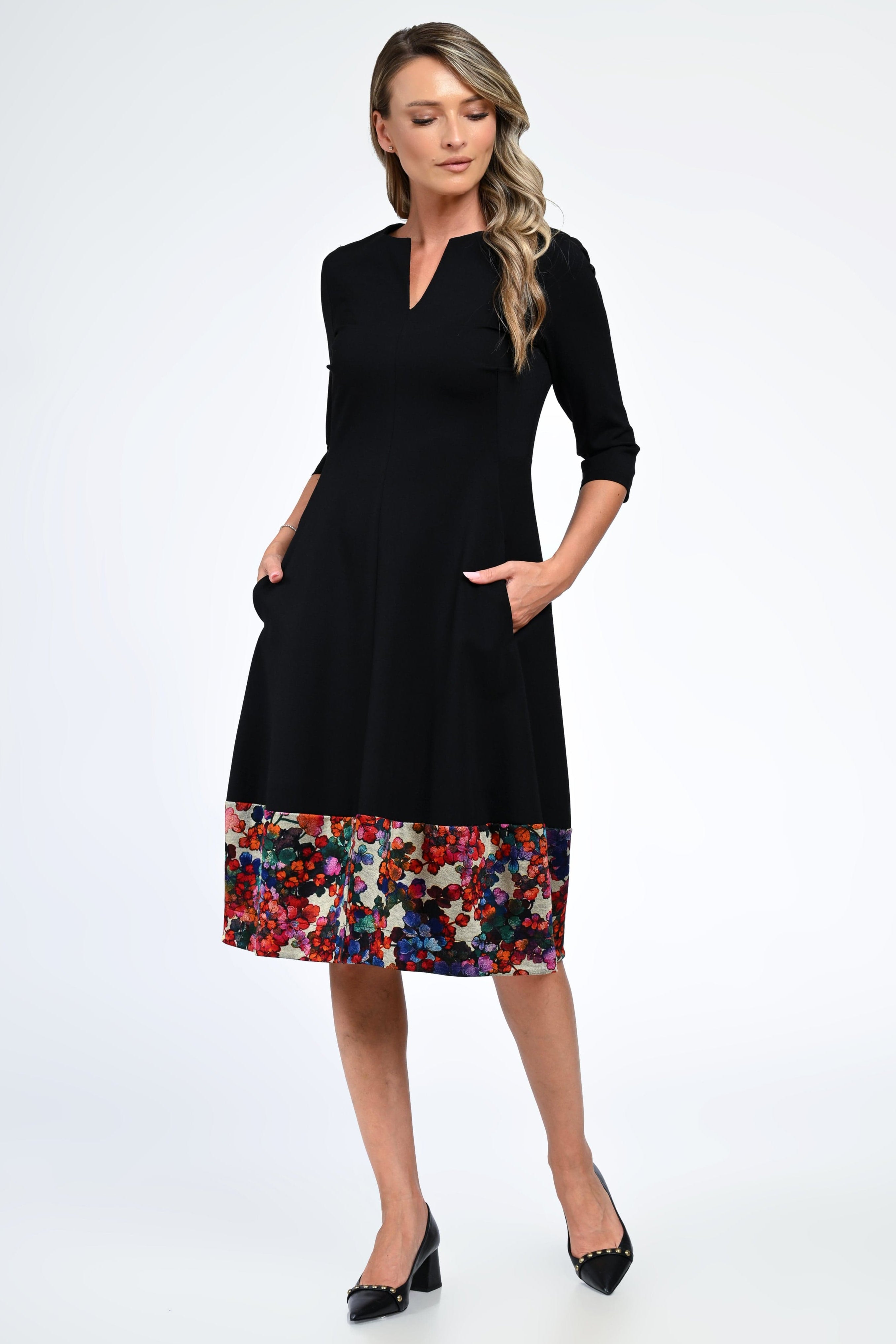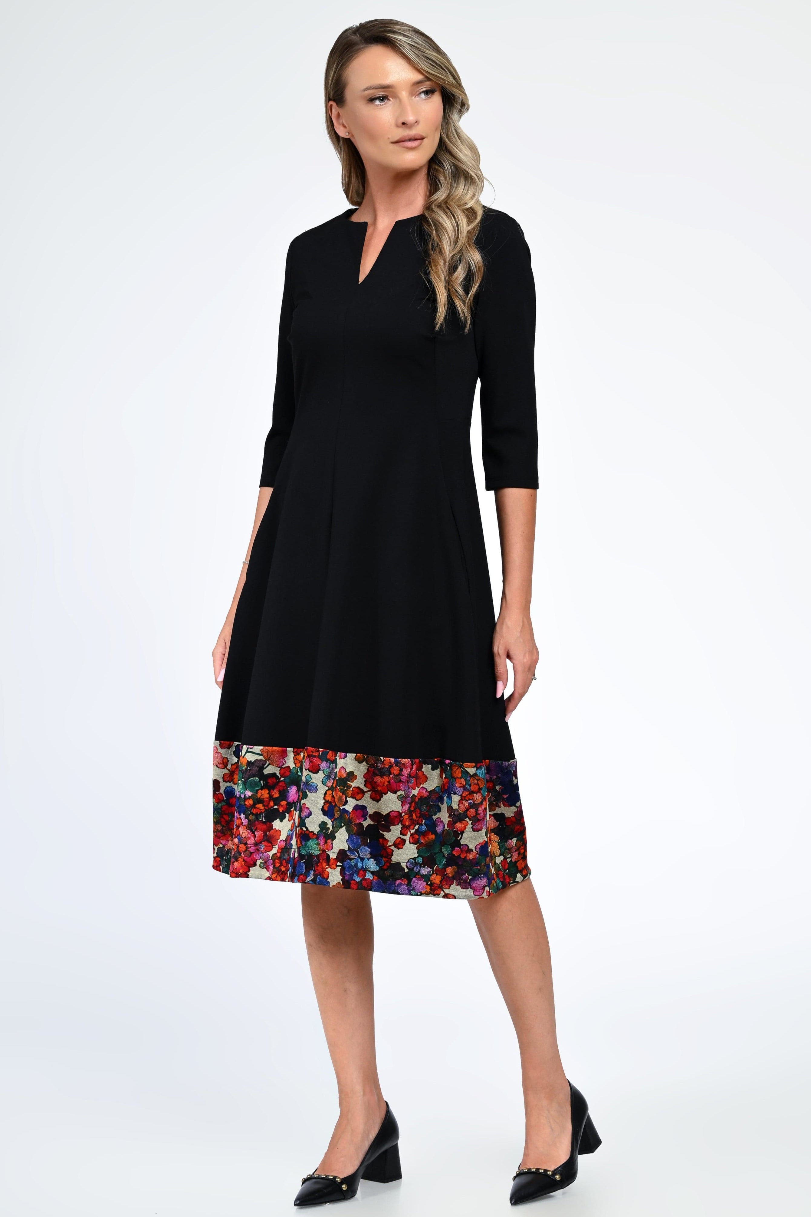 Rochia damă Iris îmbină simplitatea clasică a negrului cu accente florale vibrante la tiv, creând un contrast rafinat. Croiala în A avantajează orice siluetă, iar decolteul discret cu tăietură modernă și mânecile 3/4 îi oferă un plus de eleganță.