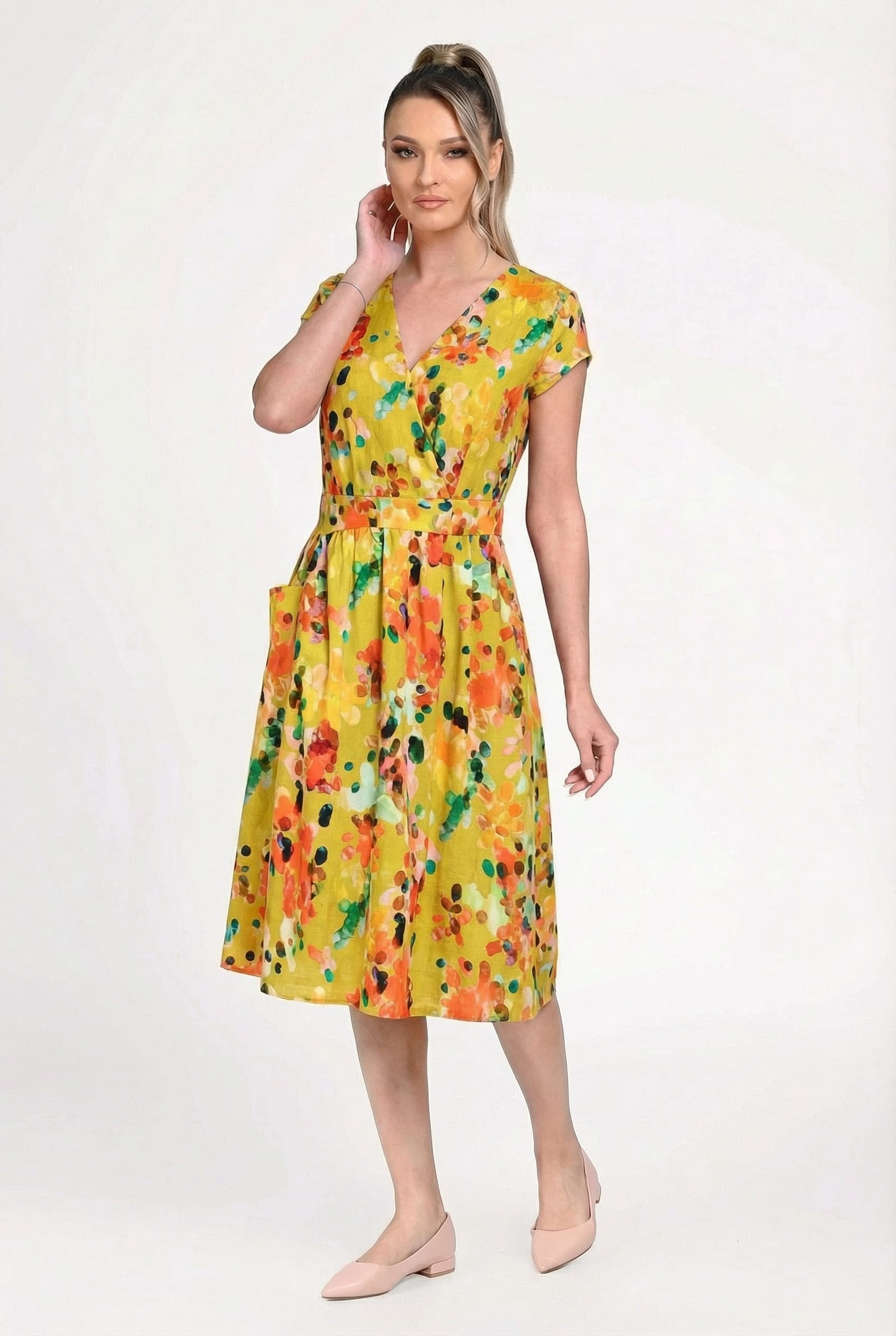 Imprimeul floral multicolor, în nuanțe vibrante, transformă rochia într-o piesă statement, ideală pentru plimbări, vacanțe sau evenimente de zi. Buzunarele laterale adaugă un plus de funcționalitate, fără a compromite eleganța.