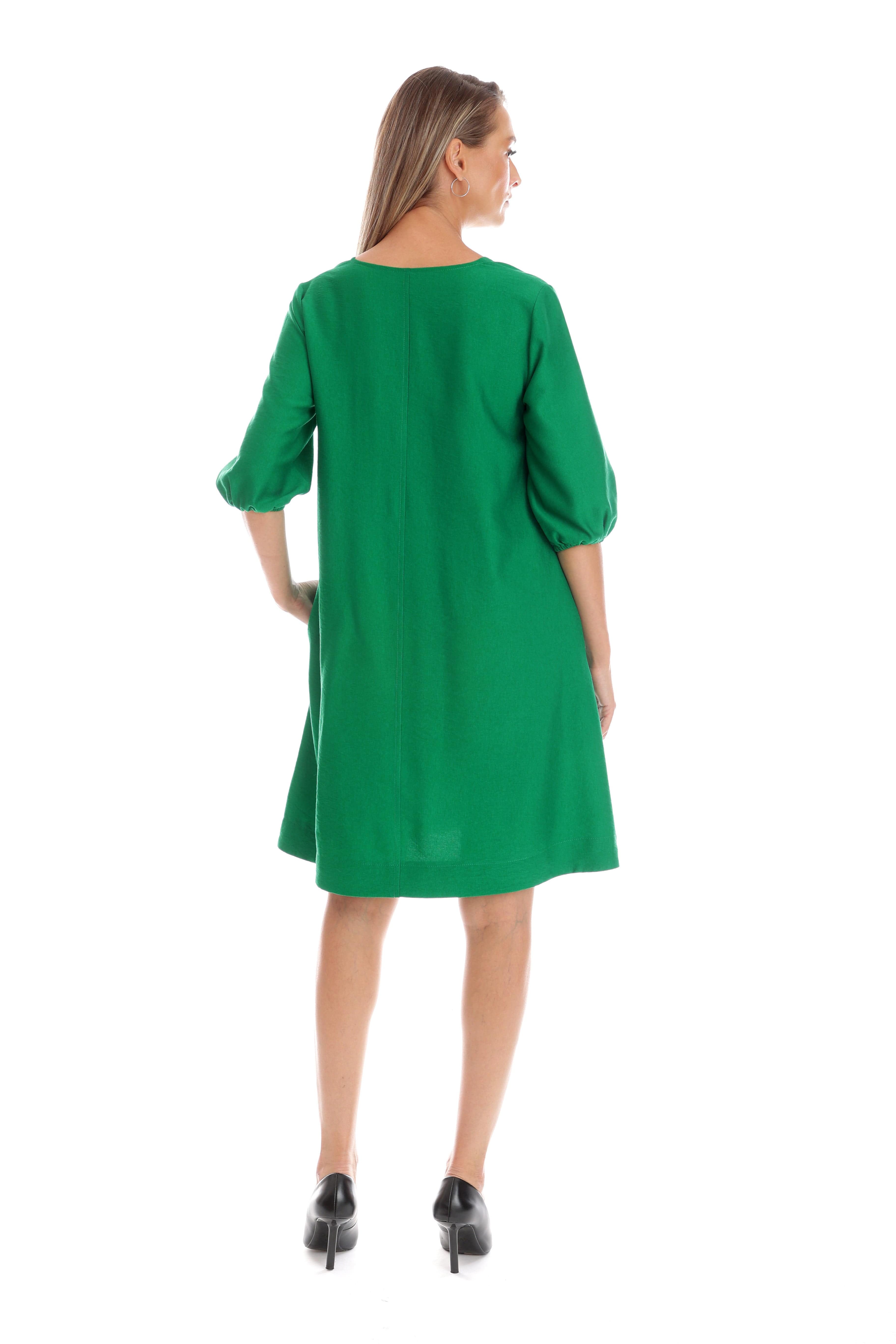 Aceasta rochie are un design simplu si elegant, cu un croi lejer, tip A-line, care se aseaza frumos pe orice tip de silueta.Este realizata dintr-o viscoza mai plina, intr-o nuanta de verde intens, proaspata si vibranta.