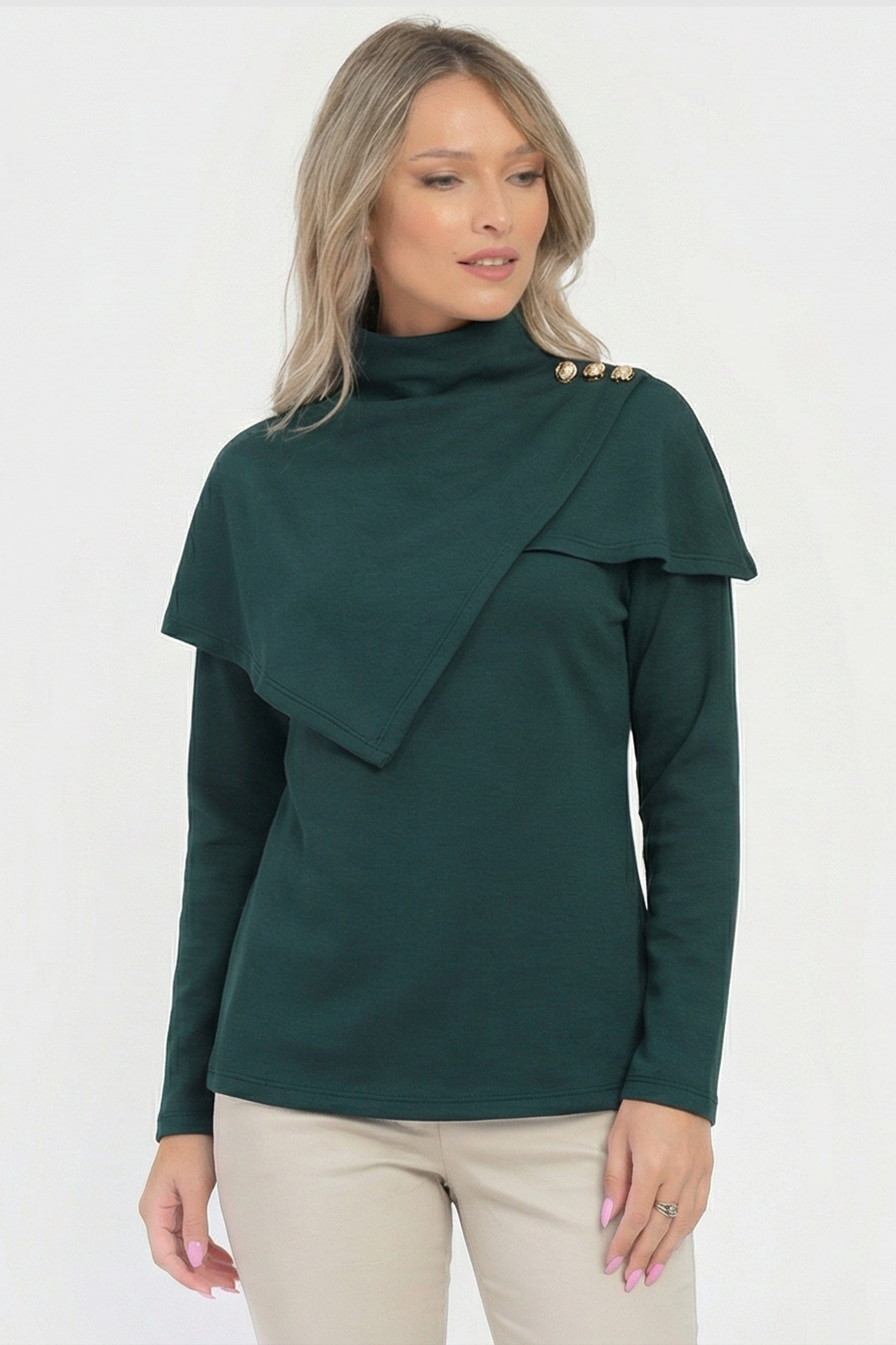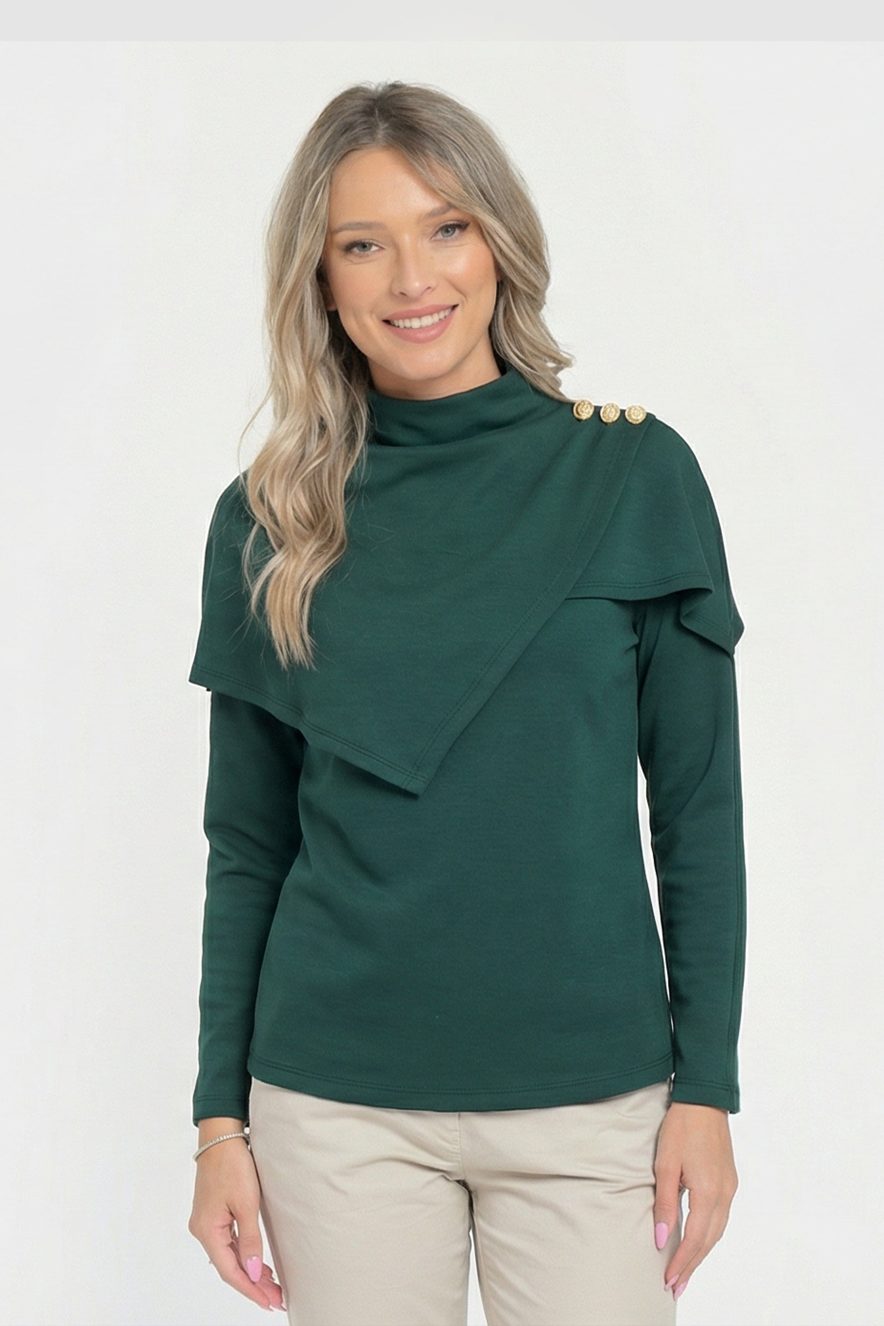 Bluză damă Teodora impresionează prin eleganța simplă și croiala modernă cu design petrecut. Gulerul înalt și detaliile decorative aurii aplicate pe umăr oferă un plus de rafinament, transformând această piesă într-o alegere ideală pentru ținute office sau smart casual.