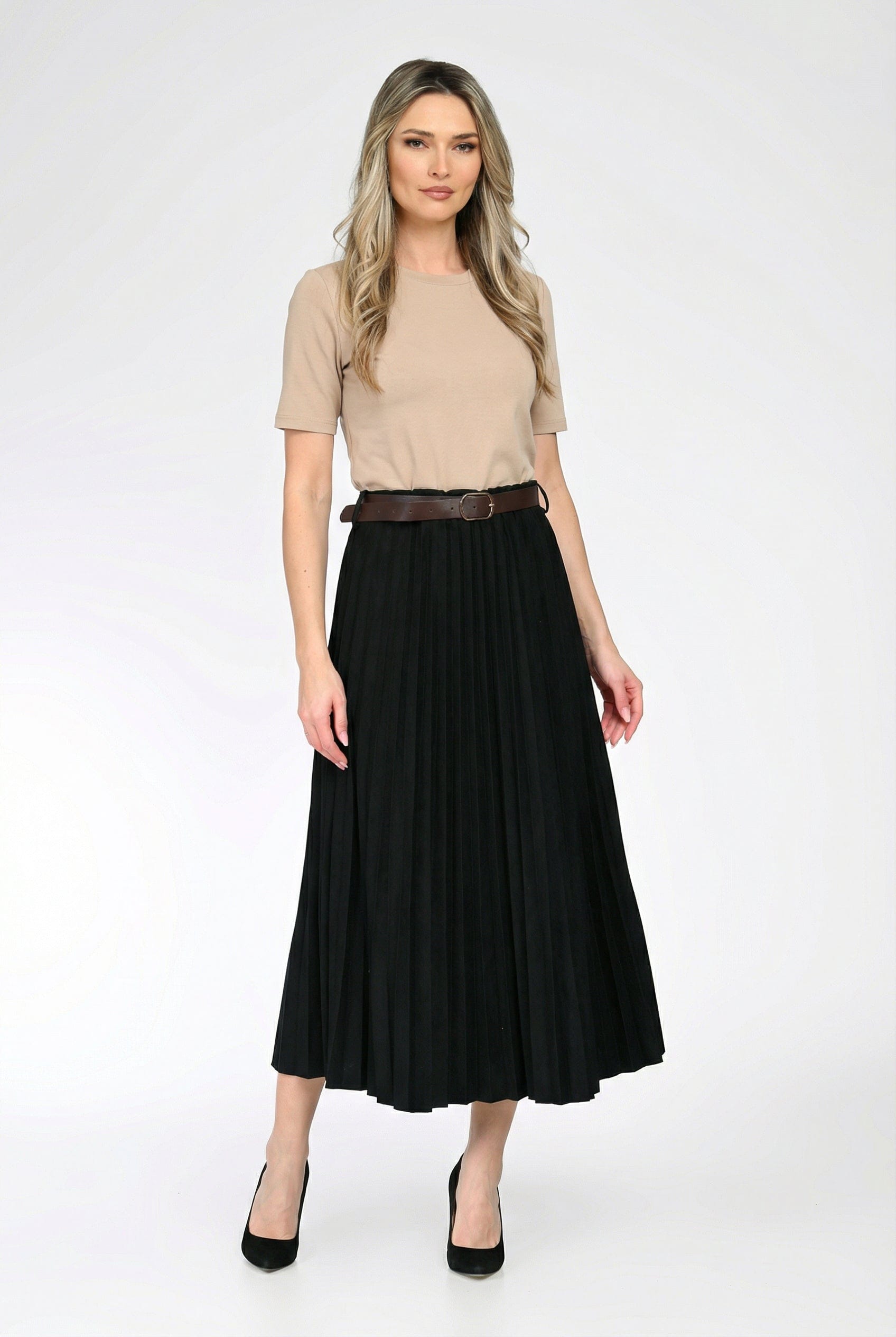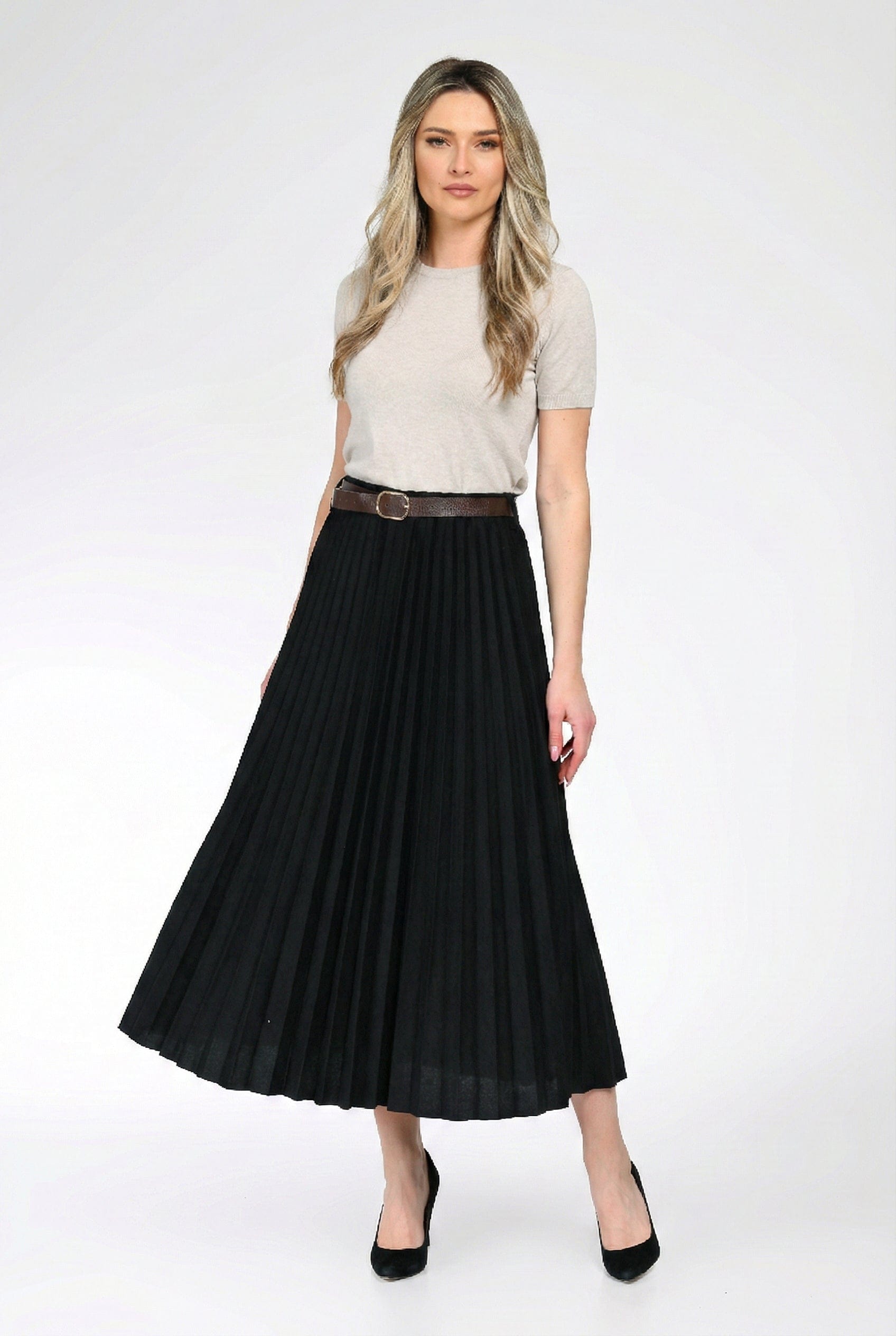 Fusta Elena este alegerea ideală pentru ținute elegante sau office, datorită croiului plisat și lungimii midi, care avantajează orice siluetă. Realizată dintr-un material lejer, cu cădere fluidă, această fustă oferă libertate de mișcare și un plus de rafinament. Talia este accentuată cu o curea subțire, detașabilă, ce conturează frumos linia corpului.