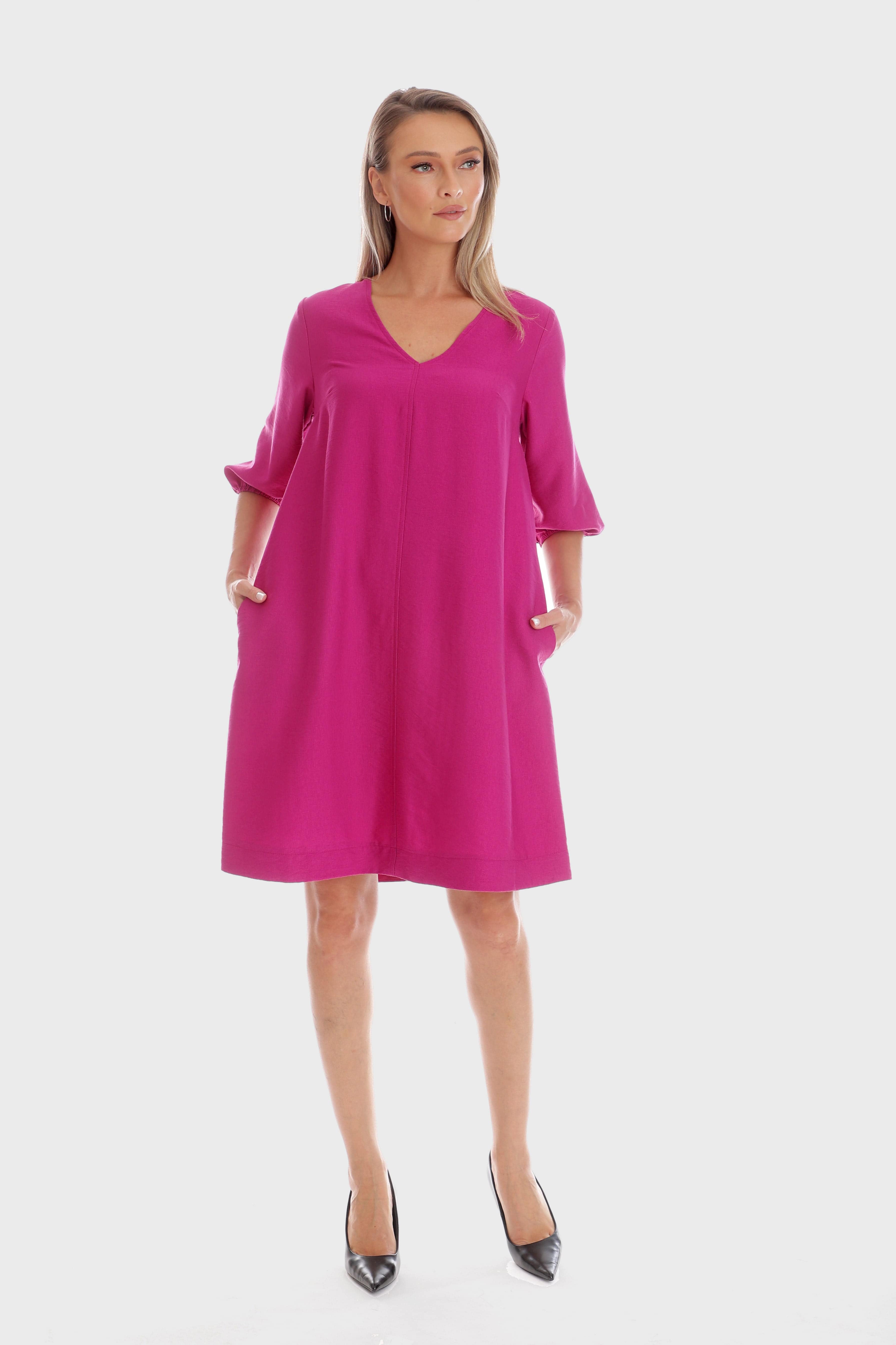 Aceasta rochie are un croi lejer, tip A-line, care cade fluid si ofera mult confort. Este realizata dintr-o viscoza mai plina, intr-o nuanta  de fuchsia, vibranta si feminina. Are decolteu in V, ce alungeste silueta si maneci 3/4 bufante care dau un aer relaxat si elegant in acelasi timp. Buzunarele laterale reprezinta un detaliu practic, ce adauga lejeritate tinutei.