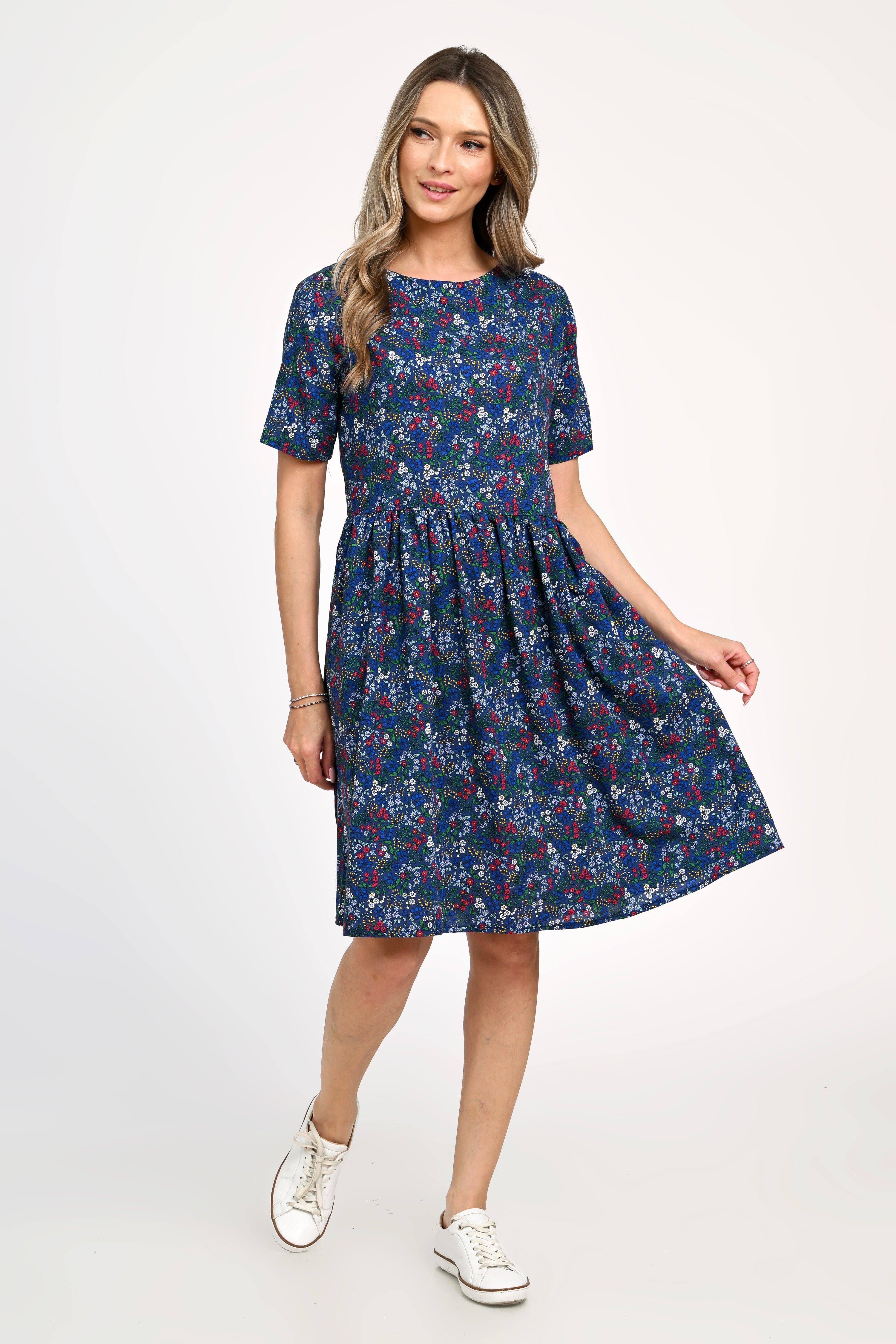 Rochie de lungime medie, confectionata dintr-un material fluid si respirabil (viscoza) foarte potrivit pentru zilele calduroase de vara, cu imprimeu microfloral in nuante vii (bleumarin/alb/rosu/galben). Croiala este lejera, avantajoasa pentru orice silueta, cu cret in talie, maneca scurta si buzunare laterale ascunse pentru un plus de confort si practicabilitate. Rochia poate fi purtata ca atare, cu tenisi sau sandale flat pentru un look mai relaxat, sau cu talia marcata si sandale cu toc pentru un look mai elegant.