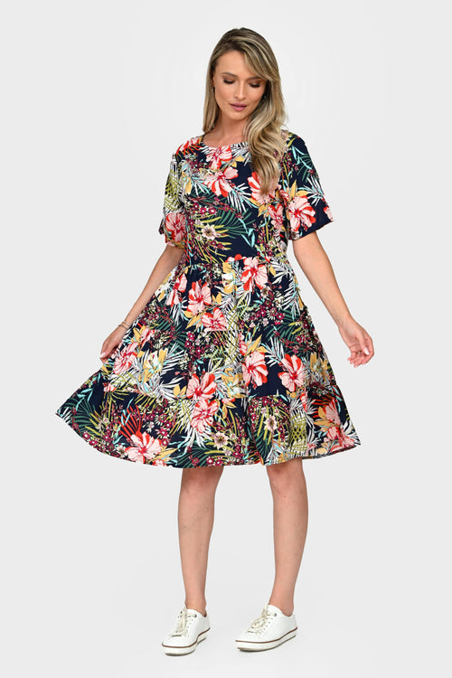 Aceasta rochie confectionata din viscoza usoara si fluida, cu imprimeu tropical in nuante vii, scos frumos  in evidenta de fundalul bleumarin, este ideala pentru zilele toride de vara. Croiala este lejera, talia usor marcata, dar nu stramta, iar volanele suprapuse ofera volum si miscare. Manecile sunt scurte, largute, in stil lejer, iar decolteul rotund, simplu, echilibreaza imprimeul bogat. Rochia este potrivita pentru plimbari pe faleza, petreceri in gradina sau iesiri in oras si poate fi usor accesorizata cu cercei supradimensionati, geanta de paie, palarie si ochelari de soare pentru un look de vacanta complet.