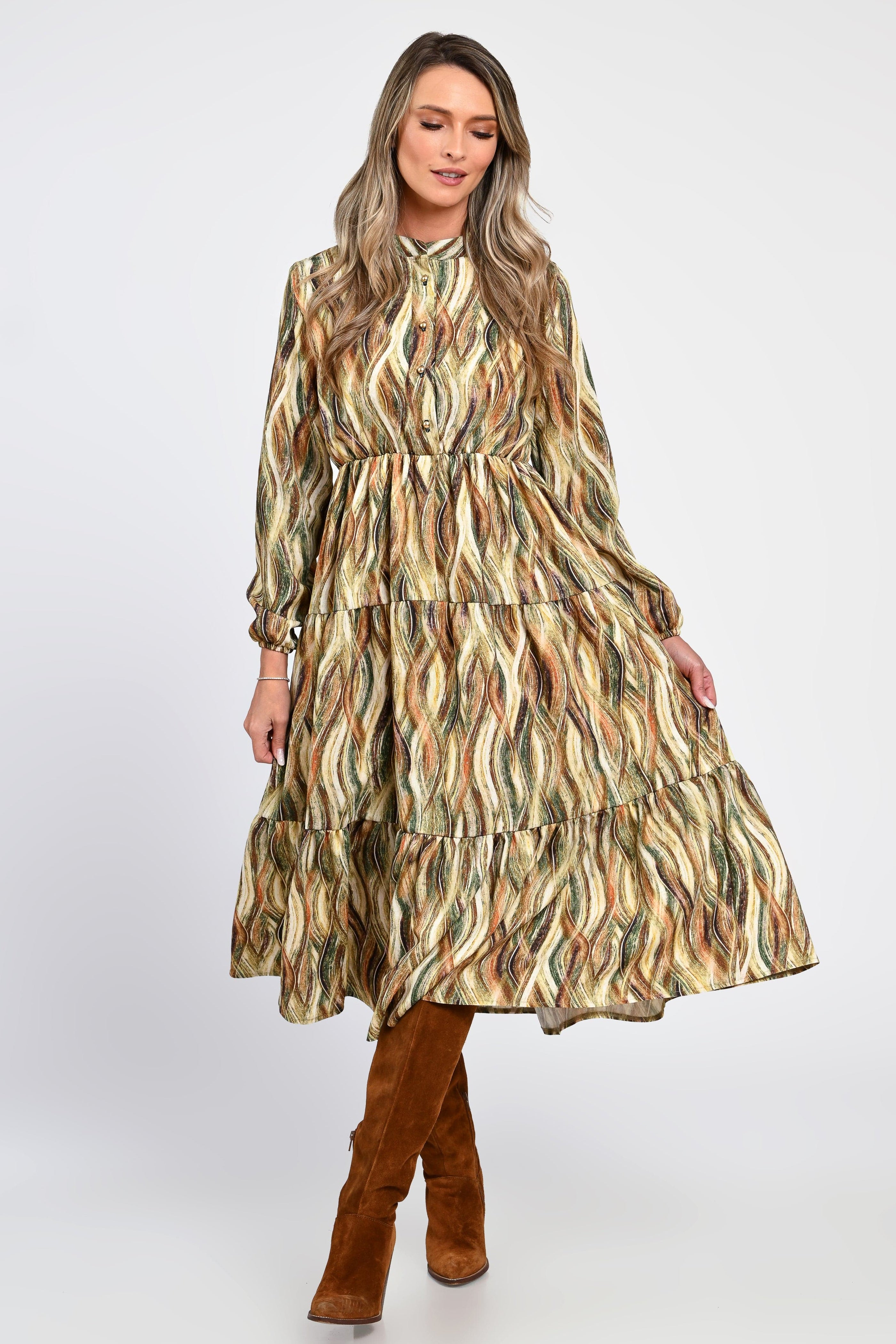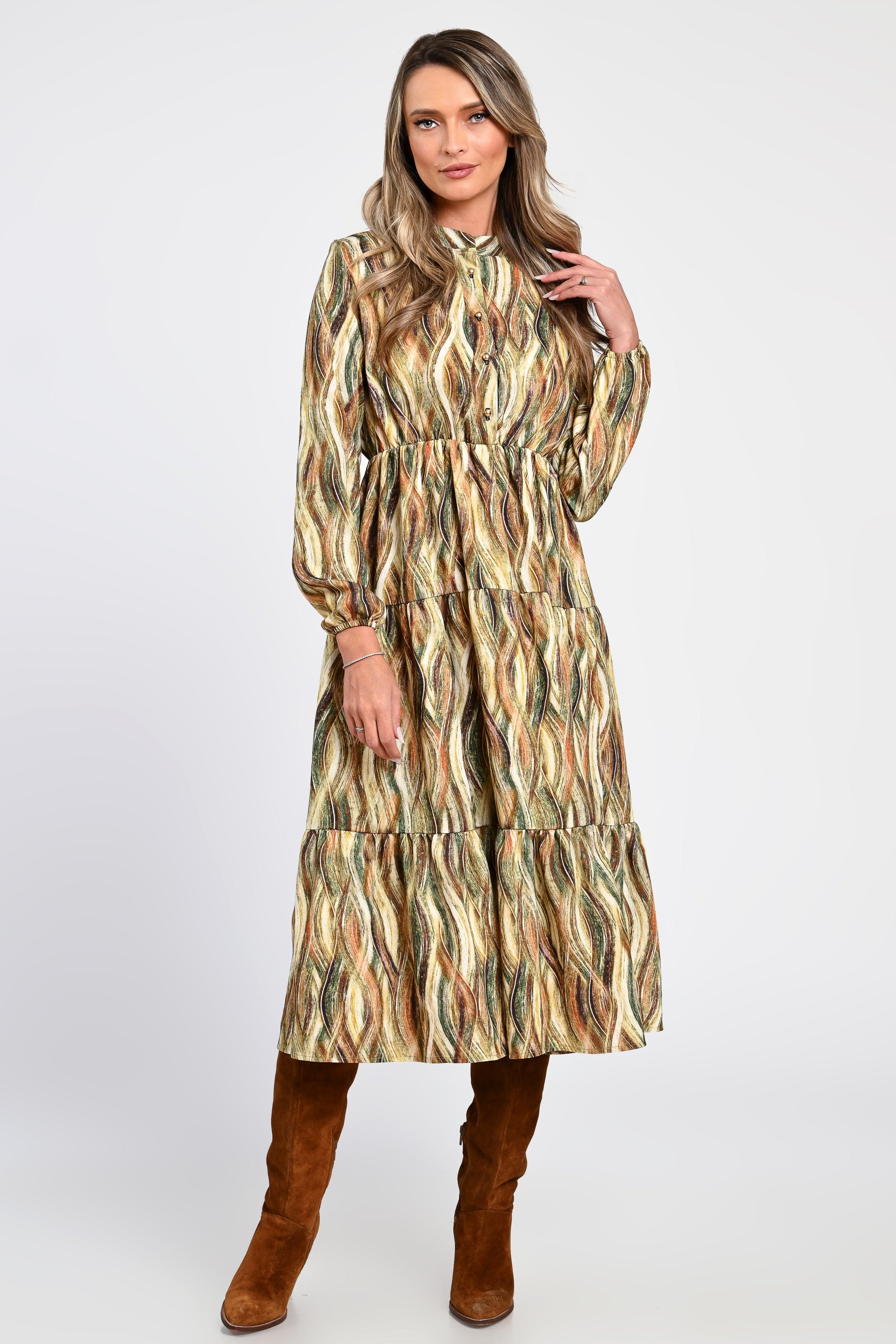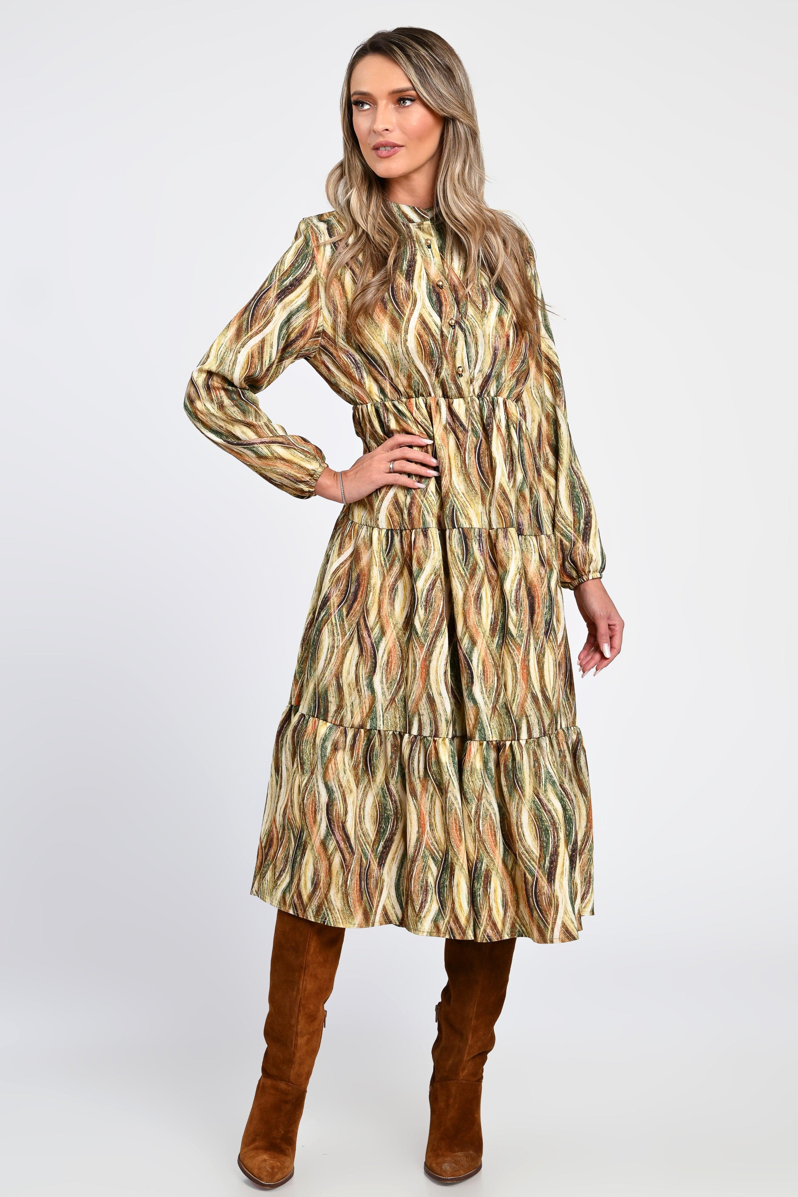 Rochia Elora surprinde frumusețea toamnei printr-un imprimeu pictural în tonuri de bej, arămiu și verde măsliniu. Croiala lejeră, cu volane ample și talie elastică, îți oferă libertate de mișcare și un plus de feminitate. Mânecile lungi și gulerul delicat completează perfect aerul boem, făcând-o ideală pentru zilele răcoroase. Poart-o cu cizme din piele întoarsă sau ghete, pentru un look natural, plin de farmec și stil.