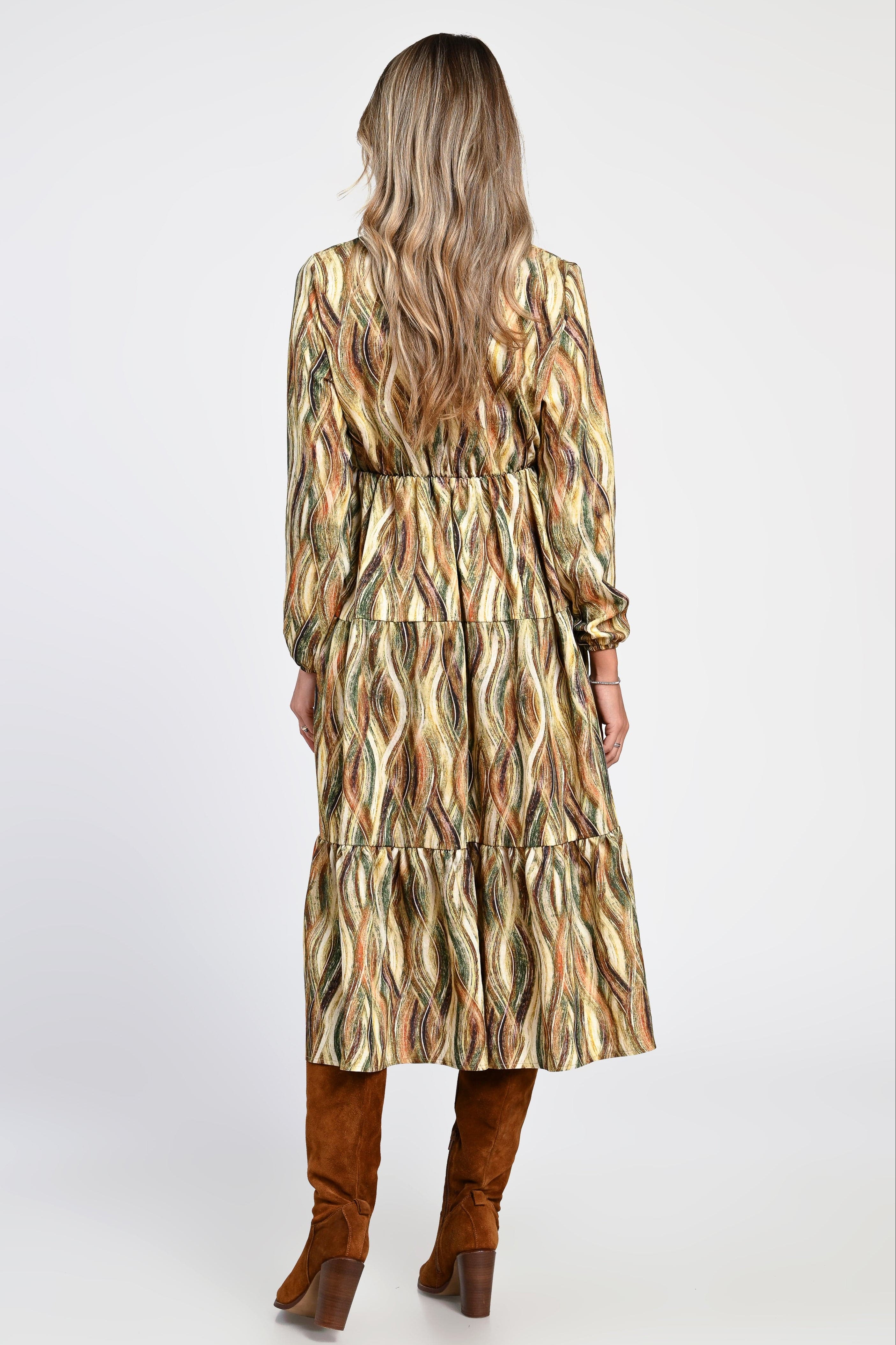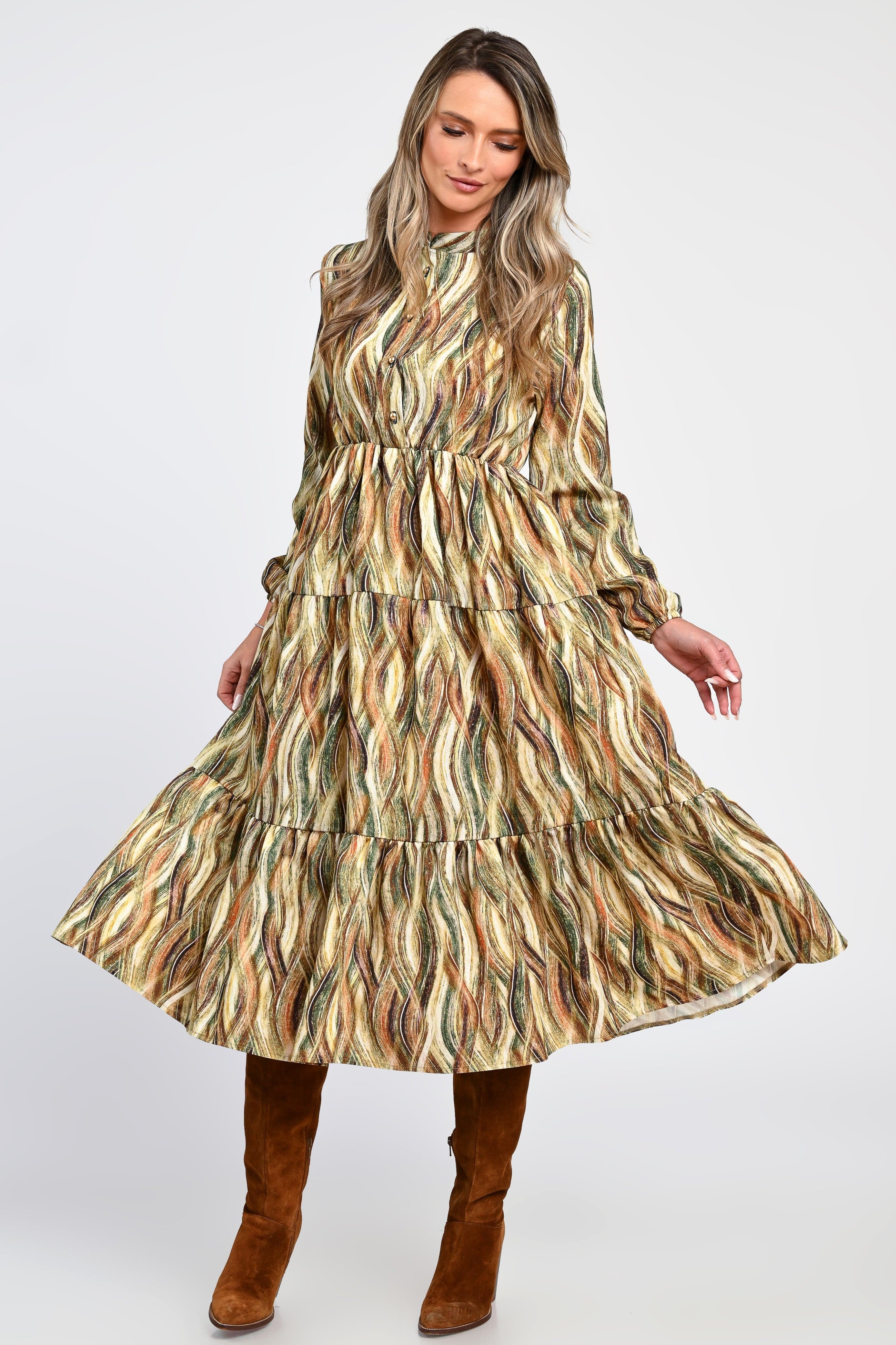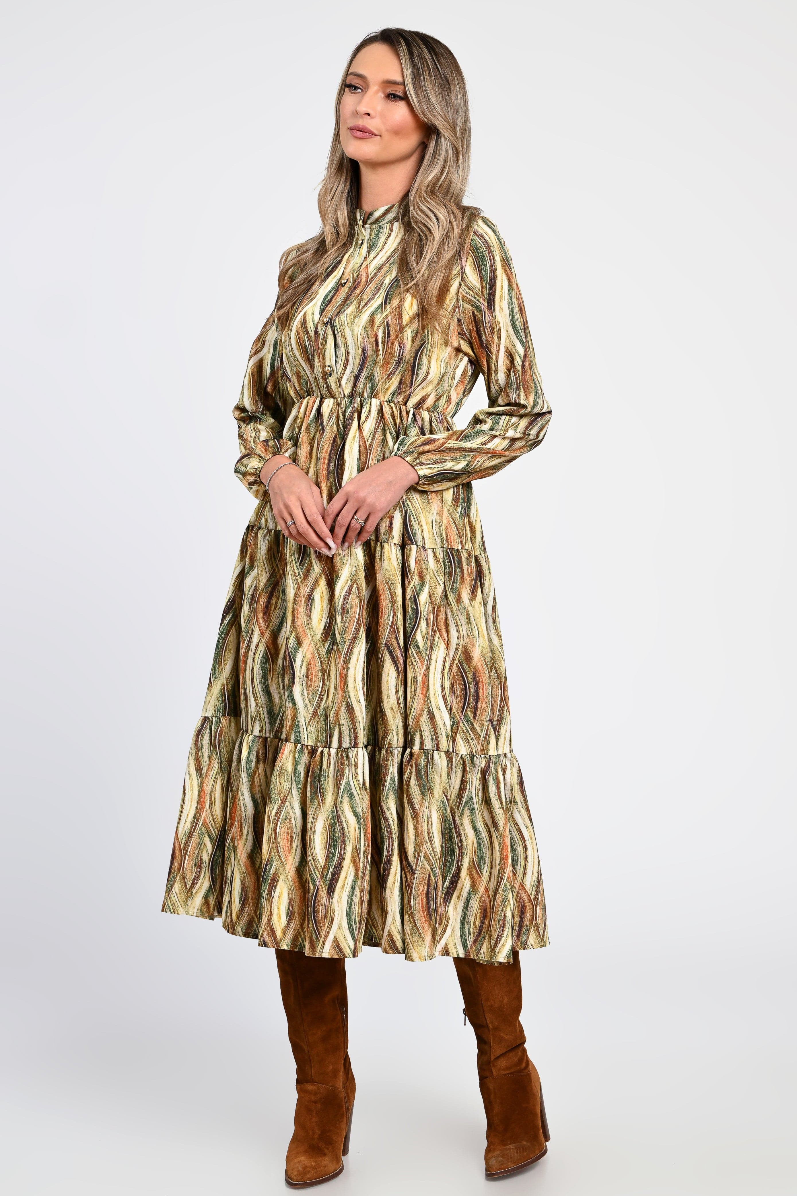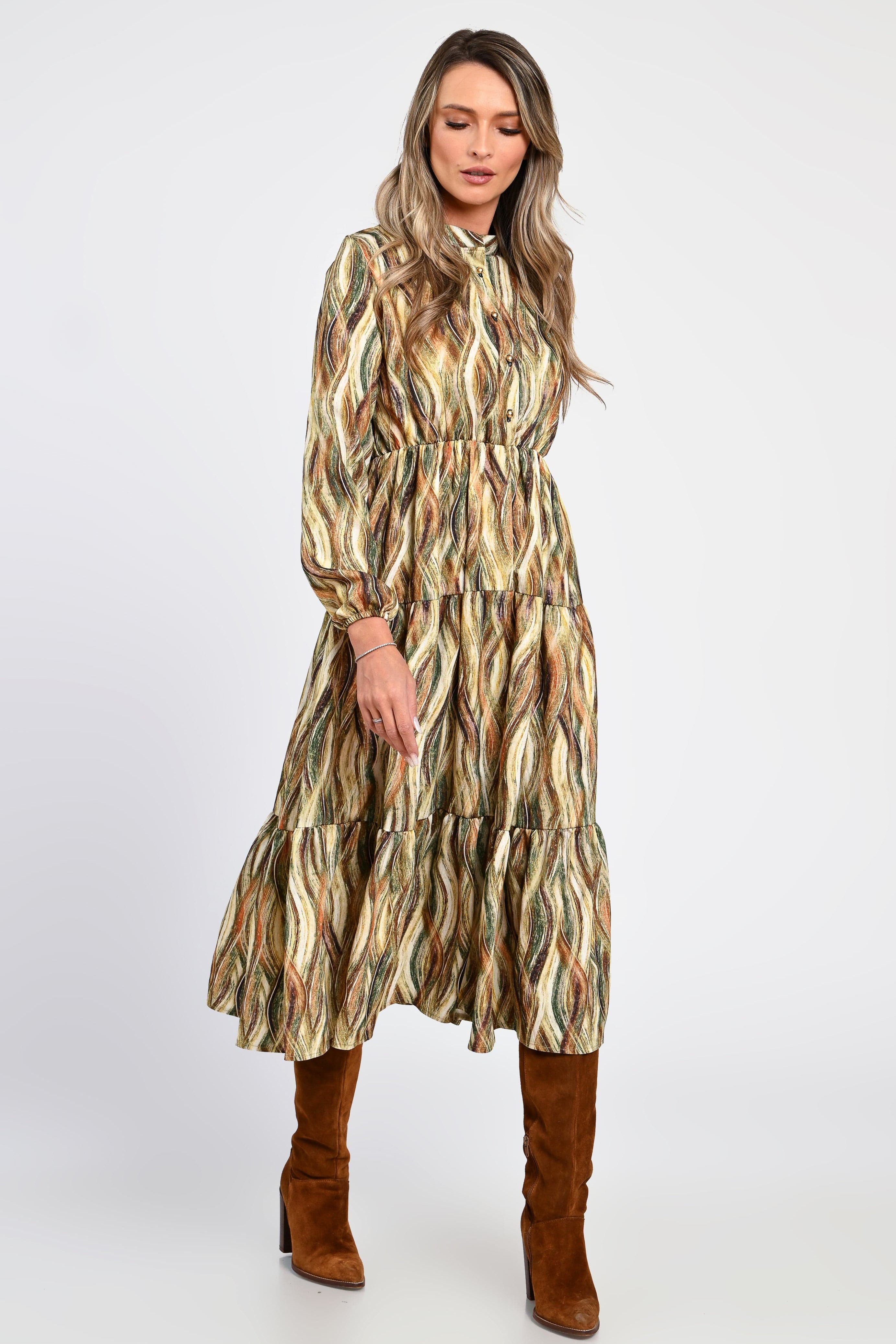 Rochia Elora surprinde frumusețea toamnei printr-un imprimeu pictural în tonuri de bej, arămiu și verde măsliniu. Croiala lejeră, cu volane ample și talie elastică, îți oferă libertate de mișcare și un plus de feminitate. Mânecile lungi și gulerul delicat completează perfect aerul boem, făcând-o ideală pentru zilele răcoroase. Poart-o cu cizme din piele întoarsă sau ghete, pentru un look natural, plin de farmec și stil.