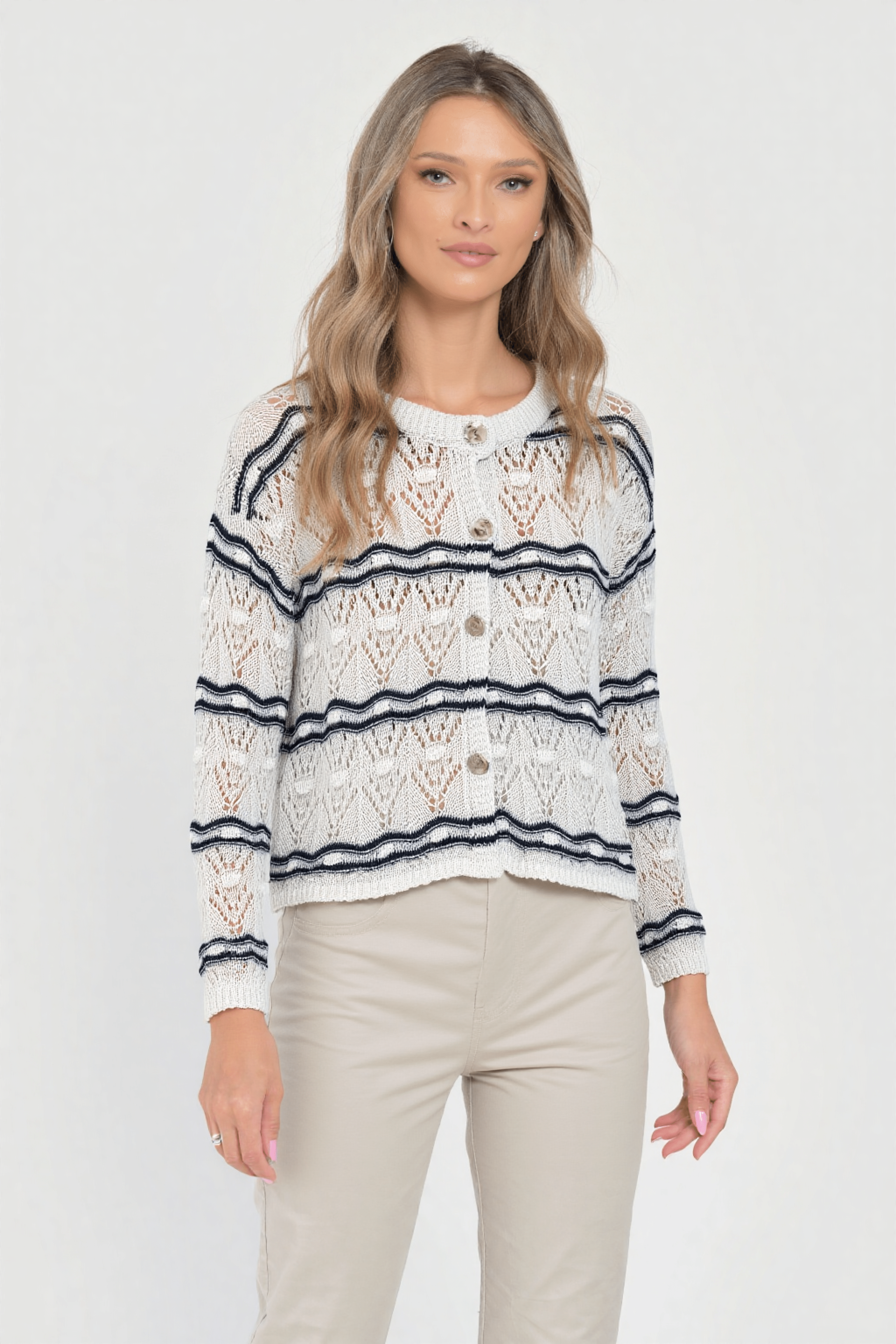 Cardigan alb cu dungi bleumarin – o piesă tricotată lejer, cu un design feminin și modern. Modelul are textură ajurată, linii orizontale în nuanțe contrastante și nasturi decorativi frontali. Croiala scurtă și gulerul rotund adaugă un aer rafinat, perfect pentru ținute casual elegante de primăvară sau toamnă.