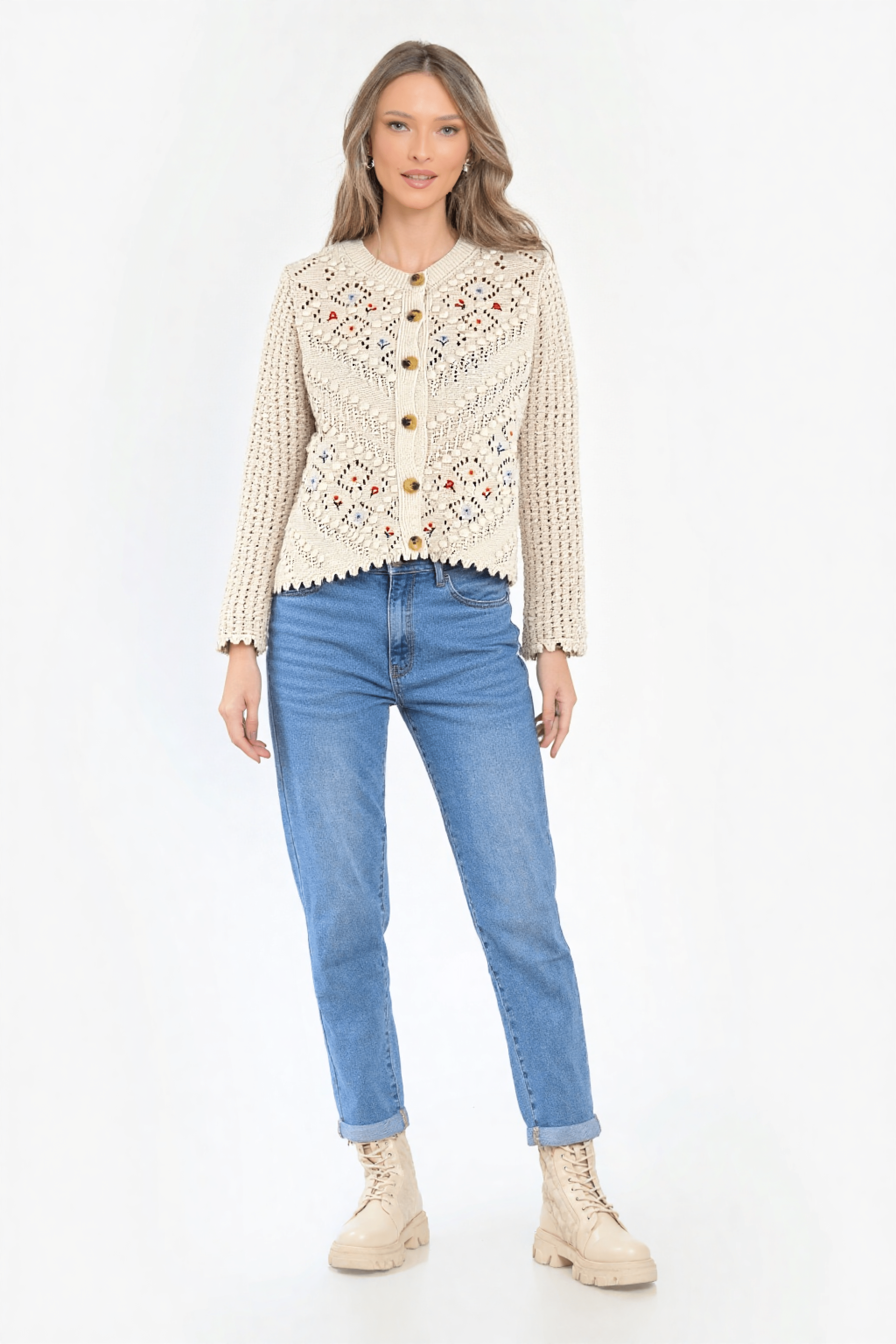 Cardigan crem cu broderie colorată – un model tricotat manual, cu un design boem și accente delicate. Realizat din fir moale, are un model ajurat, nasturi mari decorativi și broderii florale discrete. Croiala dreaptă și gulerul rotund îl fac ușor de purtat atât peste bluze, cât și peste rochii, ideal pentru un look lejer și elegant.