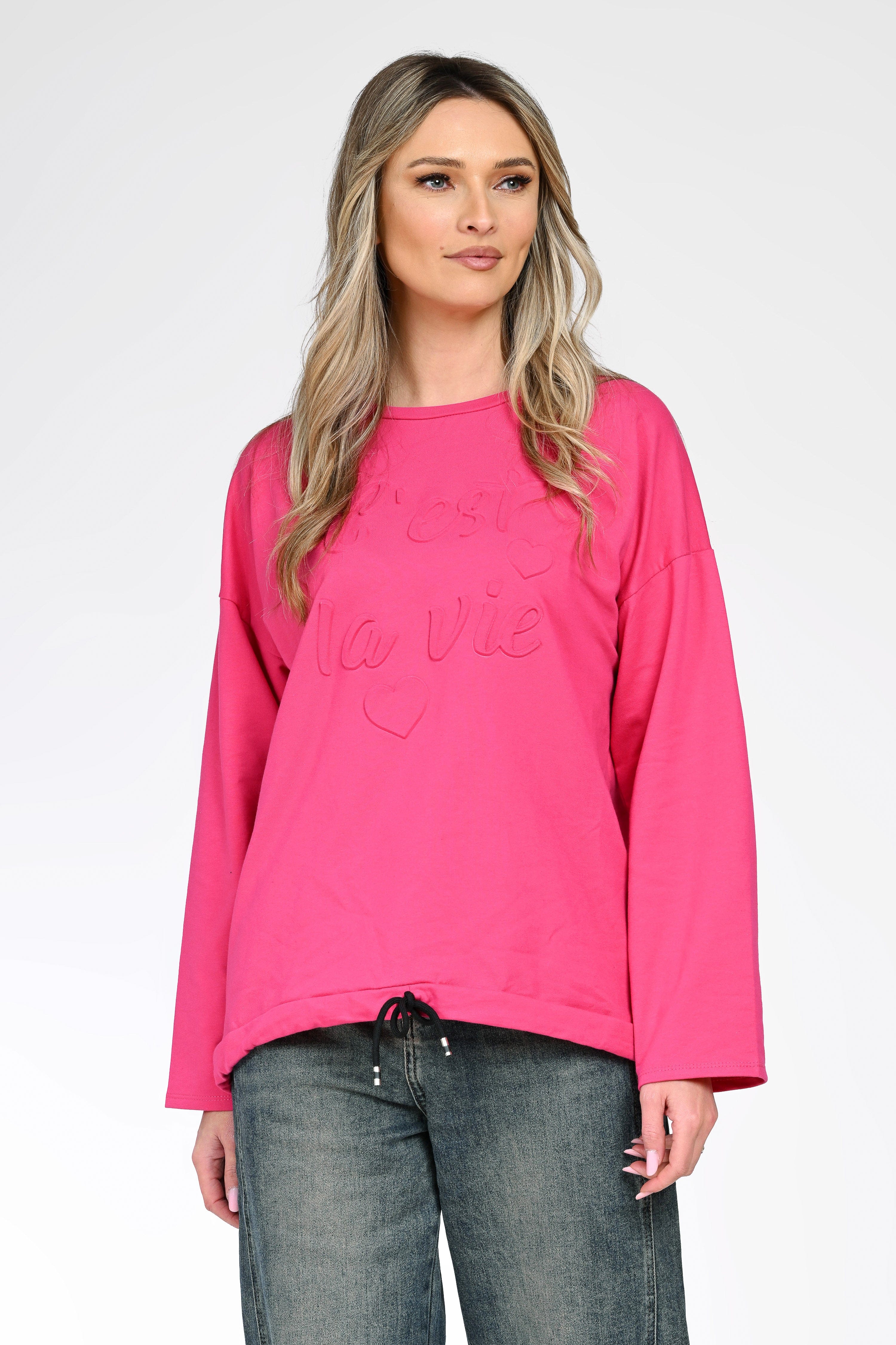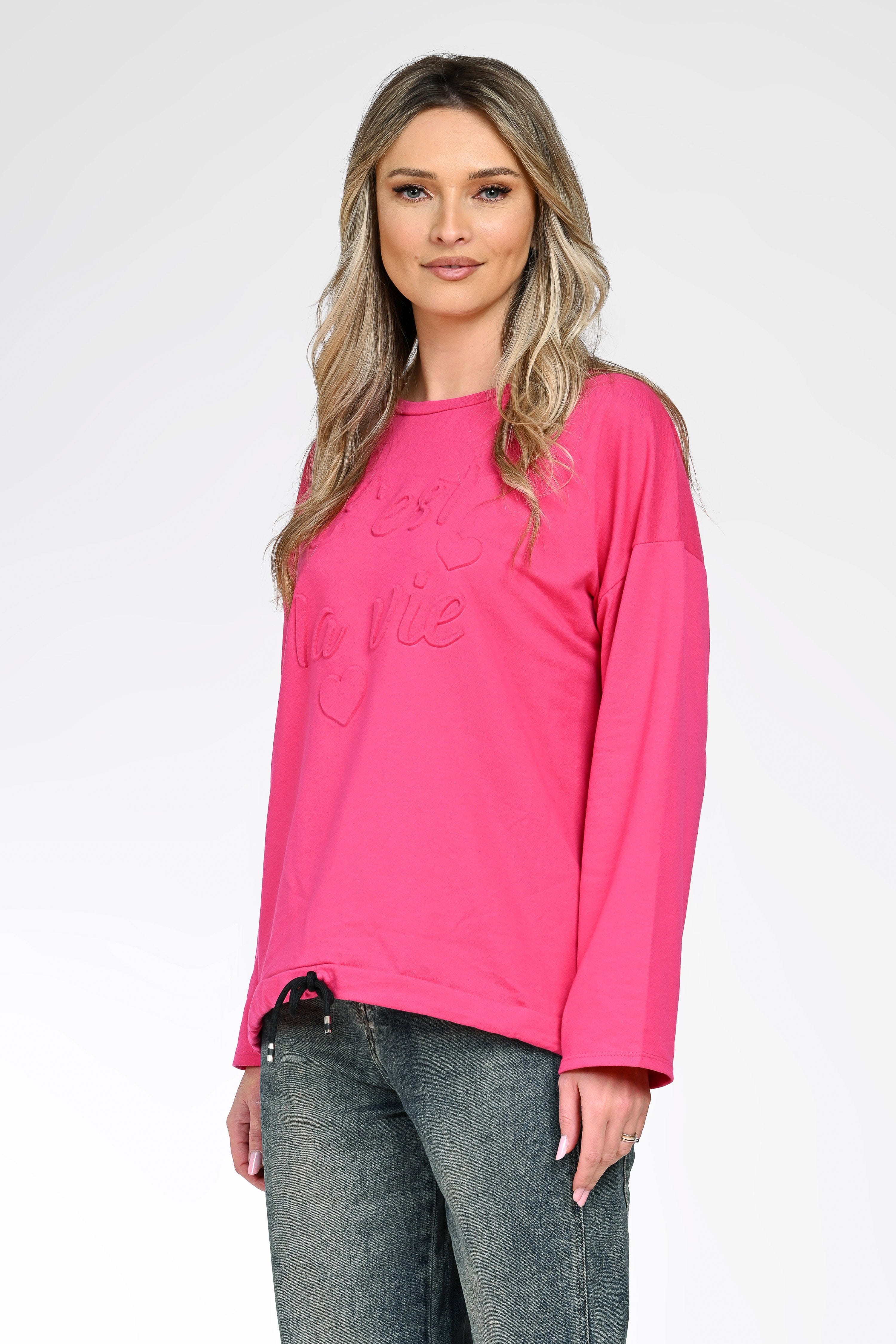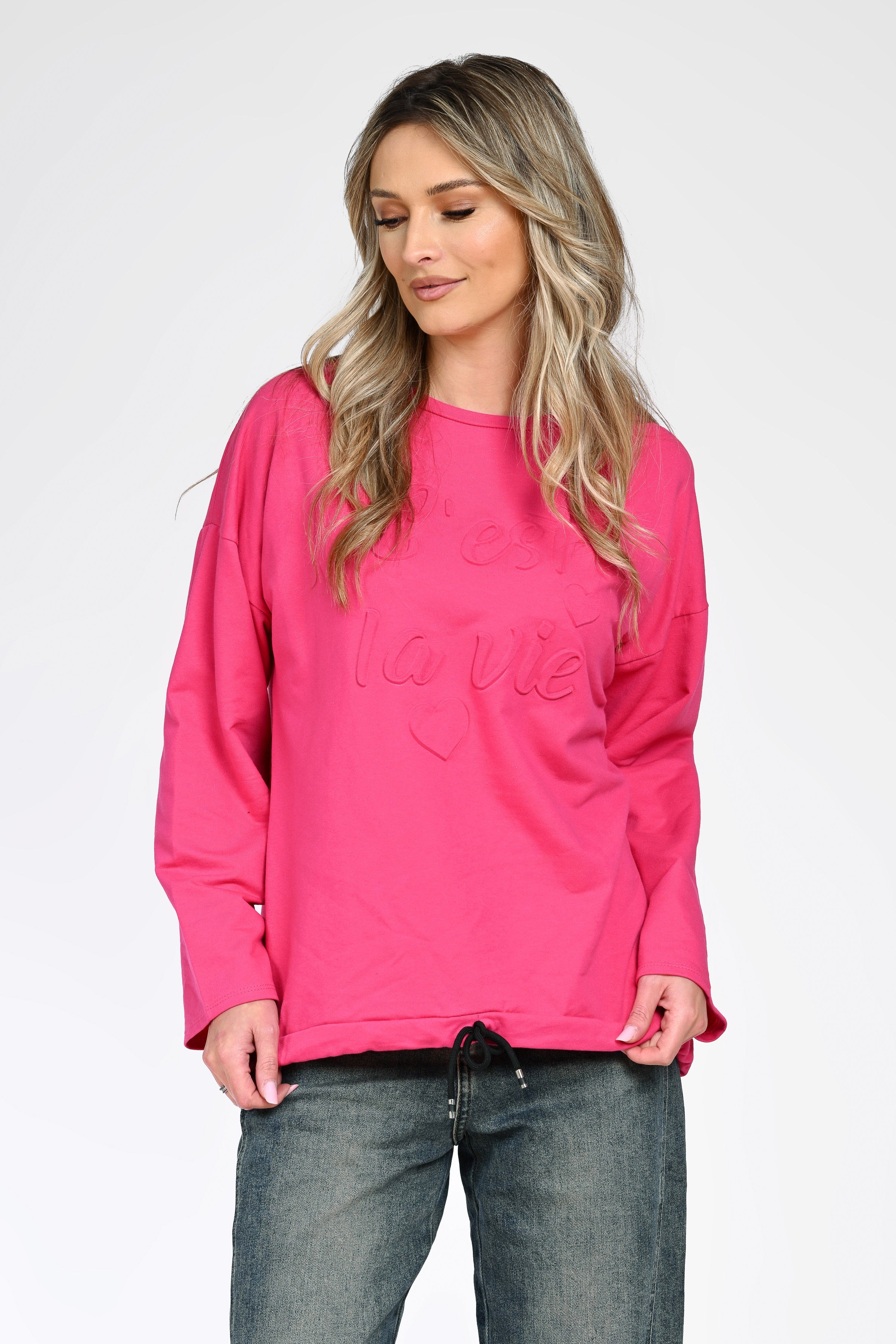 Bluza Amélie aduce un plus de culoare și optimism în garderoba ta, datorită nuanței vibrante de roz și mesajului embosat „C’est la vie”. Croiul lejer și mânecile lungi oferă confort și libertate de mișcare, fiind ideală pentru purtare zilnică.