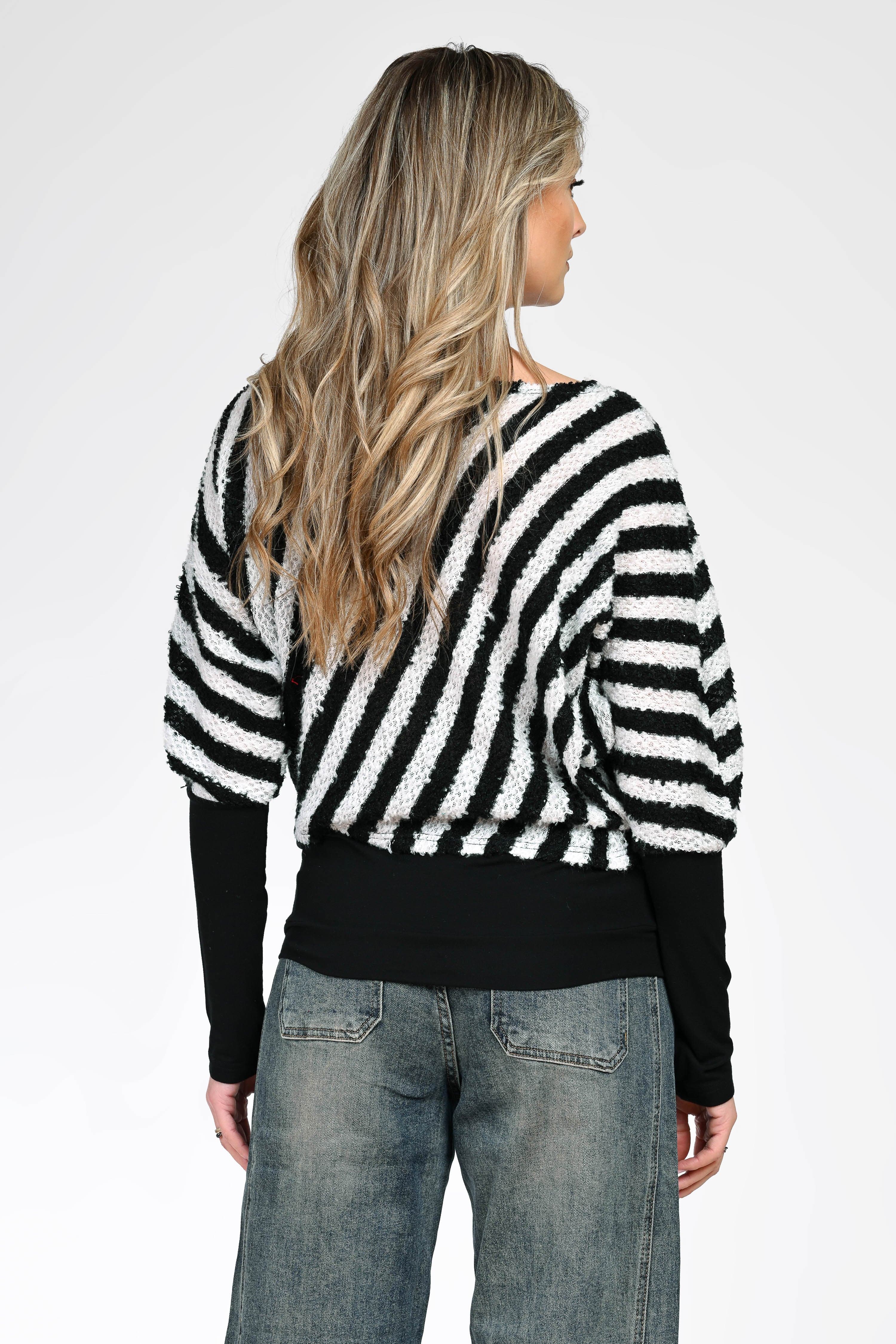 Bluza Monica se remarcă prin designul grafic în dungi alb-negru, care adaugă un aer modern și ușor nonconformist ținutelor de zi. Croiul lejer, cu mâneci tip fluture și manșete uni negre, oferă un contrast elegant și o așezare armonioasă pe corp.
