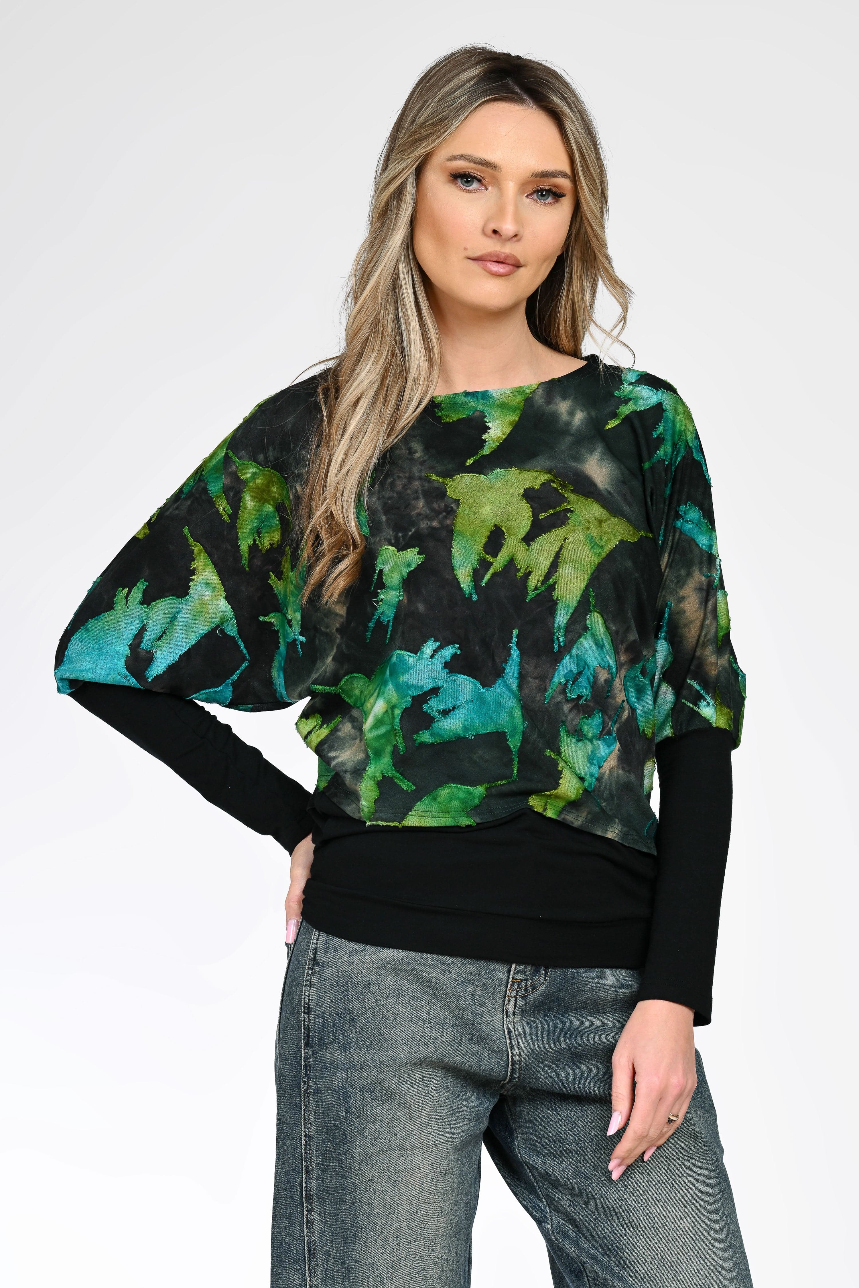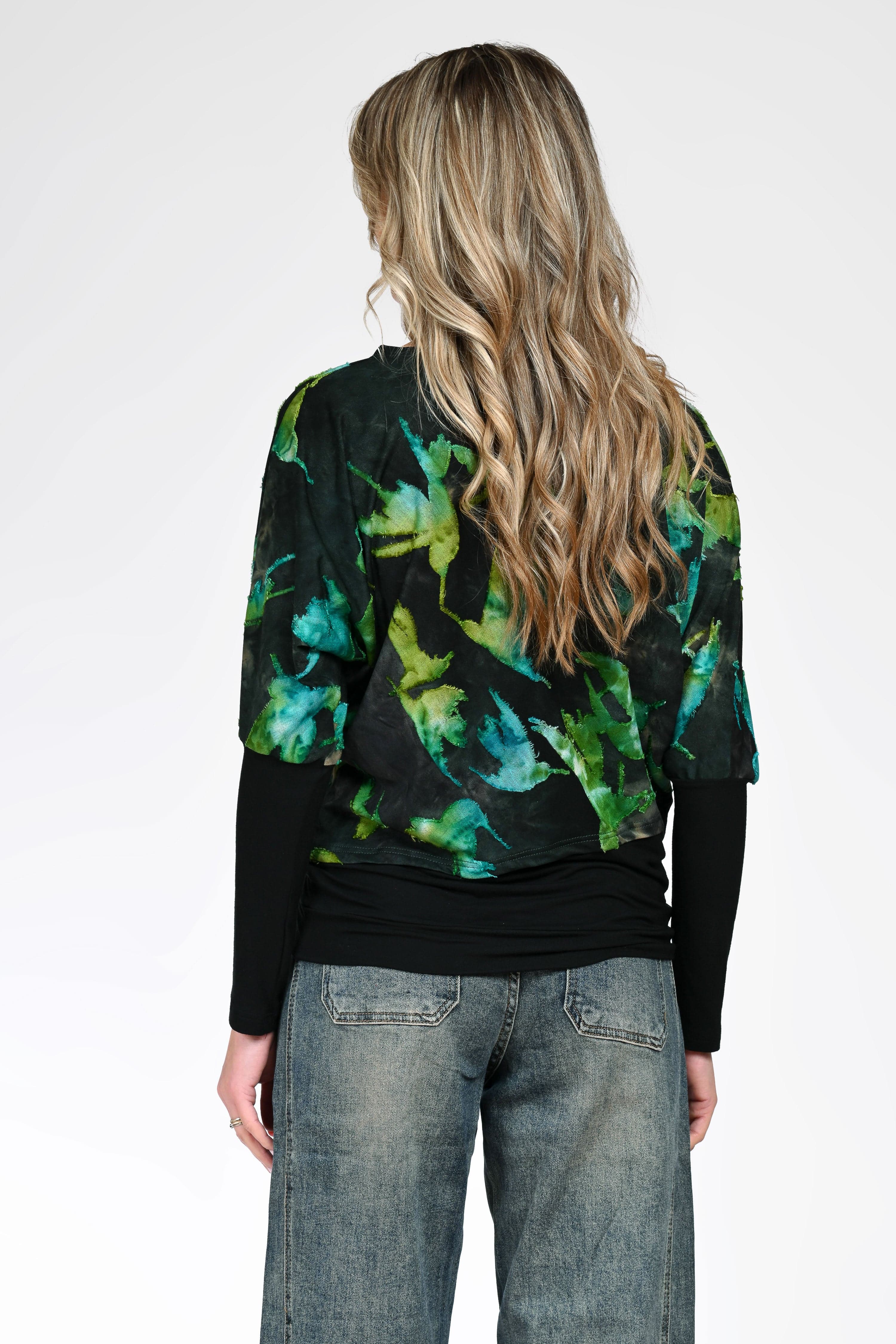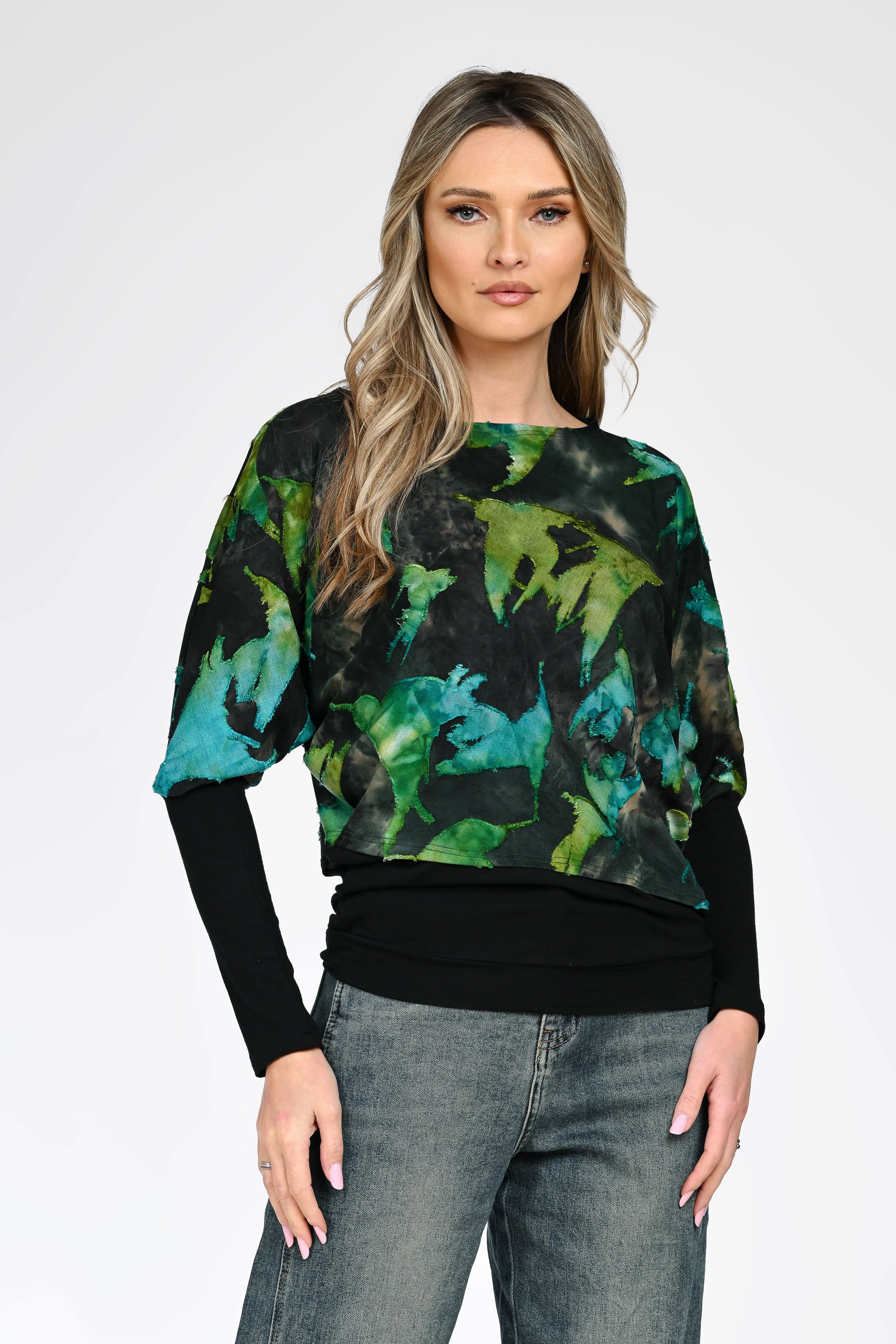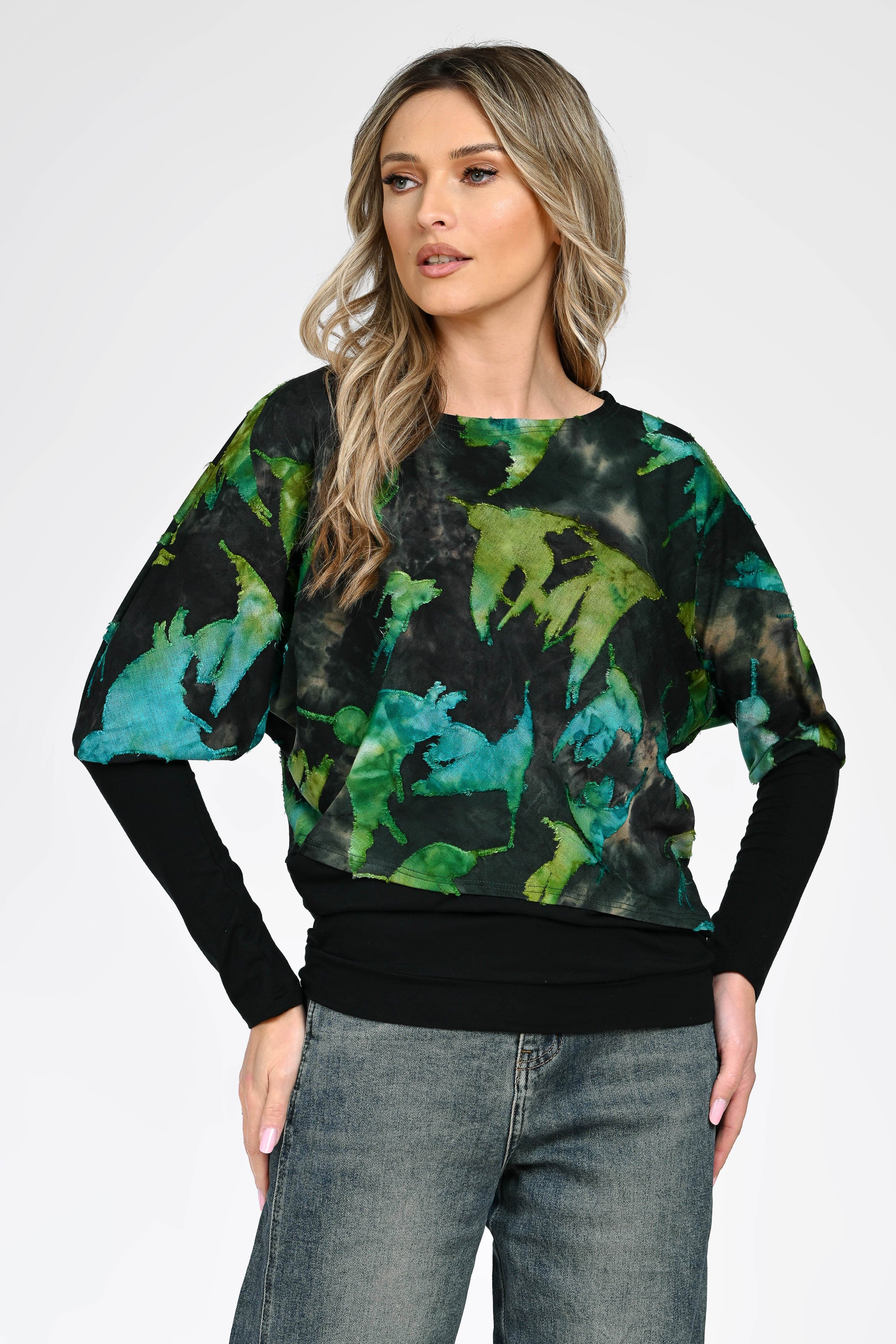 Bluza Iris se evidențiază prin imprimeul abstract în nuanțe de verde și turcoaz, care aduce un aer fresh și contemporan ținutei. Croiul lejer, cu mâneci tip fluture și bază uni neagră, oferă un contrast elegant și o așezare armonioasă pe corp.