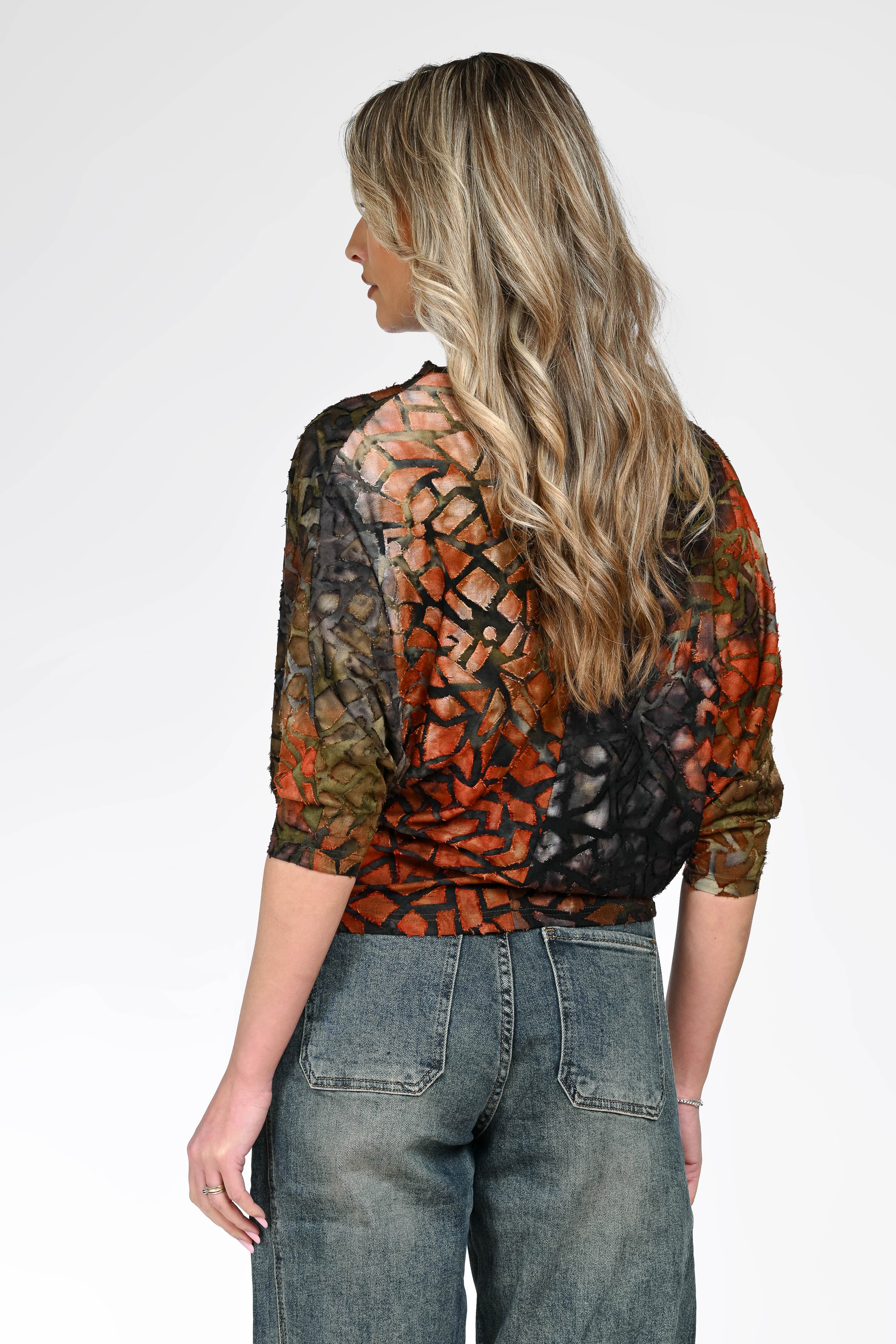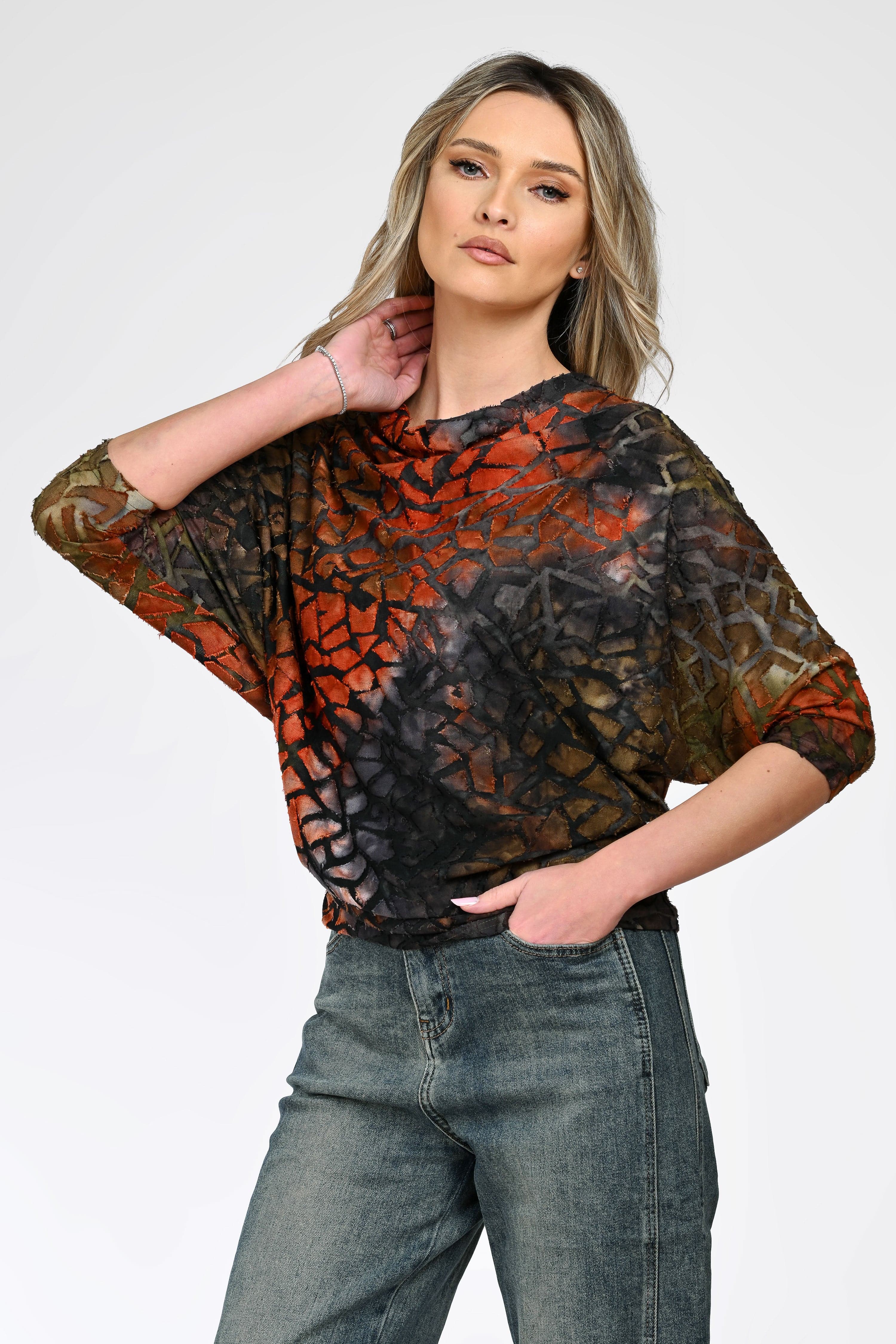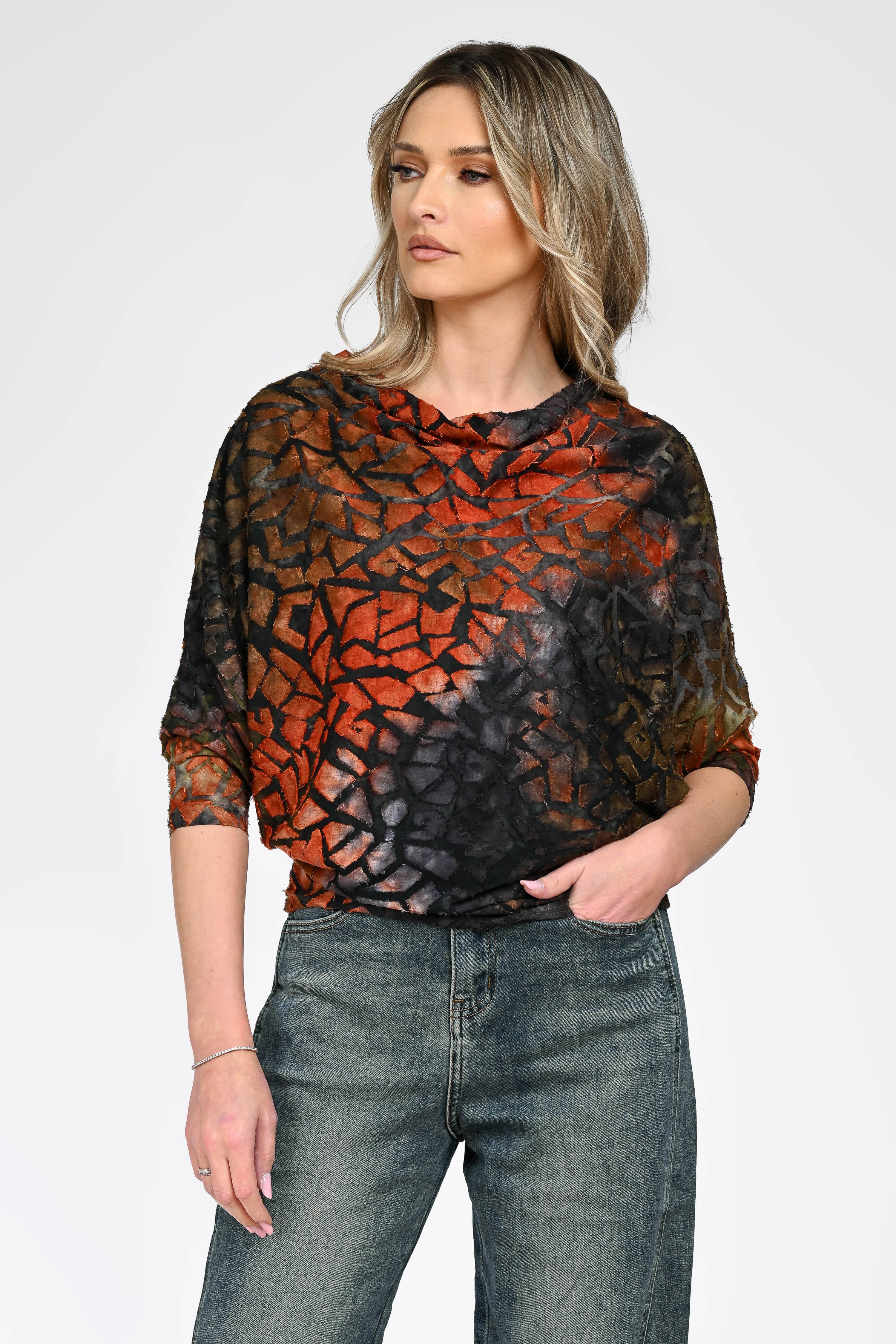 Bluza Vanessa impresionează prin imprimeul artistic multicolor, cu accente calde de arămiu, verde și negru, care adaugă personalitate oricărei ținute. Designul cu falduri discrete în zona decolteului creează un efect elegant și feminin, iar croiul lejer oferă confort și libertate de mișcare.
