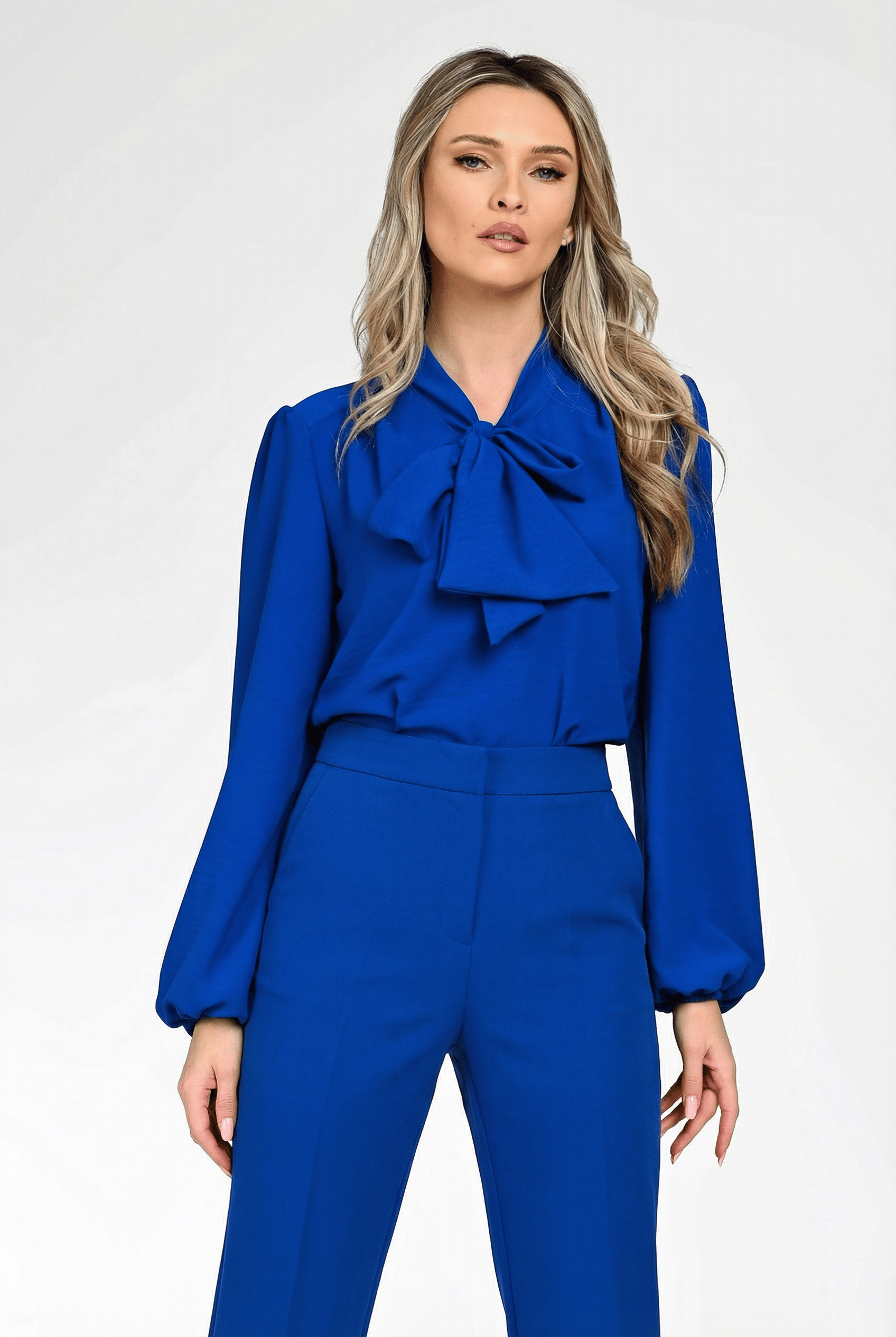 Bluza Diana atrage prin nuanța intensă de albastru regal și designul feminin, ideal pentru ținute office sau elegante. Detaliul tip fundă la gât adaugă un aer sofisticat și rafinat, transformând piesa într-un element statement al ținutei. Croiul lejer oferă confort, iar mânecile lungi, ușor bufante, sunt finisate cu manșete elastice pentru o purtare plăcută pe tot parcursul zilei.