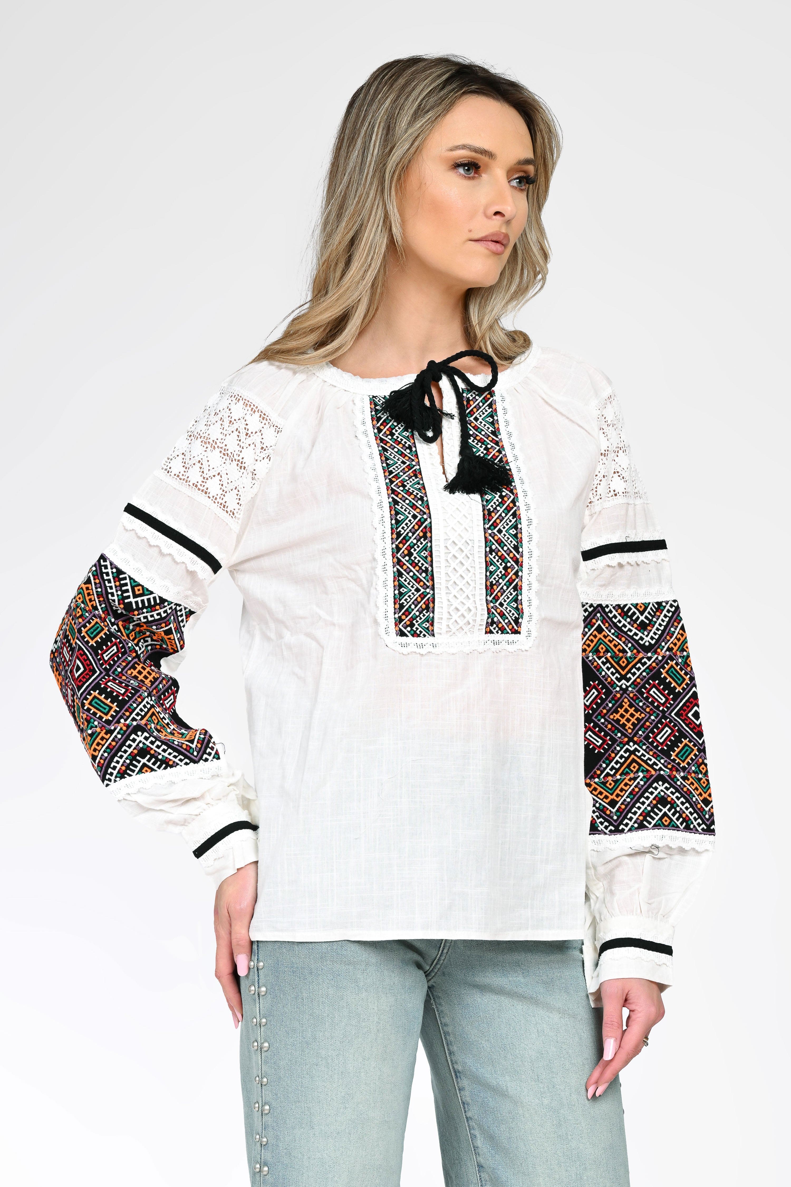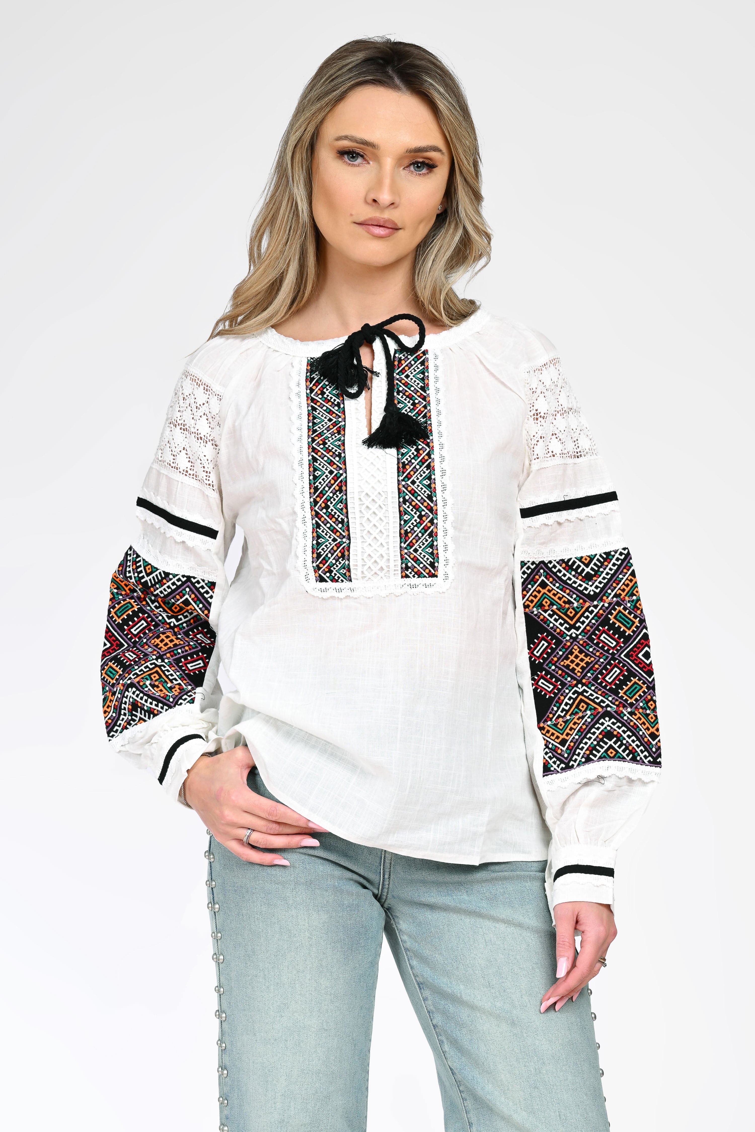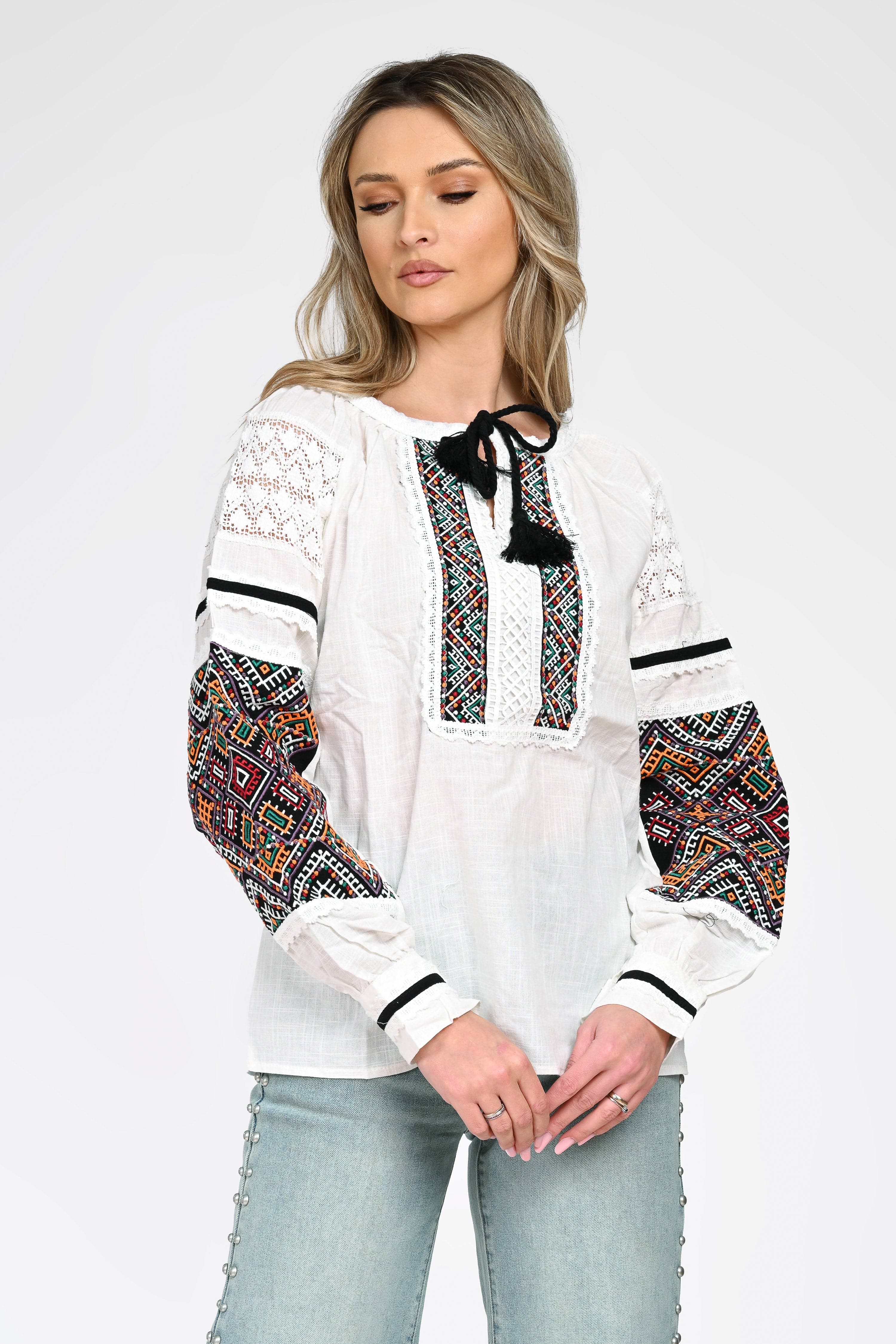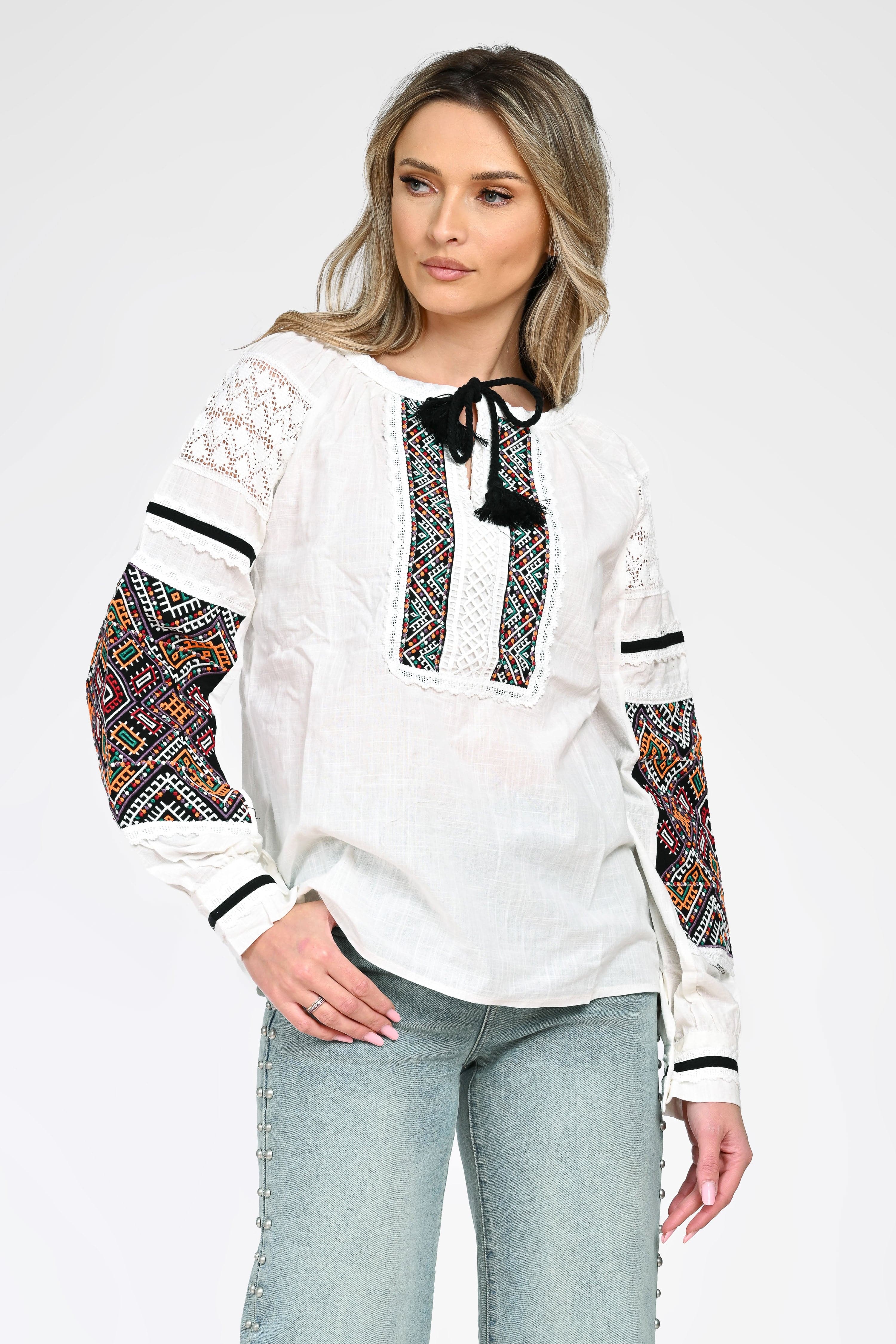Modelul are decolteu cu șnur decorativ și ciucuri, detalii din dantelă fină și mâneci lungi, ușor bufante, care oferă un plus de feminitate. Croiala lejeră asigură confort și libertate de mișcare, făcând această ie o piesă versatilă, ușor de integrat în ținute casual sau cu accent etnic.
