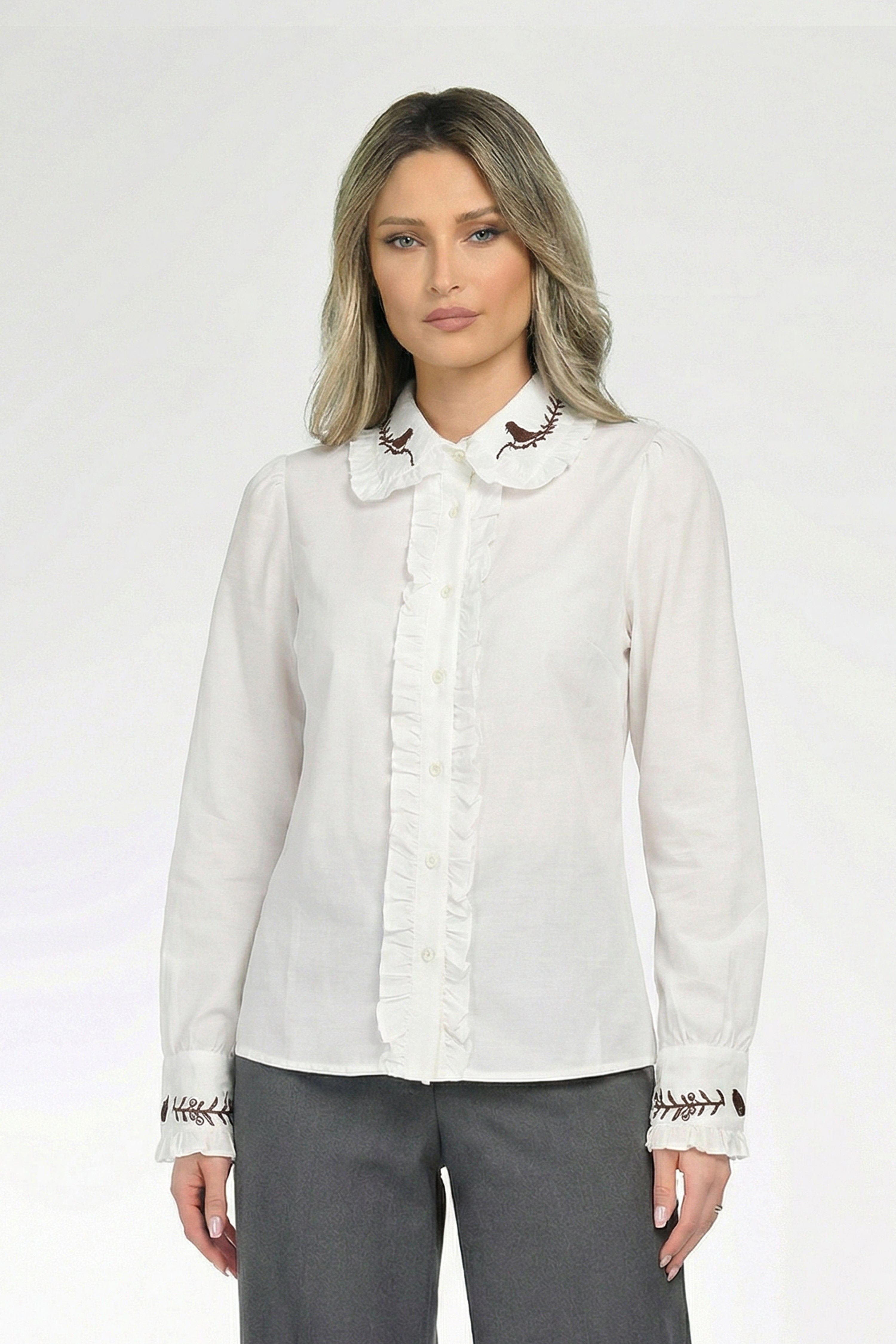 Are croială feminină, închidere frontală cu nasturi și volănaș delicat aplicat pe linia de închidere, oferind un aer romantic și sofisticat. Se asortează perfect cu pantaloni eleganți, fuste sau jeanși pentru un look versatil.
