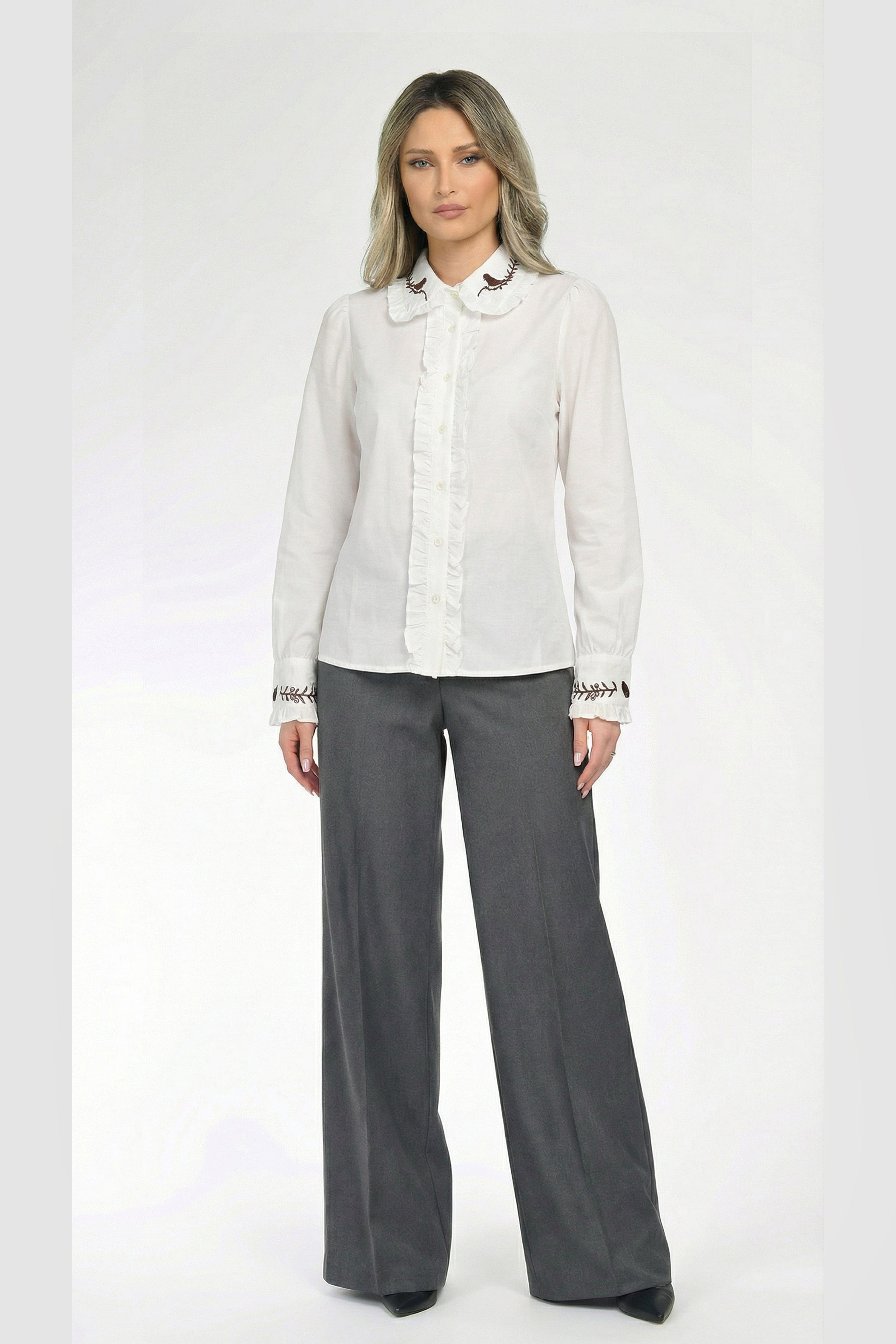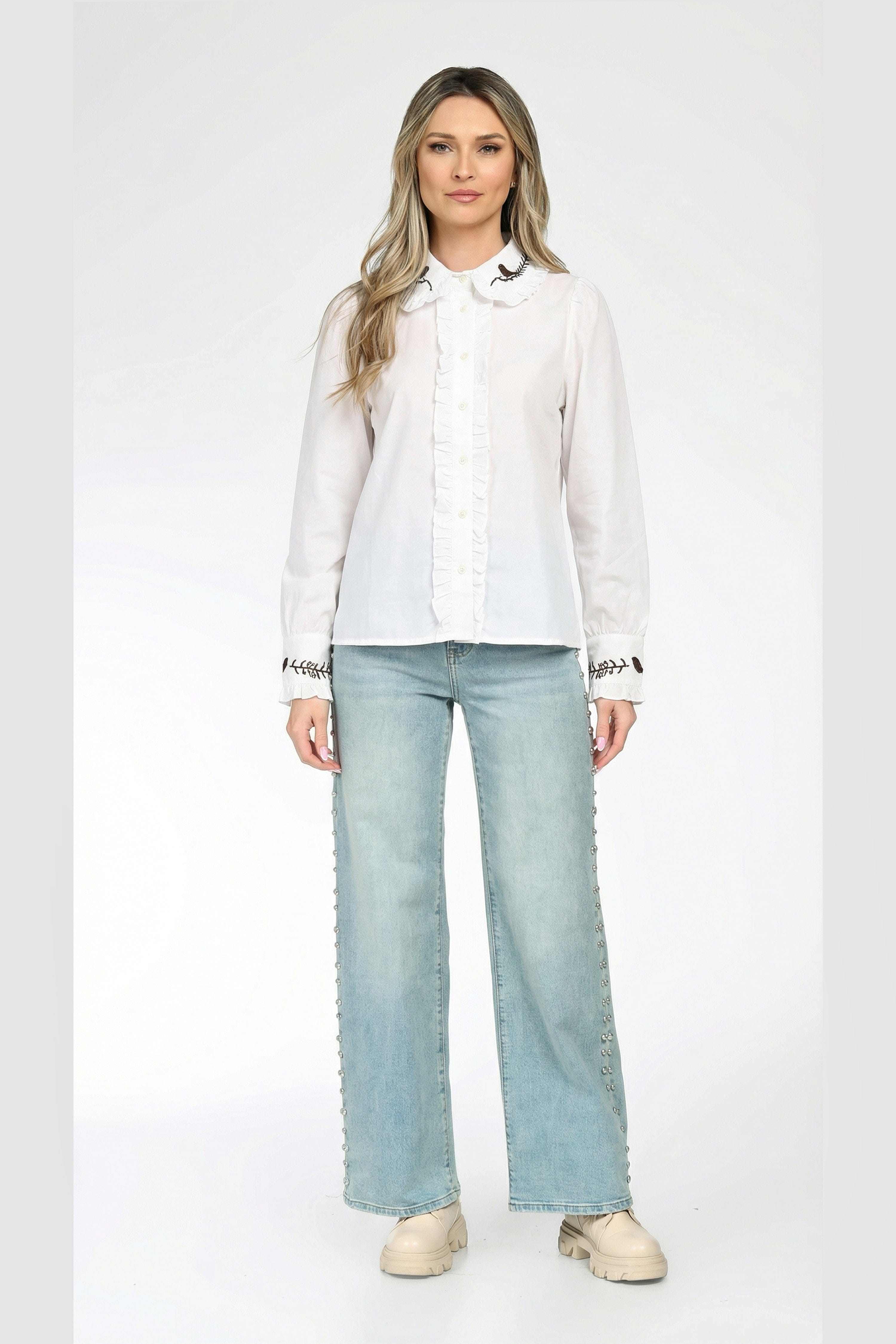 Cămașa damă Roxana este realizată din bumbac confortabil și respirabil, ideal pentru purtare zilnică sau ținute office elegante. Designul clasic este pus în valoare de detaliile brodate discrete de la guler și manșete, care adaugă un plus de rafinament și feminitate.