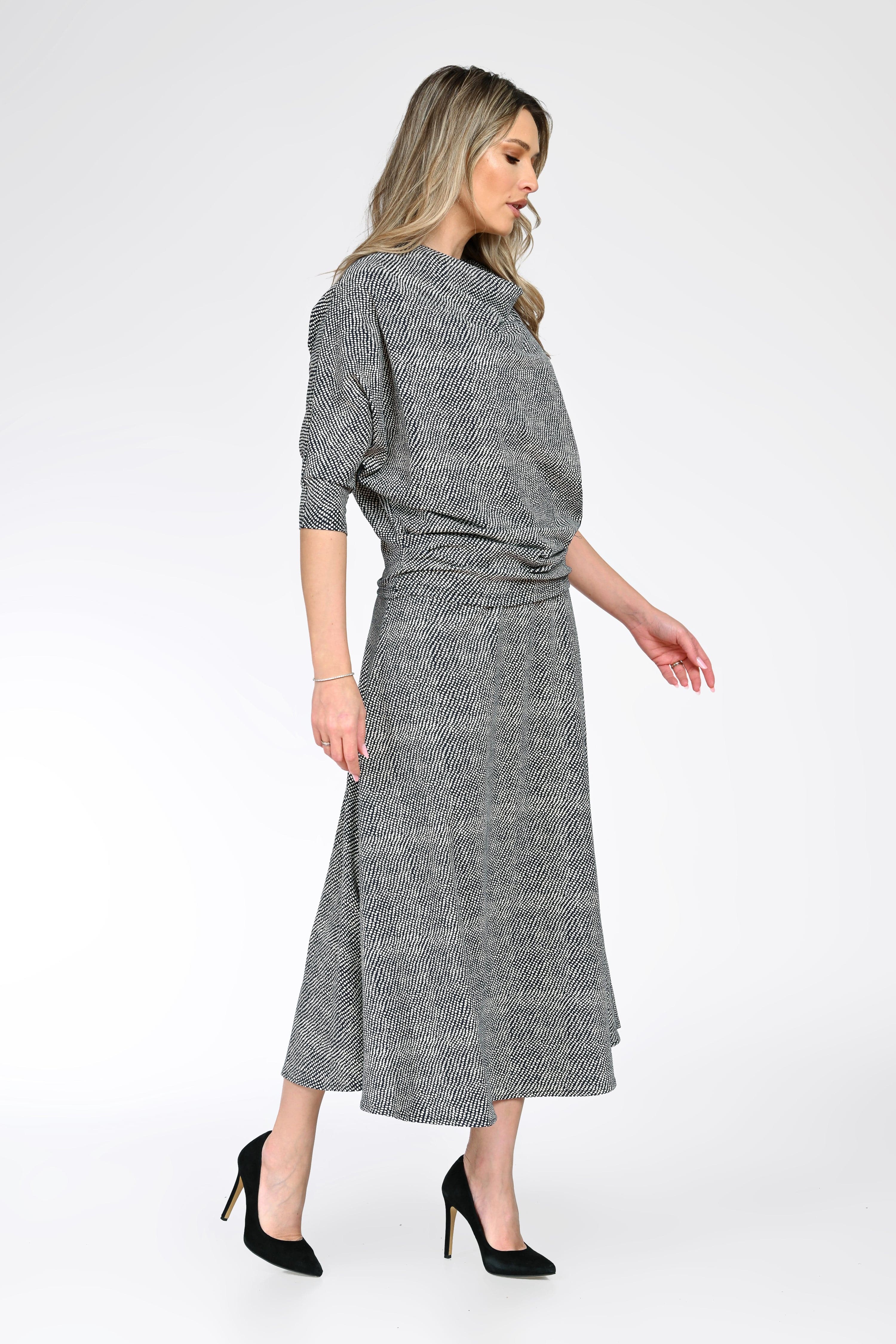 Compleul Mirela îmbină confortul materialelor naturale cu un design modern, fiind realizat din bumbac cu elastan, plăcut la purtare și ușor elastic. Setul este compus din bluză cu croi lejer, decolteu tip drapaj și mâneci trei sferturi, și fustă midi evazată, care oferă libertate de mișcare și o siluetă echilibrată.