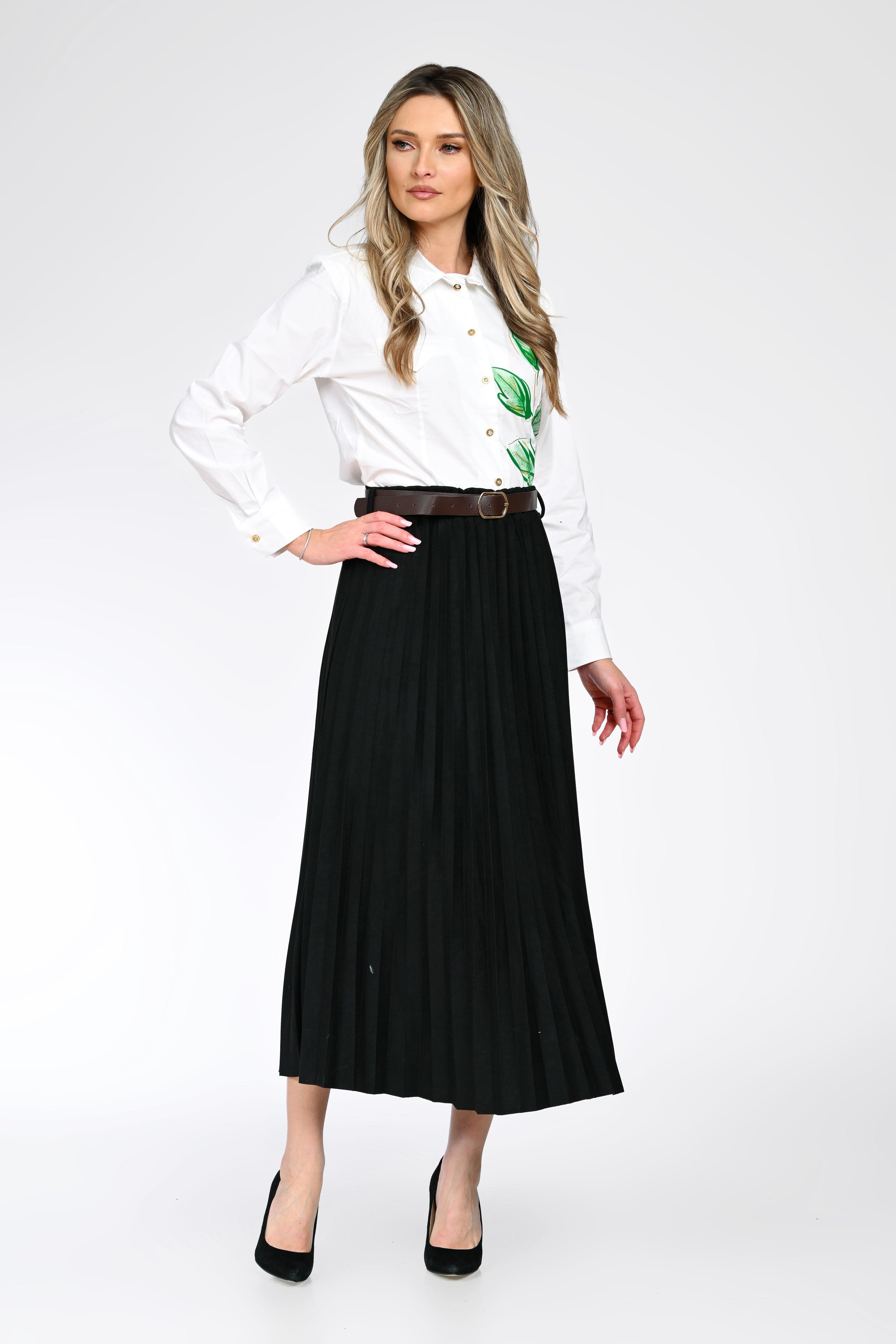 Fusta Elena este alegerea ideală pentru ținute elegante sau office, datorită croiului plisat și lungimii midi, care avantajează orice siluetă. Realizată dintr-un material lejer, cu cădere fluidă, această fustă oferă libertate de mișcare și un plus de rafinament. Talia este accentuată cu o curea subțire, detașabilă, ce conturează frumos linia corpului.