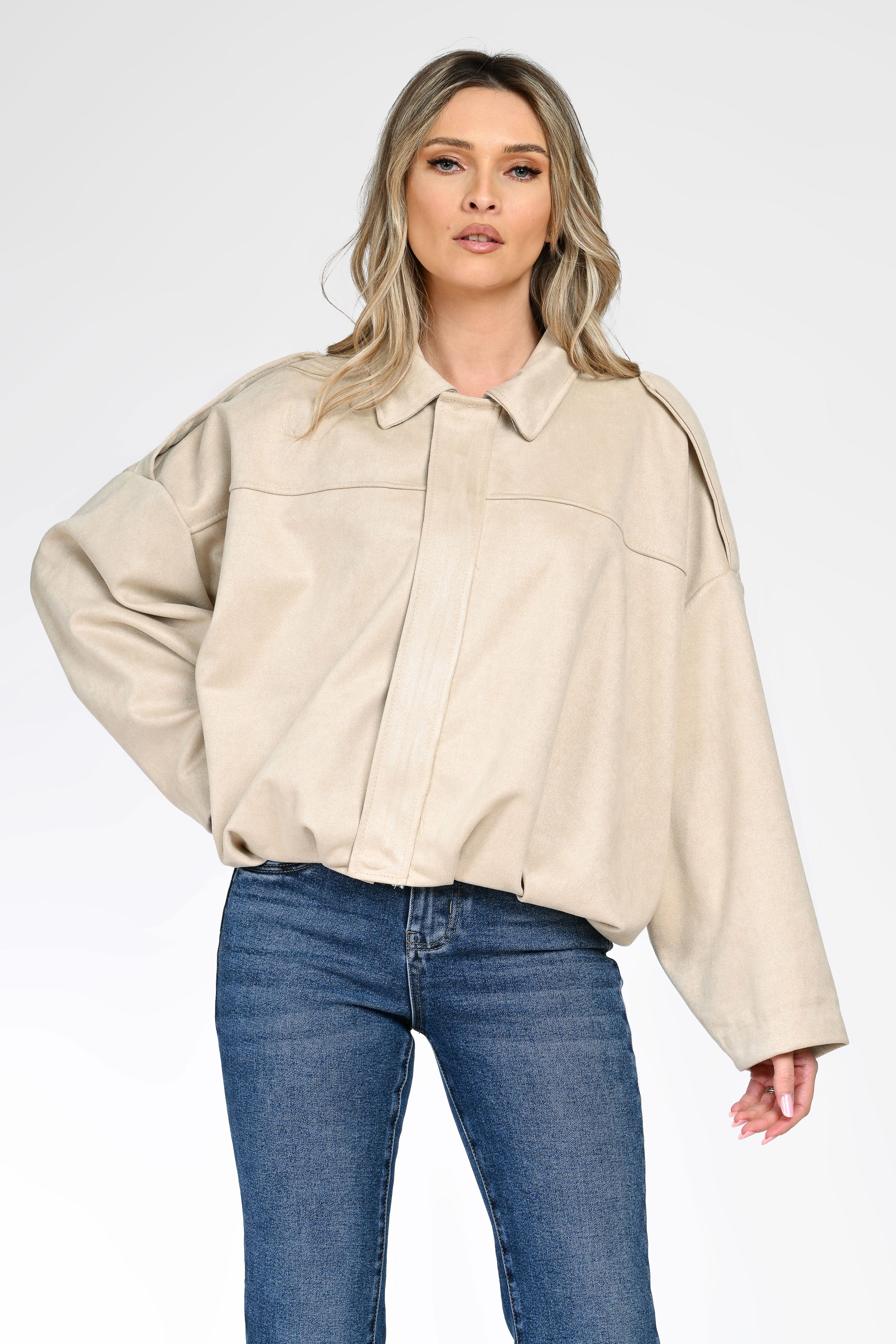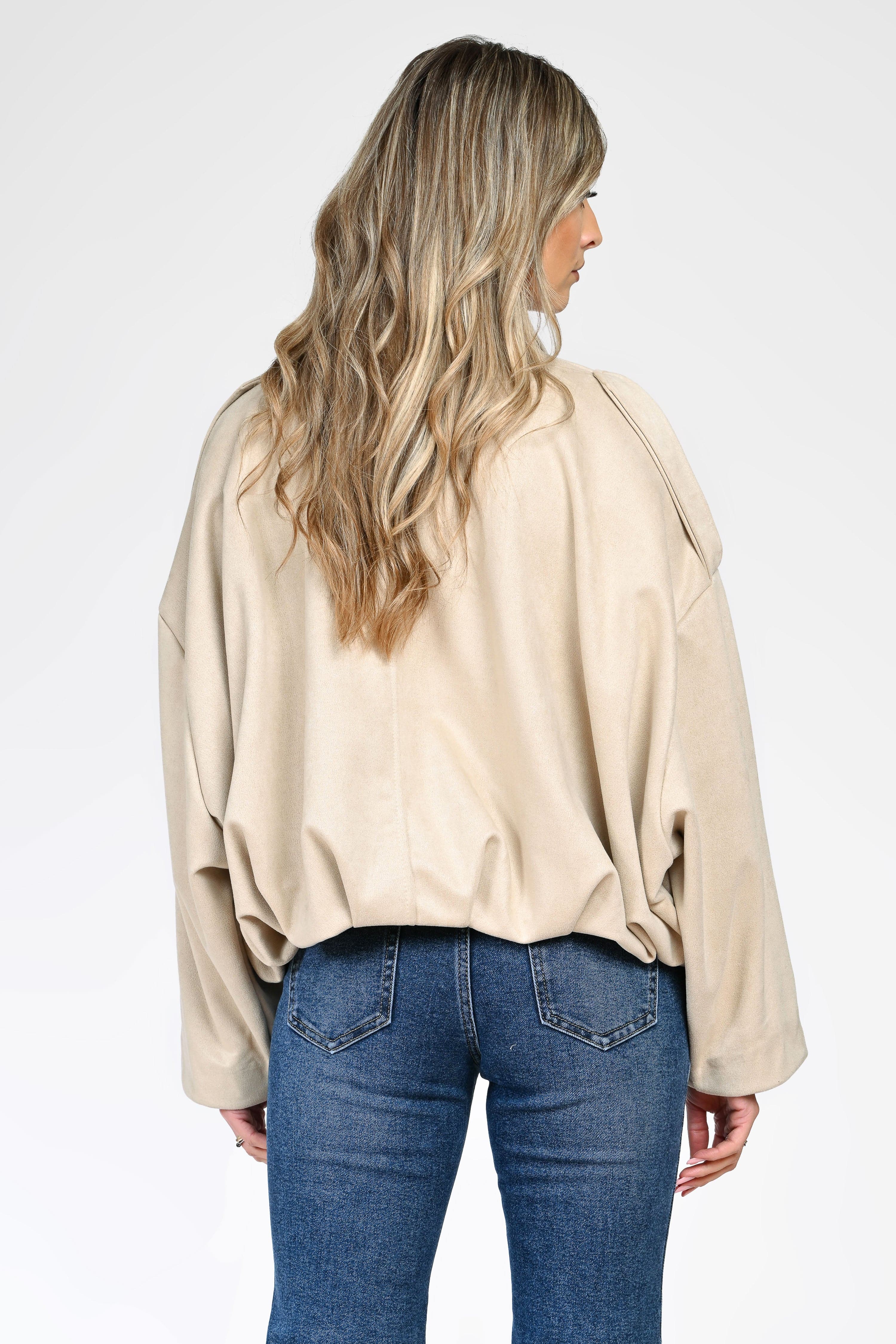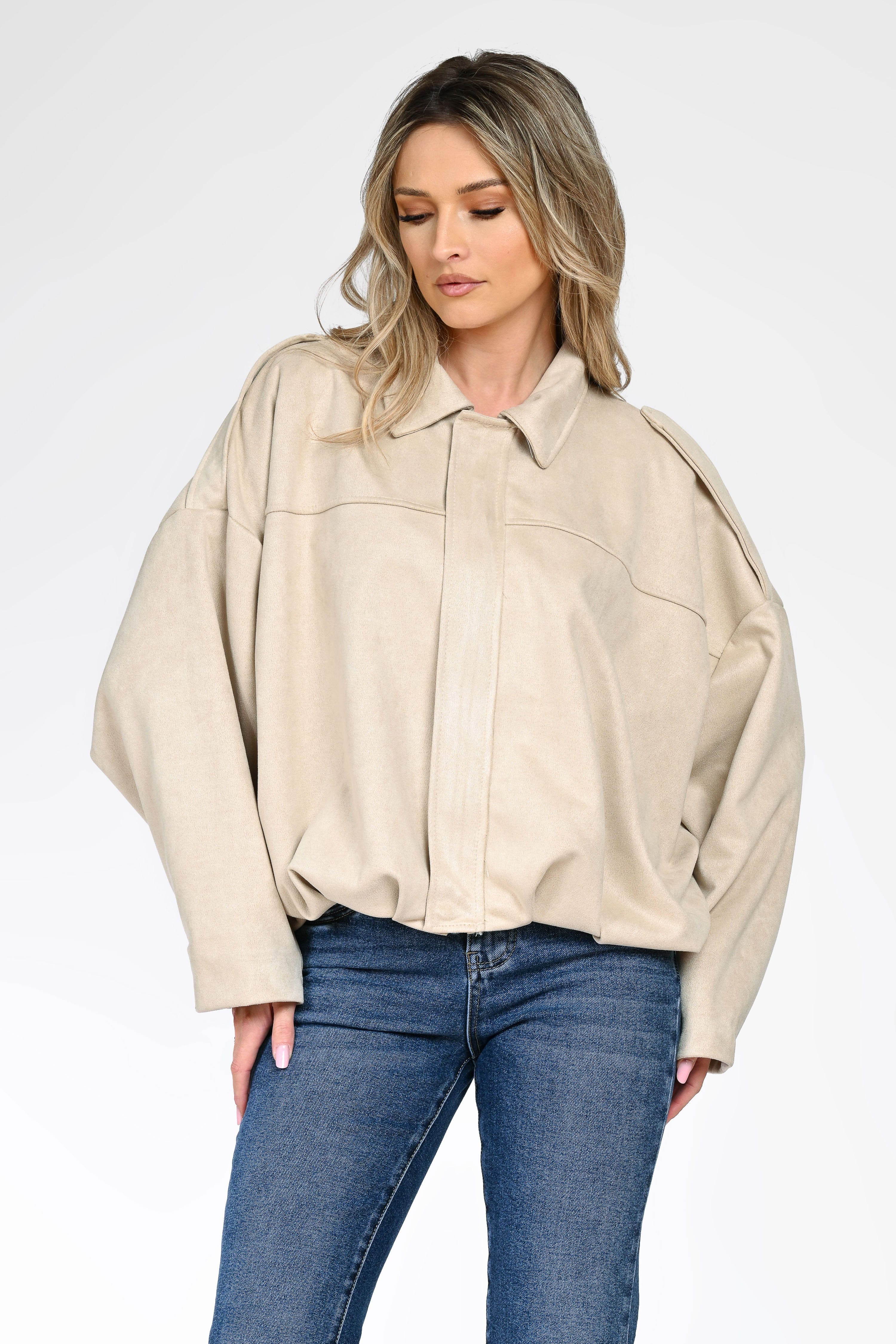 Jachetă damă bej, cu design minimalist și croială lejeră, ce oferă un look modern și rafinat. Modelul are guler clasic, mâneci ample și închidere frontală ascunsă, pentru un aspect curat și elegant.
