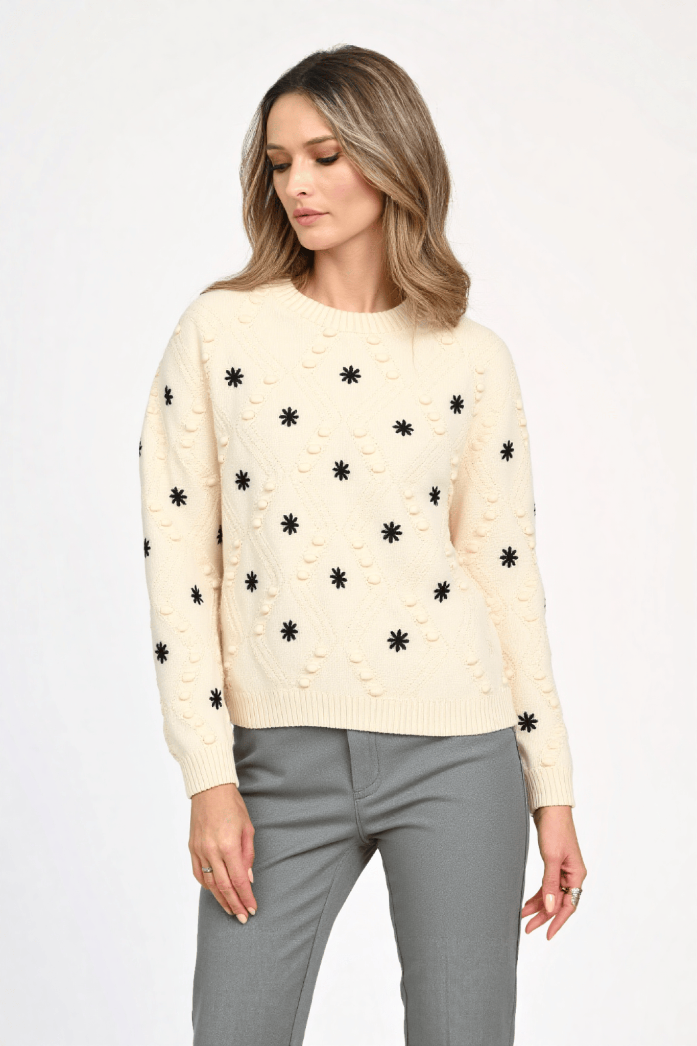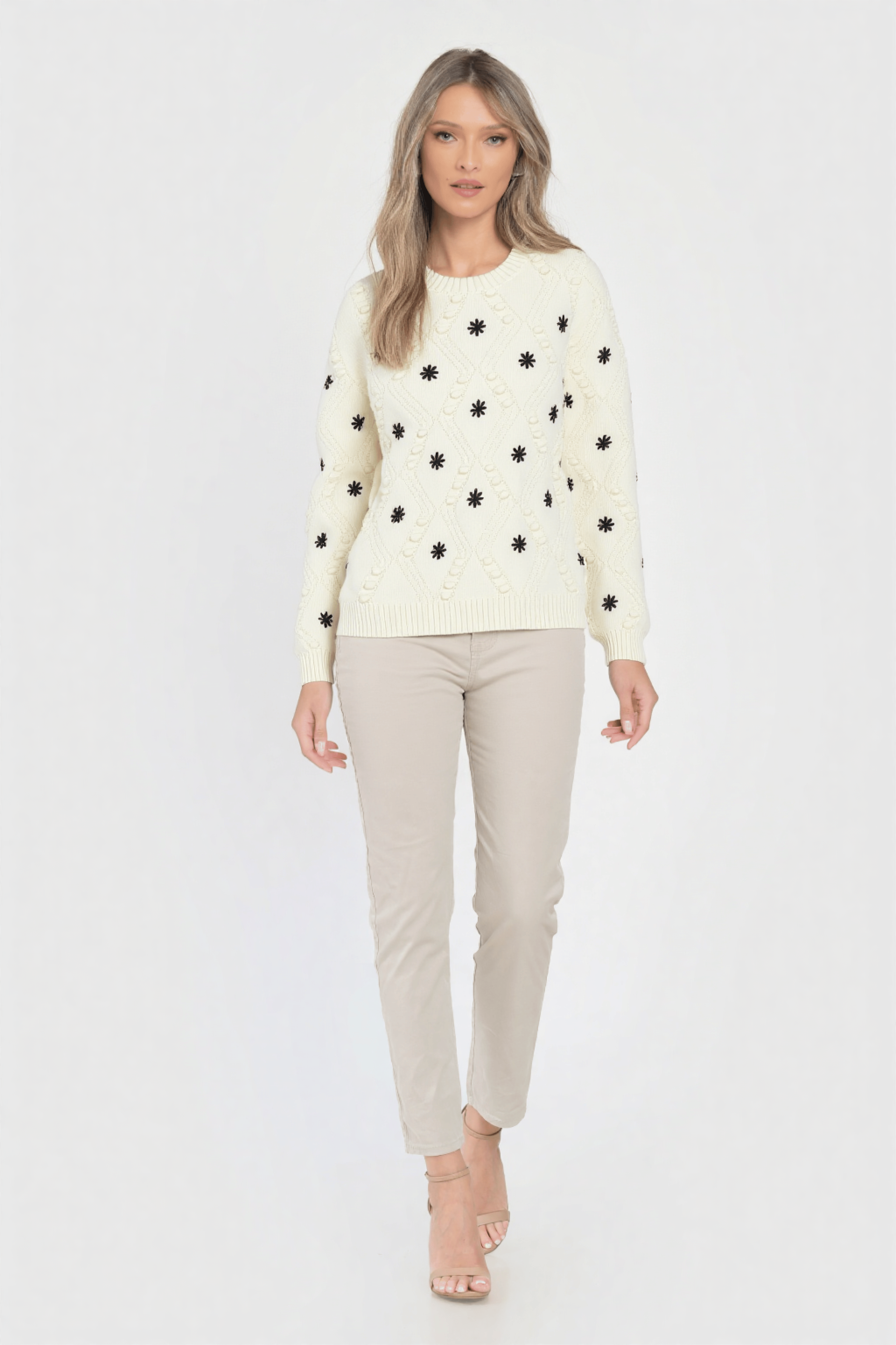 Pulover crem Mara din tricot moale, cu model texturat în romburi și aplicații de buline, decorat cu broderii florale negre. Are croială lejeră, manșete și tiv elastic pentru un plus de confort. Ideal pentru ținute casual de sezon, oferind un look feminin și modern.