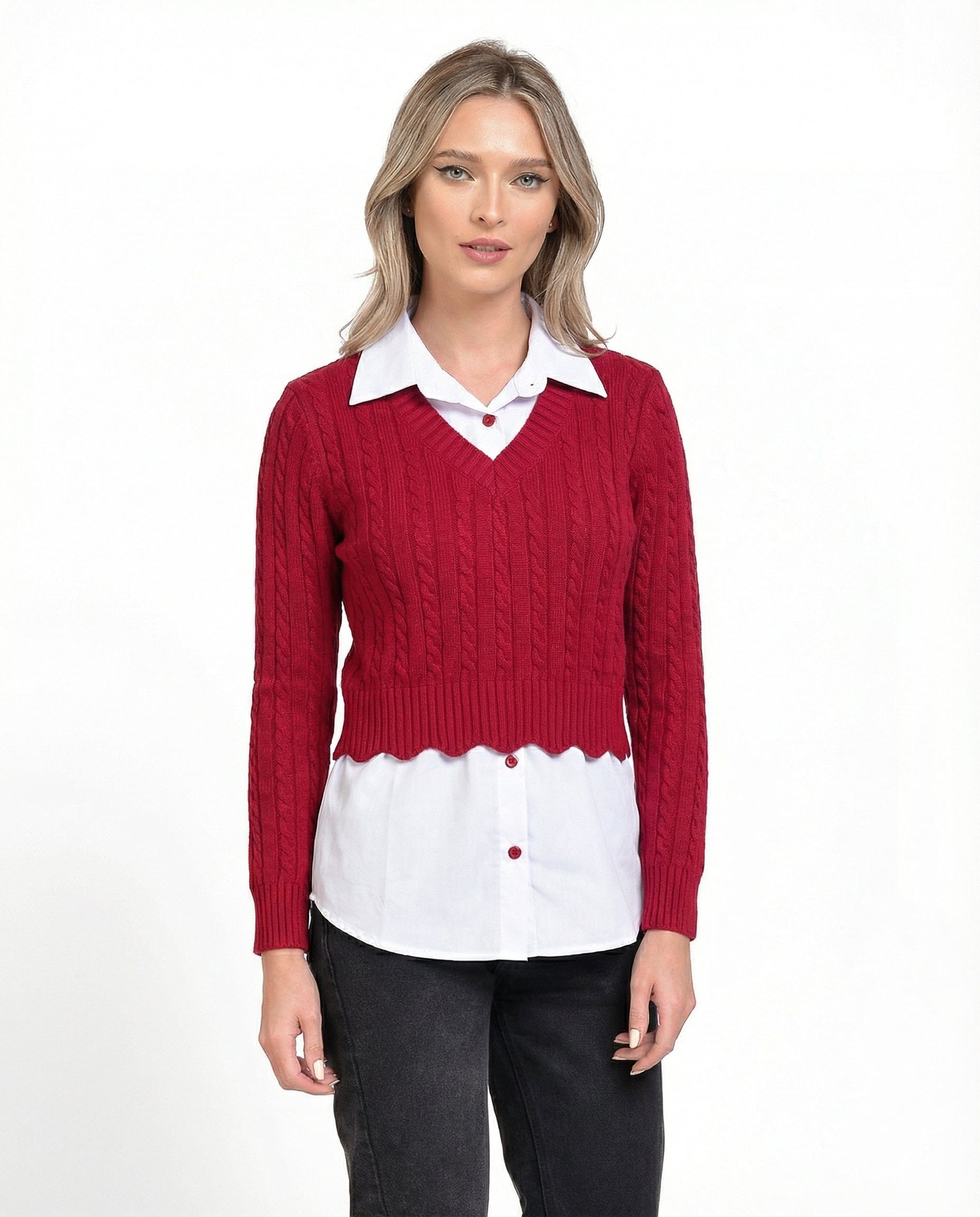 Pulover damă 2-în-1 Adina cu cămașă integrată, realizat într-o combinație practică și elegantă, ideală pentru ținute moderne de zi. Partea superioară este un pulover tricotat, de culoare roșu intens, cu model discret tip torsadă și decolteu în V, care evidențiază frumos zona gâtului.