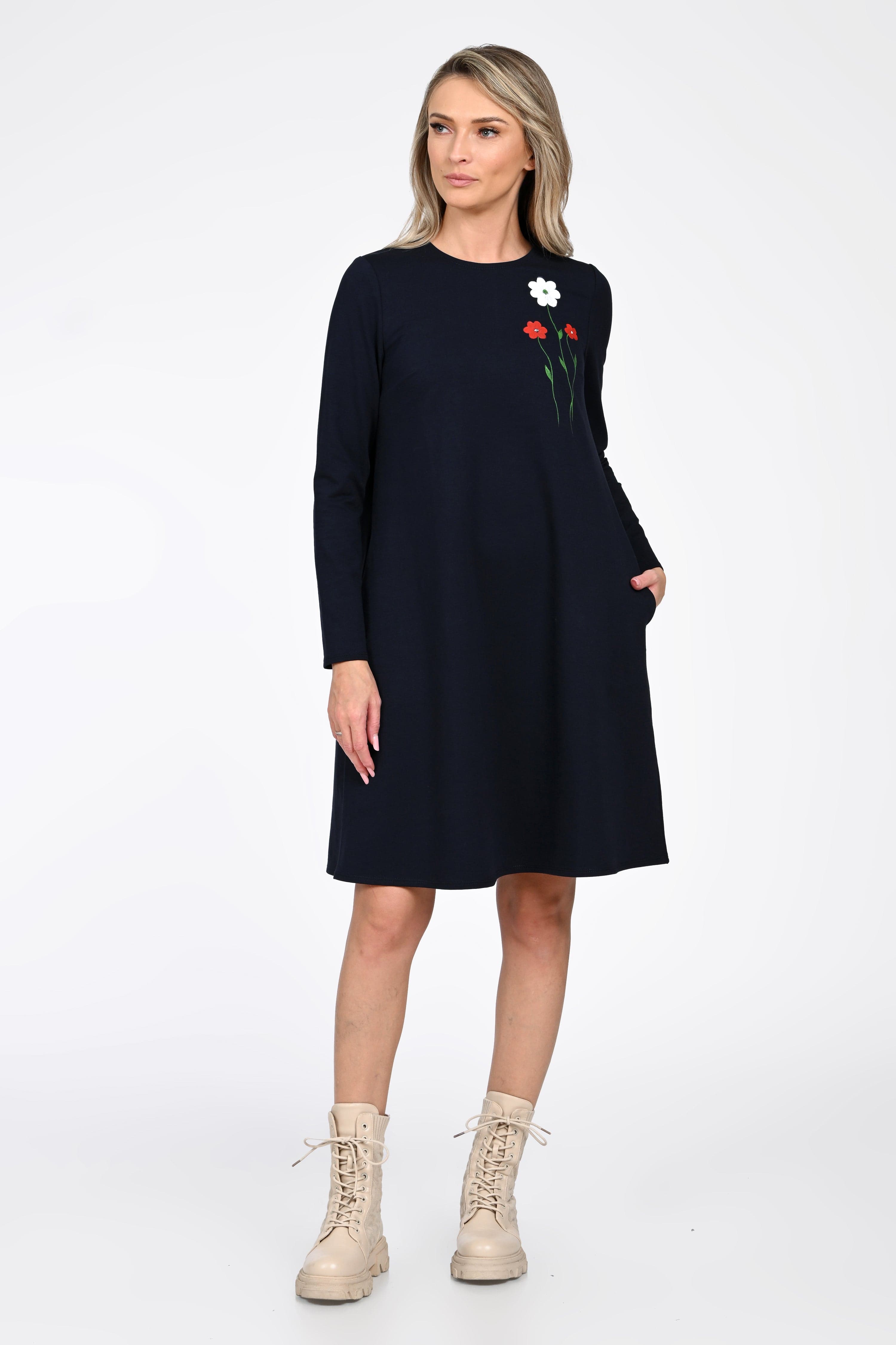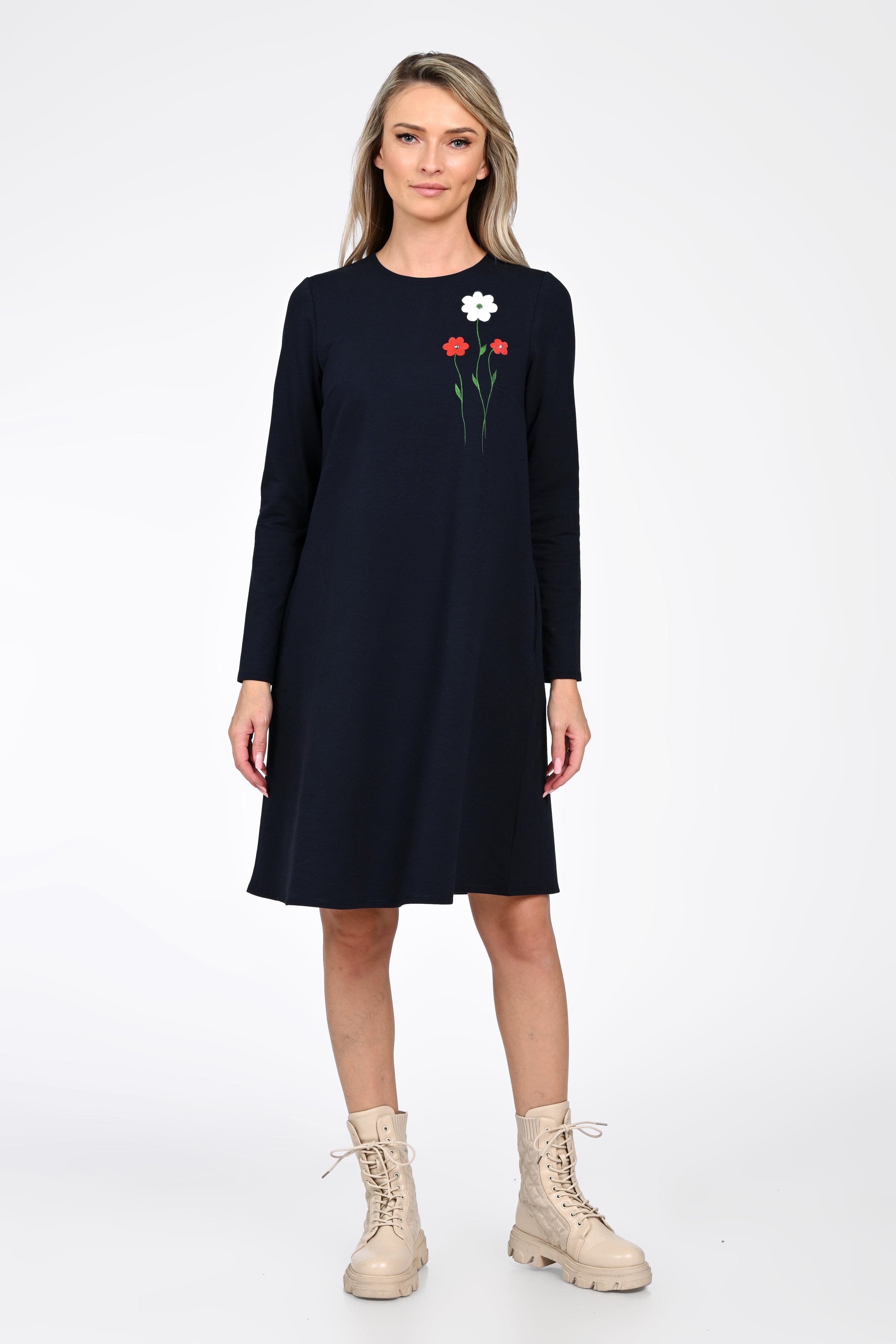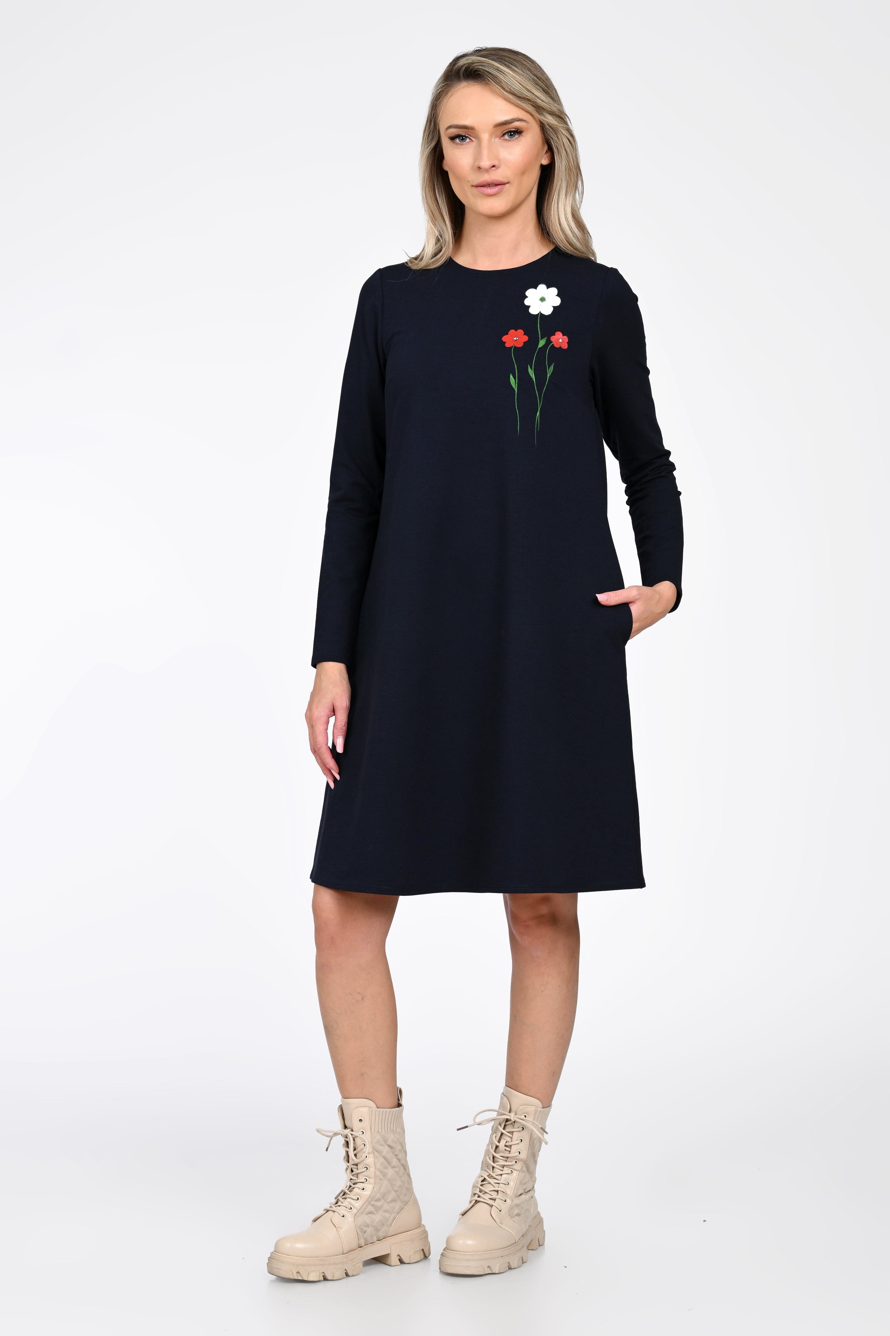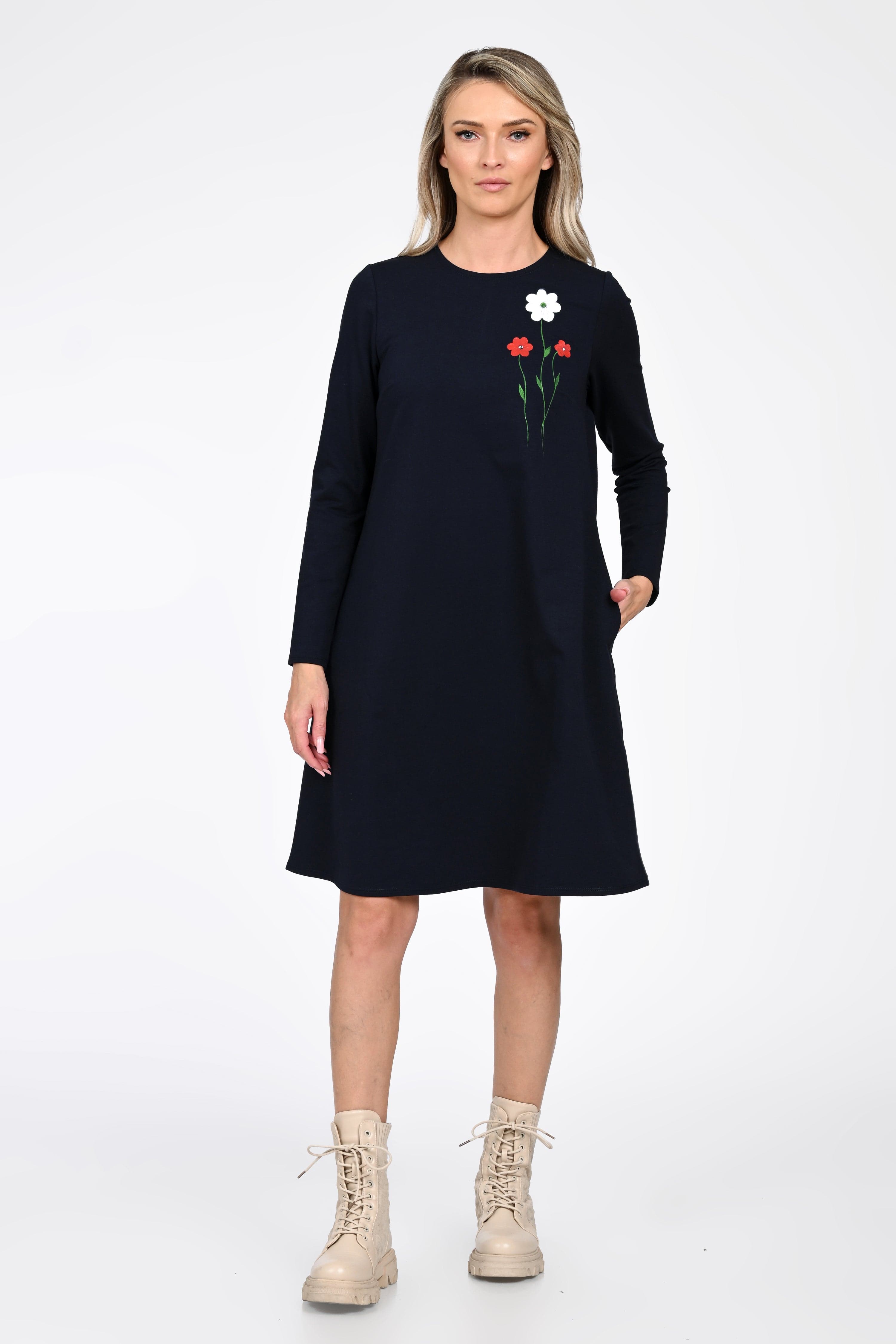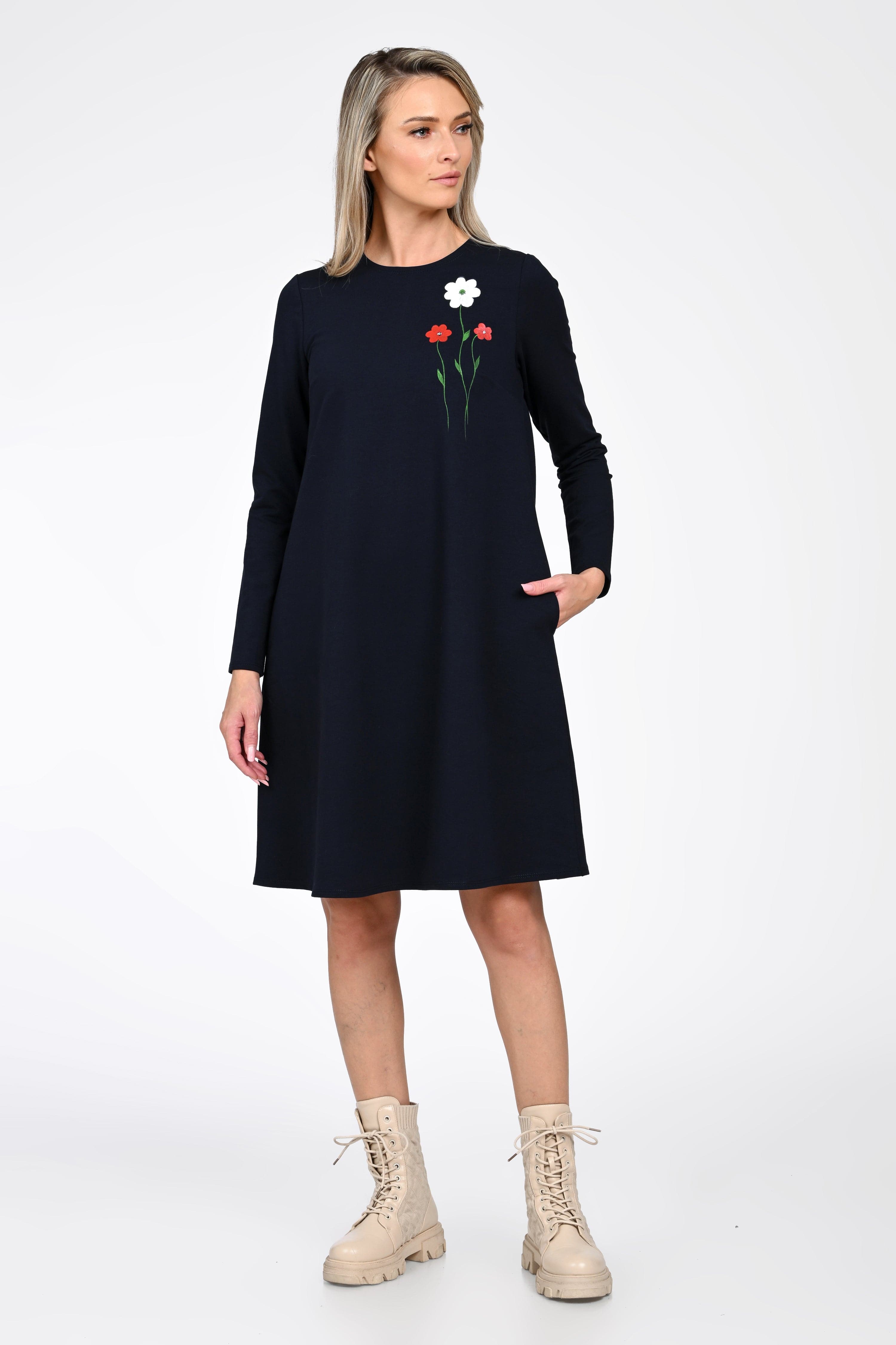 Croiala evazată avantajează orice tip de siluetă, iar buzunarele laterale adaugă un plus de funcționalitate—perfecte pentru un look relaxat, dar atent construit. Broderia florală plasată în partea superioară aduce un detaliu discret și elegant, transformând rochia într-o piesă versatilă pentru mers la birou, plimbări sau întâlniri casual.