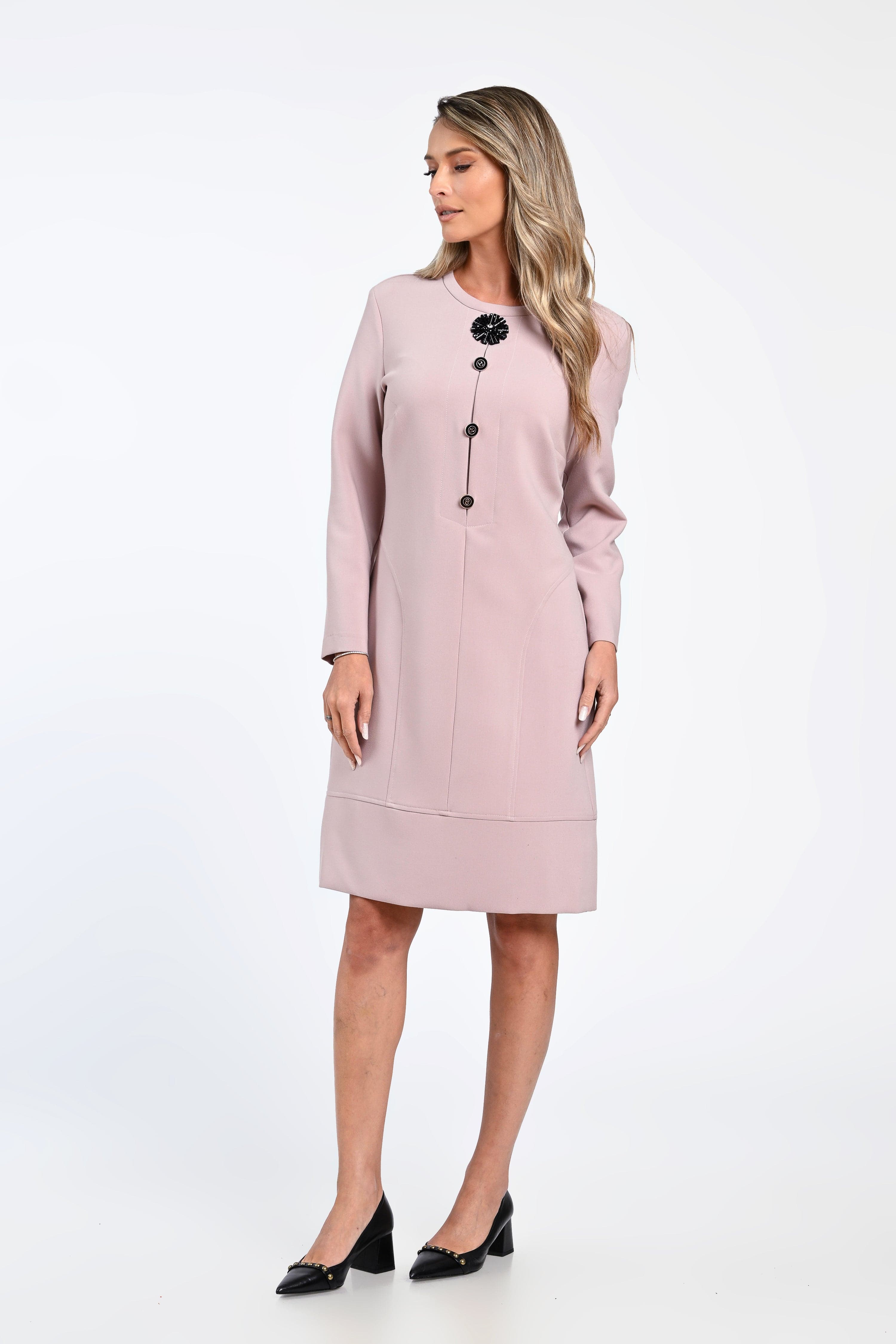 Rochie elegantă roz pudră cu nasturi decorativi și floare aplicată – rochia Elise