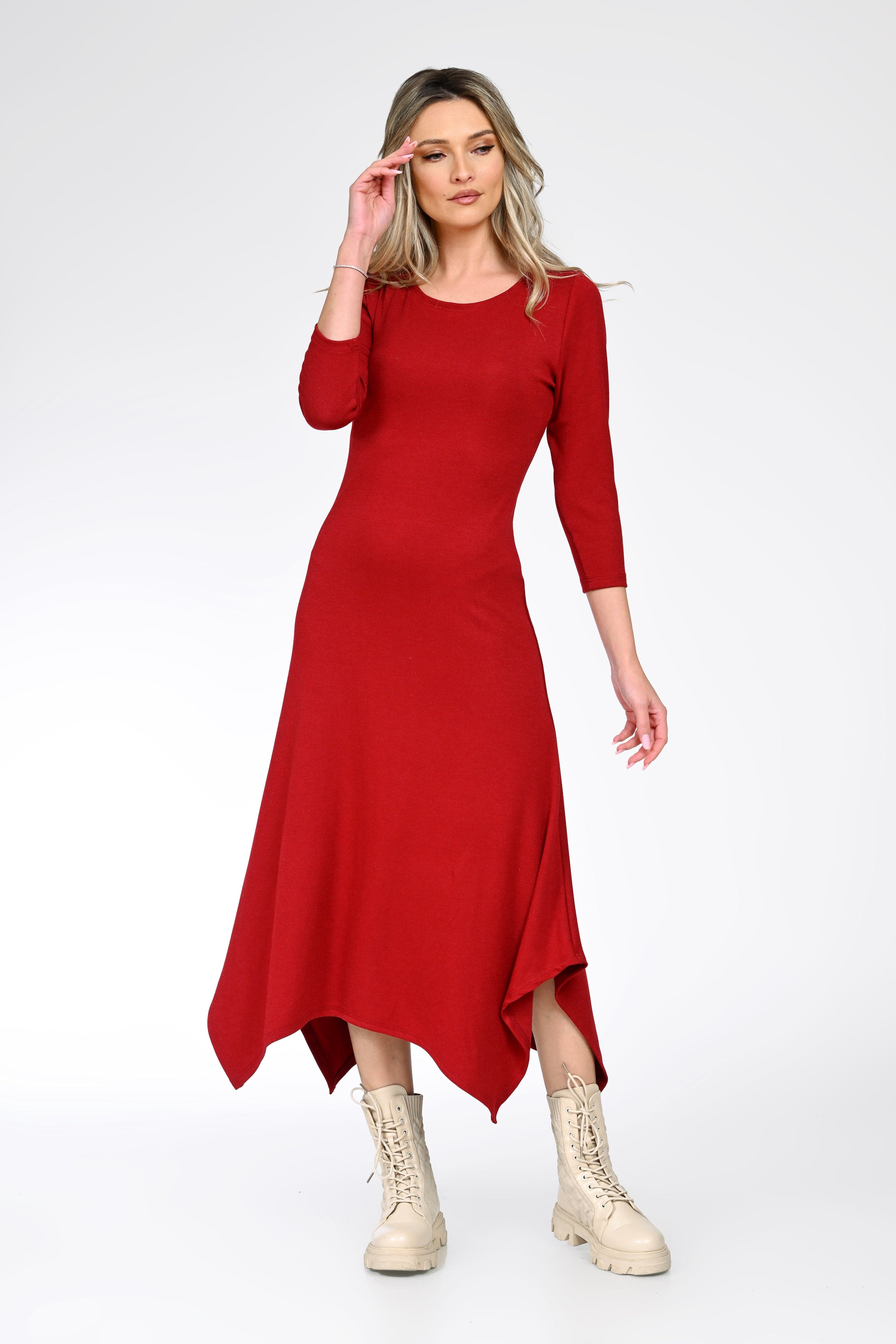 Amelia este o rochie midi cu design asimetric, într-o nuanță intensă de roșu, creată pentru apariții moderne și feminine. Croiala lejer evazată avantajează silueta, iar terminația asimetrică adaugă un accent contemporan, ideal pentru ținute casual-elegante sau urbane.