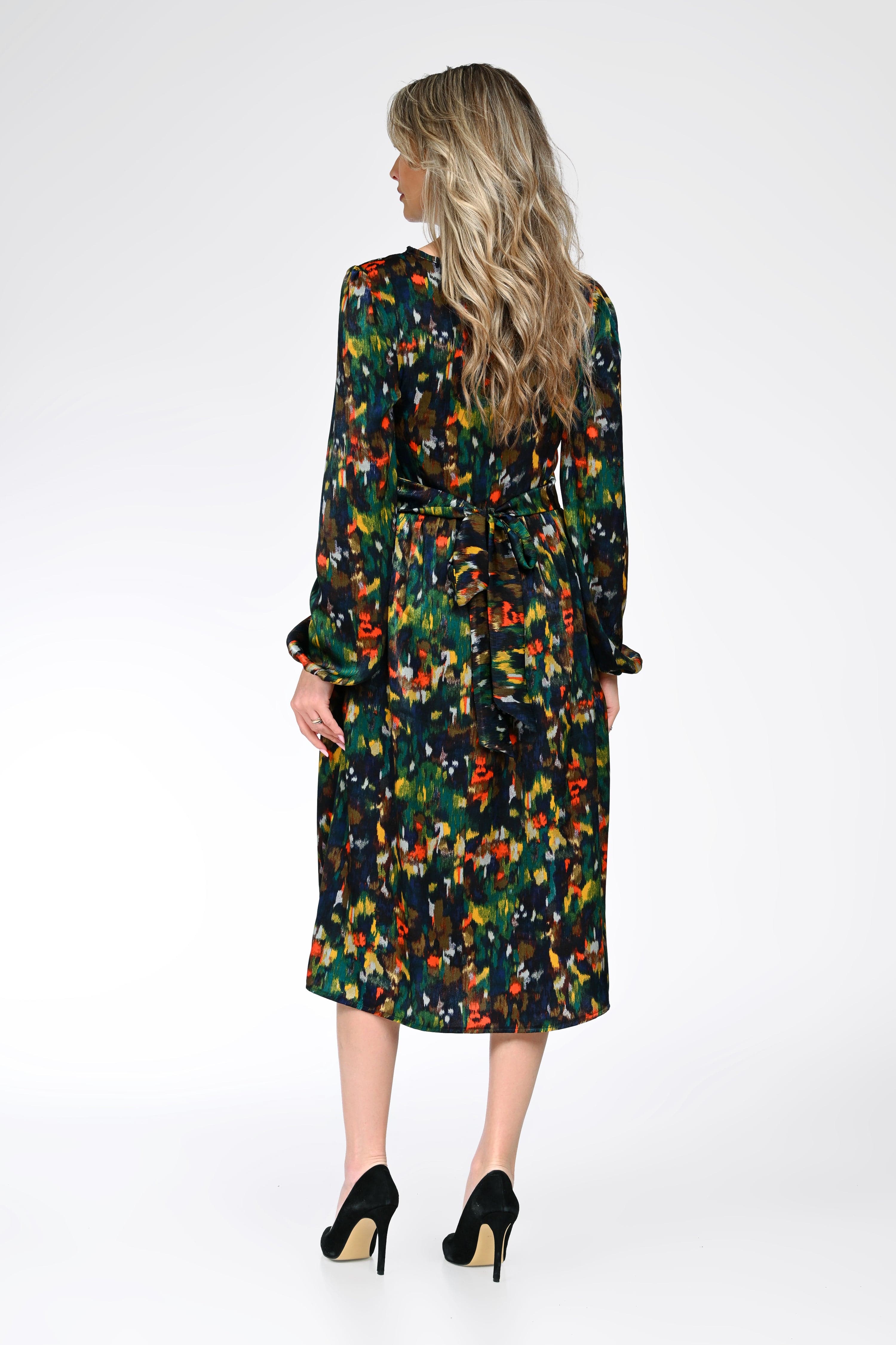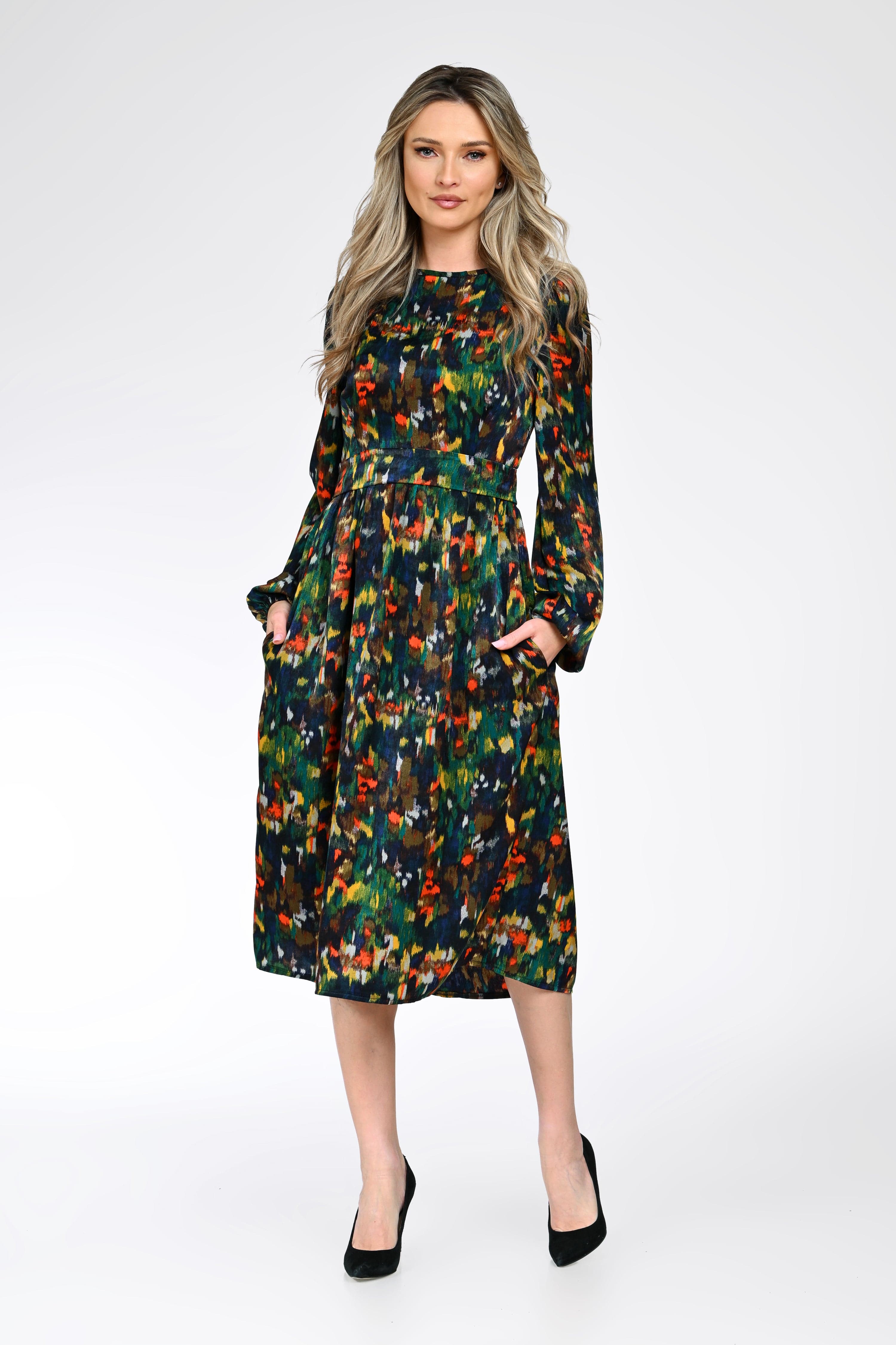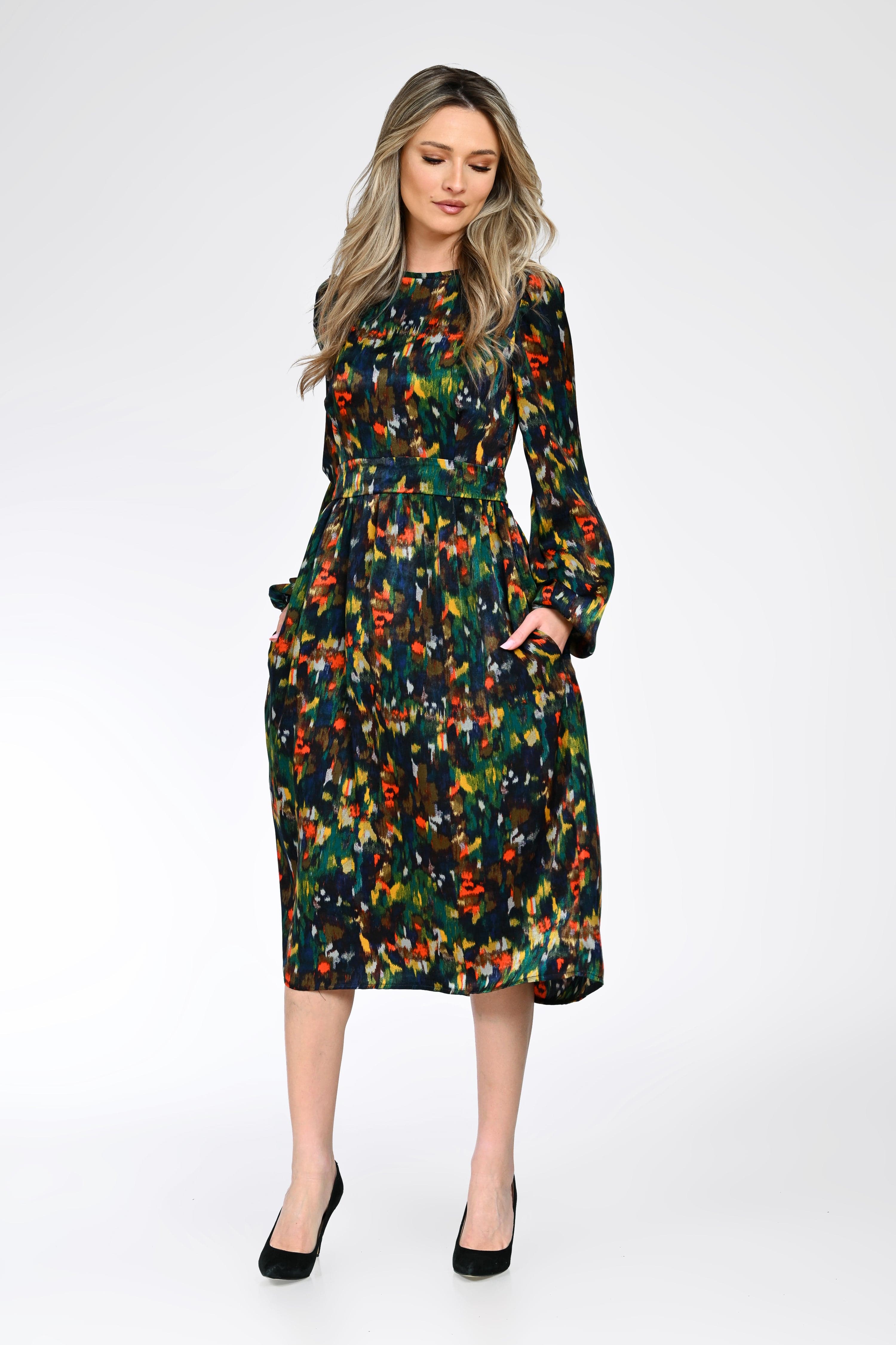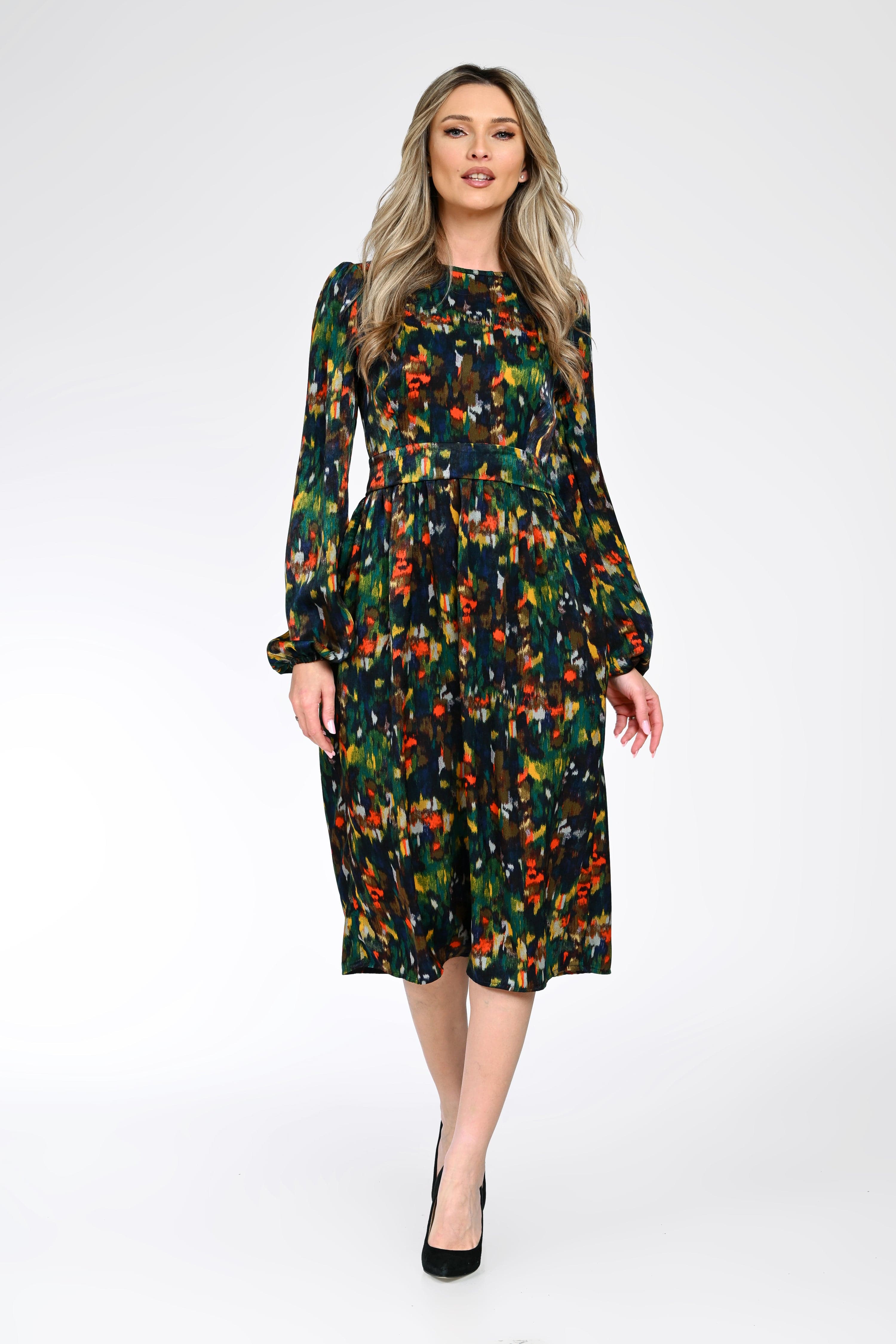 Elena este o rochie midi feminină, cu un imprimeu abstract în nuanțe vibrante, ideală pentru ținute elegante de zi sau ocazii speciale. Croiala lejeră, cu creț în talie, evidențiază silueta într-un mod natural și confortabil, oferind libertate de mișcare pe tot parcursul zilei.