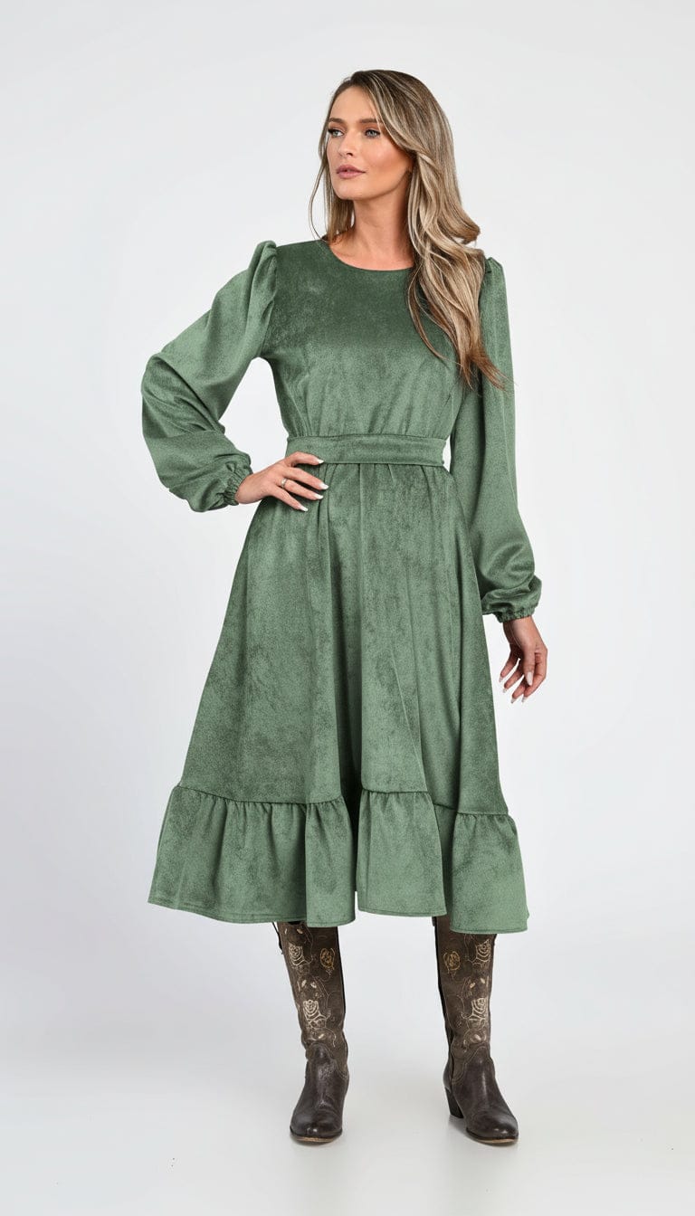 Rochia verde din raiat Sofia este confecționată din raiat moale, într-o nuanță elegantă de verde. Are croială midi fluidă, talia evidențiată, mâneci lungi cu ușor volum și volan amplu la bază, oferind un look feminin și confortabil. Perfectă pentru ținute de zi sau apariții casual-elegante în sezonul rece.
