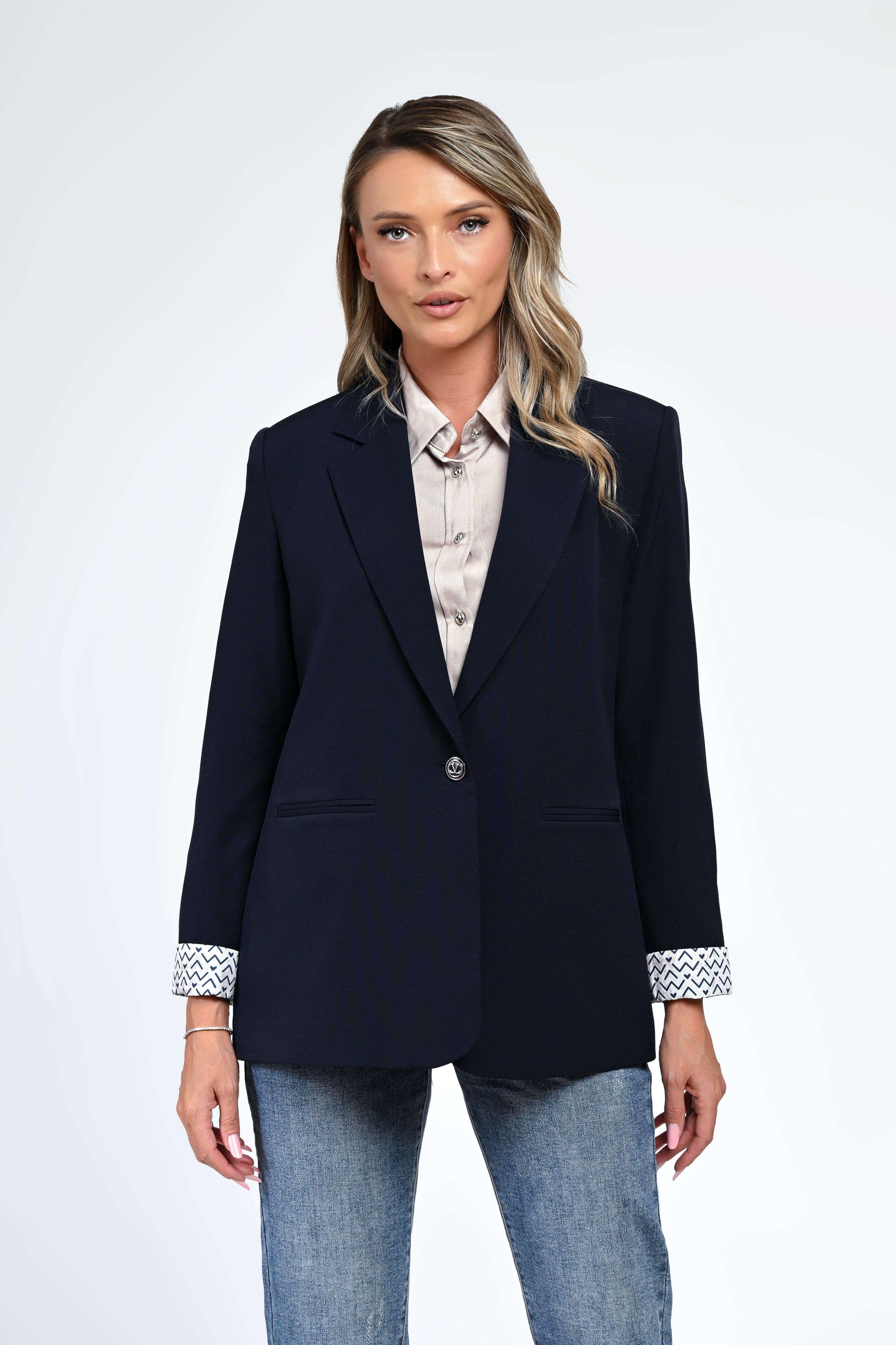 Sacou dama elegant Tina de culoare bleumarin închis, cu croială clasică, ușor cambrată, ce evidențiază silueta. Are un singur nasture frontal pentru închidere și două buzunare decorative, nefuncționale, care păstrează liniile curate ale designului. Revere sunt subțiri, cu un aspect modern. Un detaliu rafinat îl reprezintă manșetele răsfrânte, ce dezvăluie o căptușeală cu imprimeu geometric alb-negru, adăugând o notă de originalitate. Țesătura fină potrivită pentru ținute casual-smart sau office, iar lungimea sacoului ajunge aproximativ până sub șold, ceea ce îl face versatil și ușor de asortat.