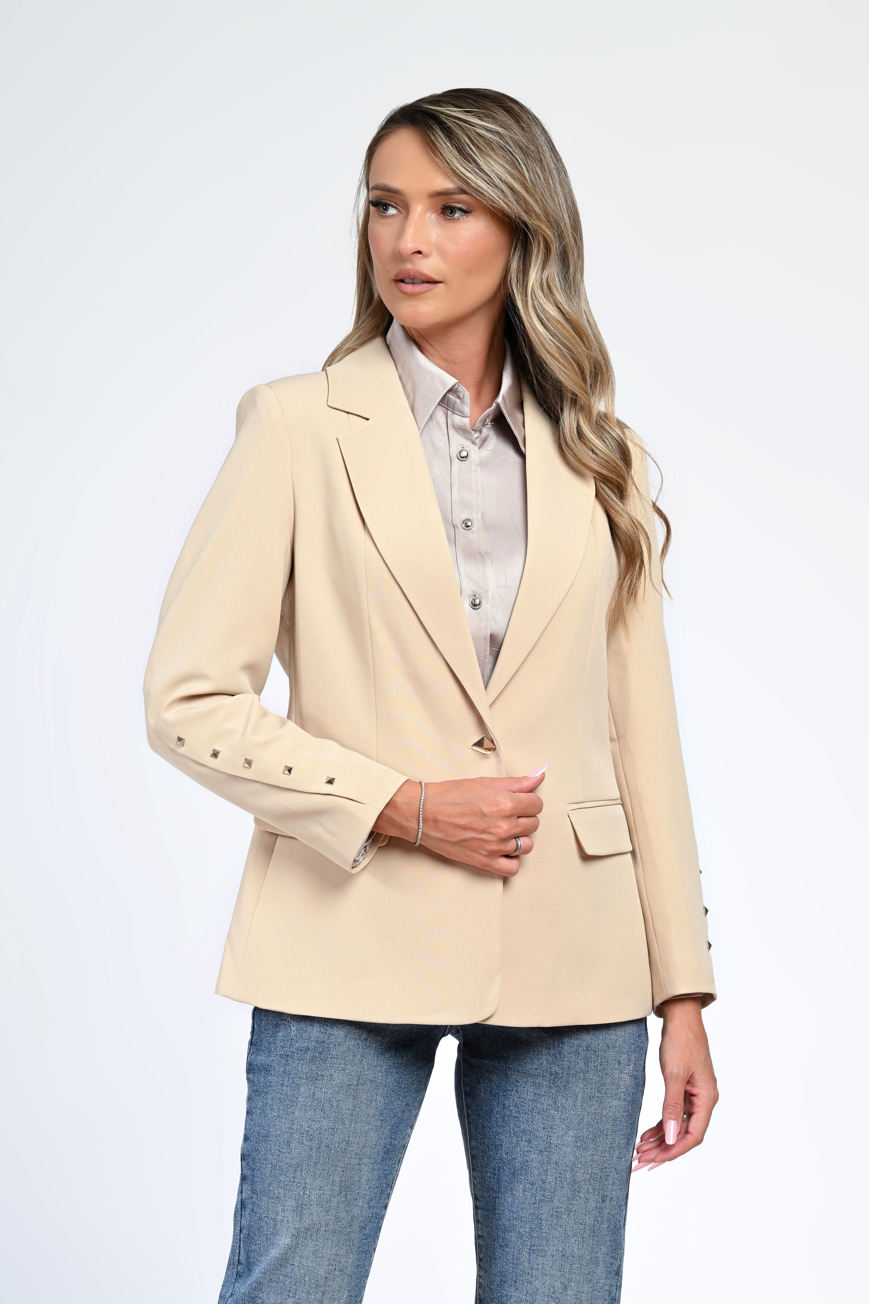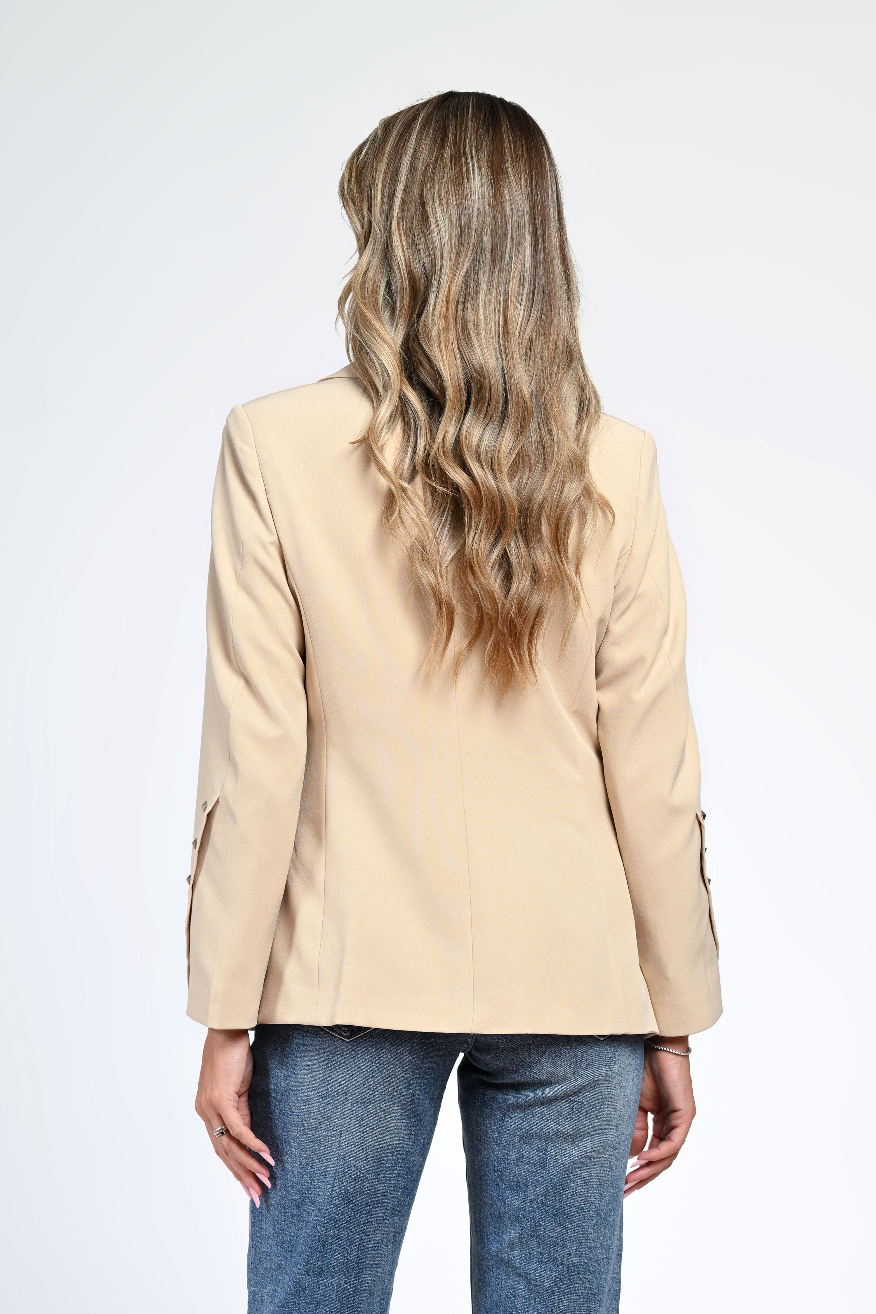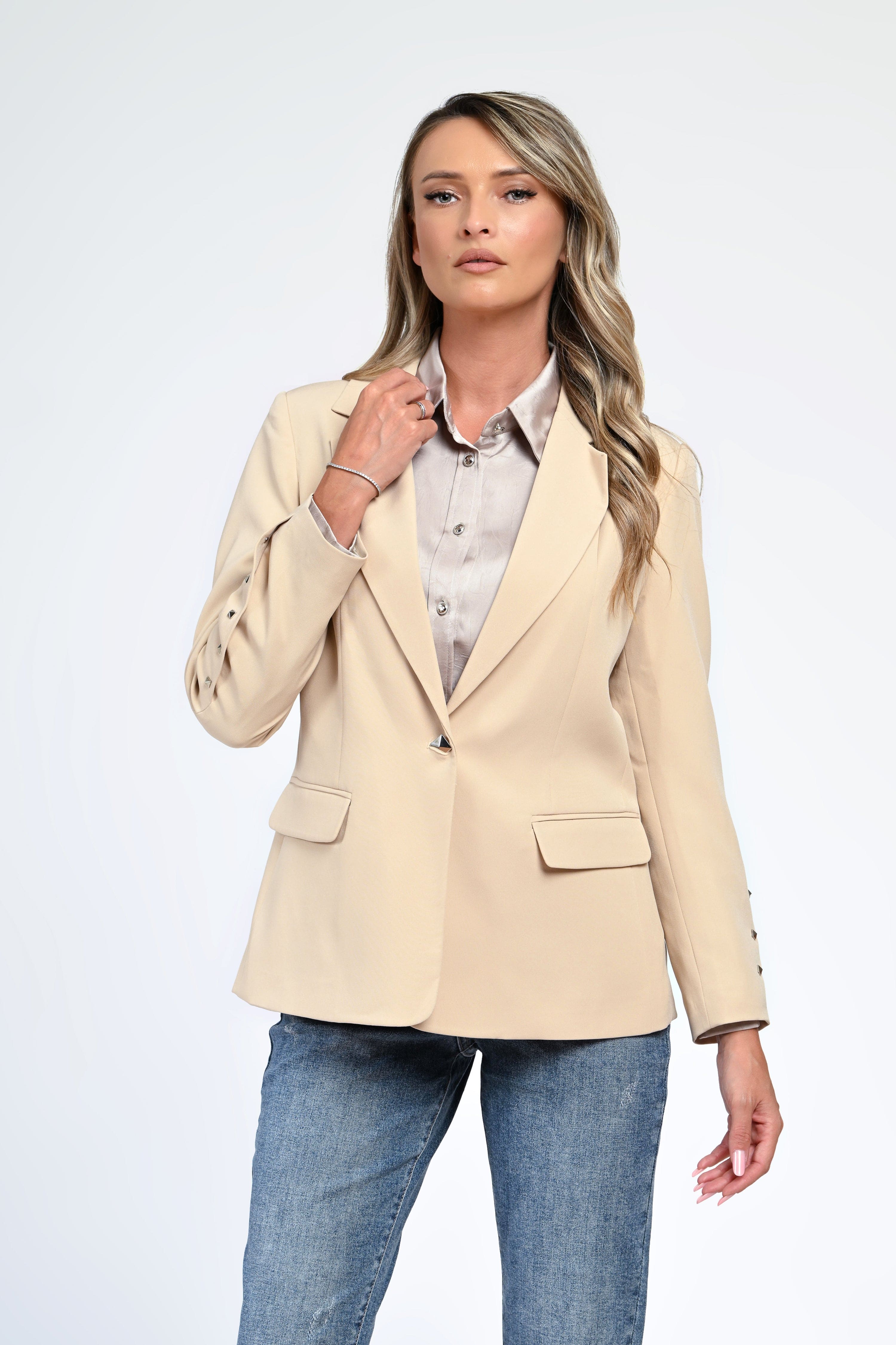 Sacou elegant Mona este un model elegant, într-o nuanță neutră de bej, cu croială cambrată ce conferă un aspect rafinat și feminin. Are rever clasic, închidere cu un singur nasture metalic și mâneci lungi decorate cu șir de nasturi pe laterale, detaliu ce adaugă un plus de stil. Buzunarele cu clapetă sunt decorative, nefuncționale, iar interiorul este complet căptușit, oferind confort și o așezare impecabilă pe corp. Un sacou versatil, potrivit atât pentru birou, cât și pentru ținute smart-casual.